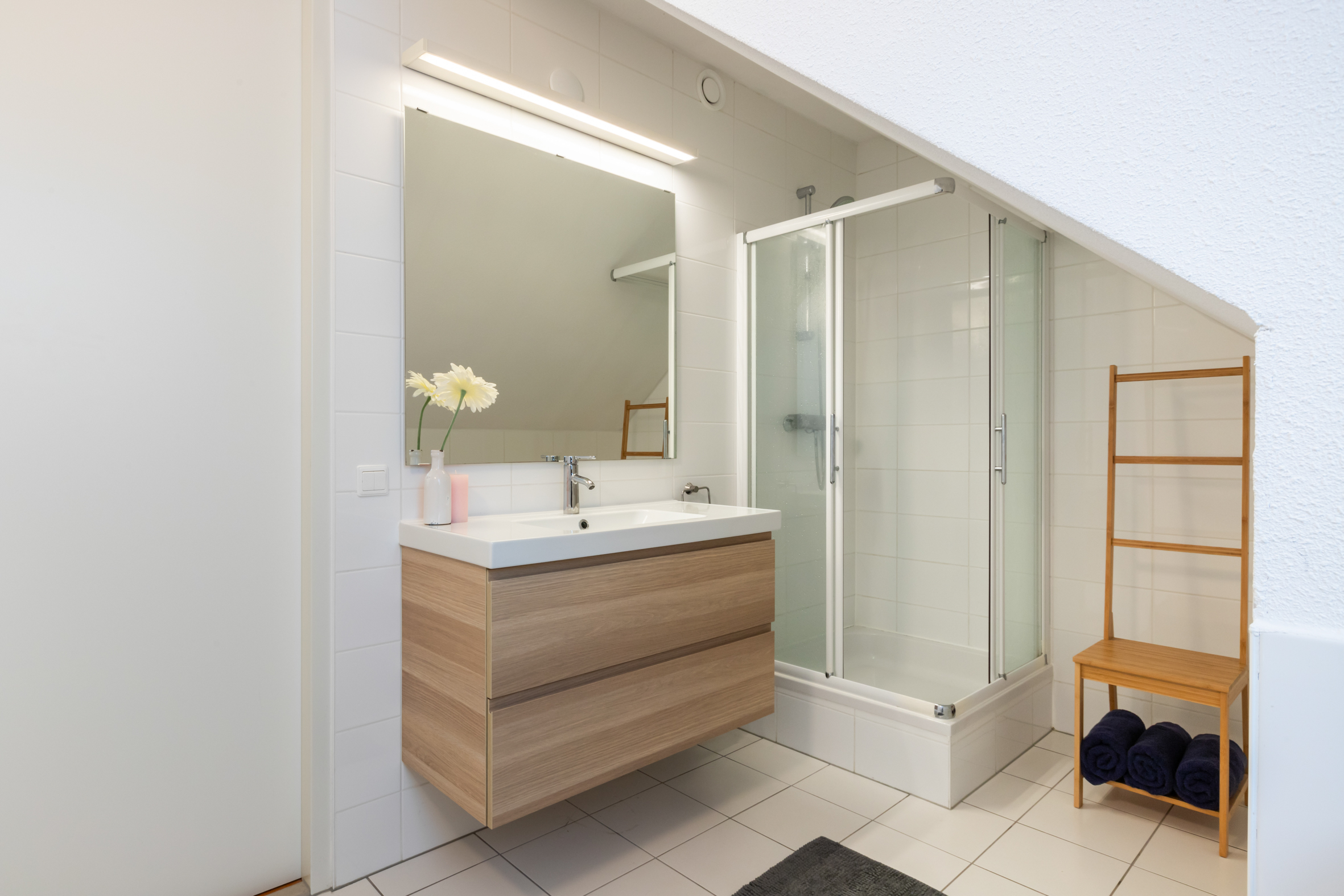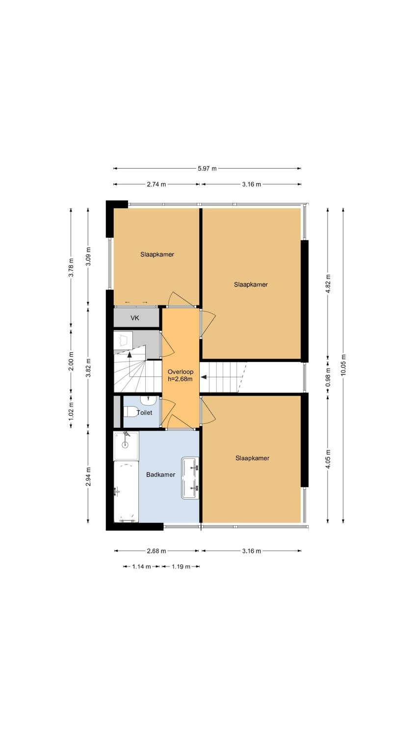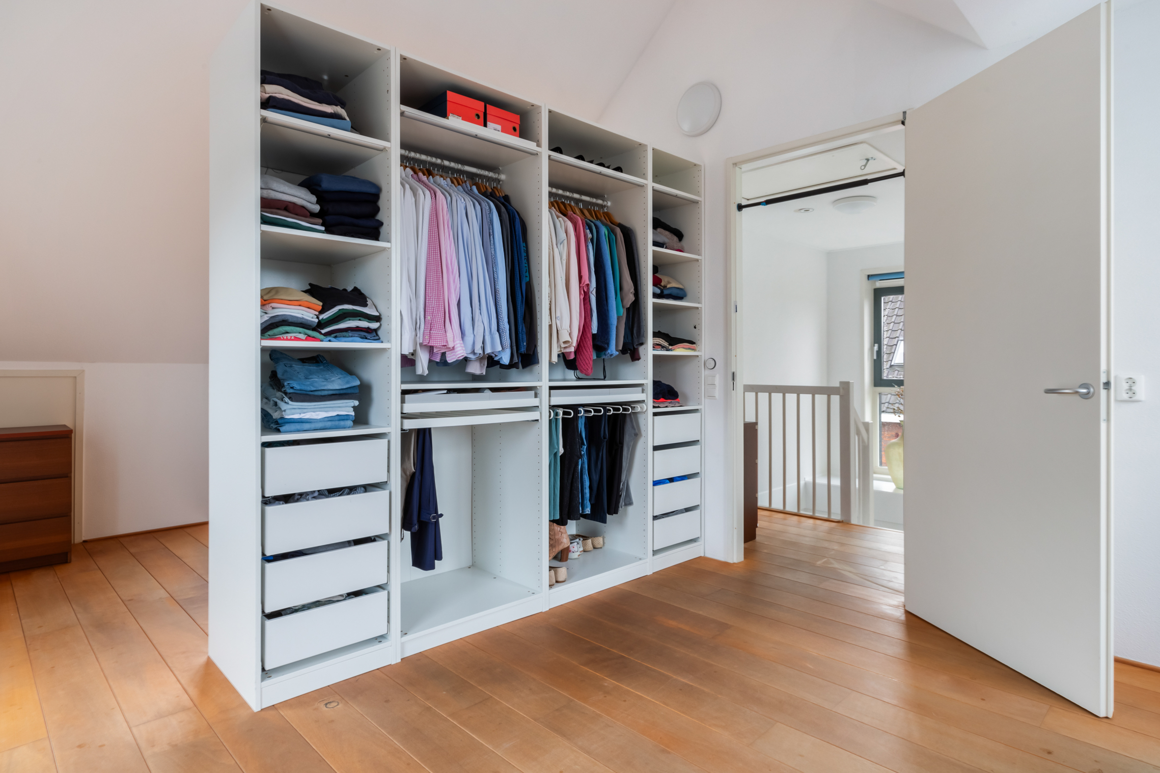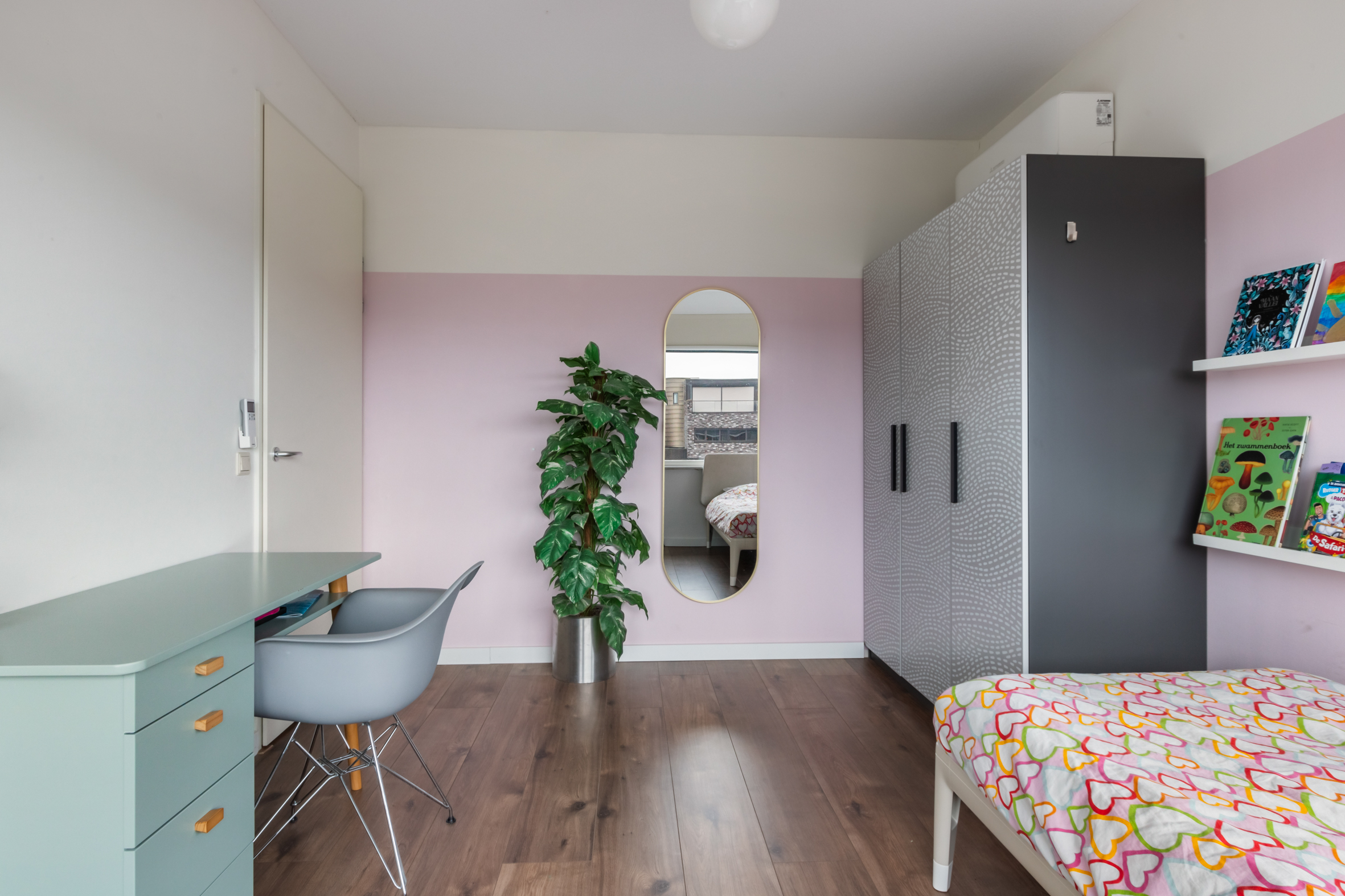 2e verdieping: overloop met zijraam en een luik met vlizotrap naar de vliering. Heel fijne, grote slaapkamer met hoge nok, dakkapellen aan voor- en achterzijde en de mogelijkheid tot het realiseren van twee kamers. Tweede badkamer met een douchecabine, wastafel met meubel, toilet en dakkapel. Aparte cv-/bergruimte met de unit van de mechanische ventilatie en omvormer voor de zonnepanelen.