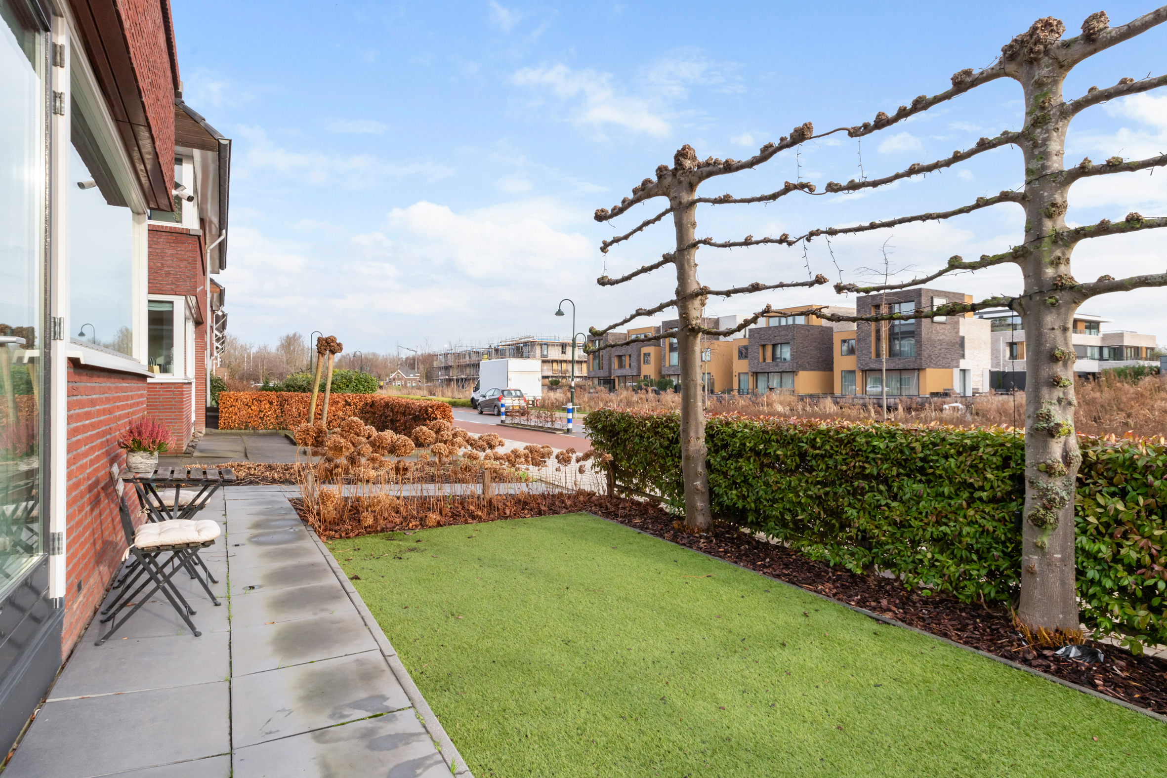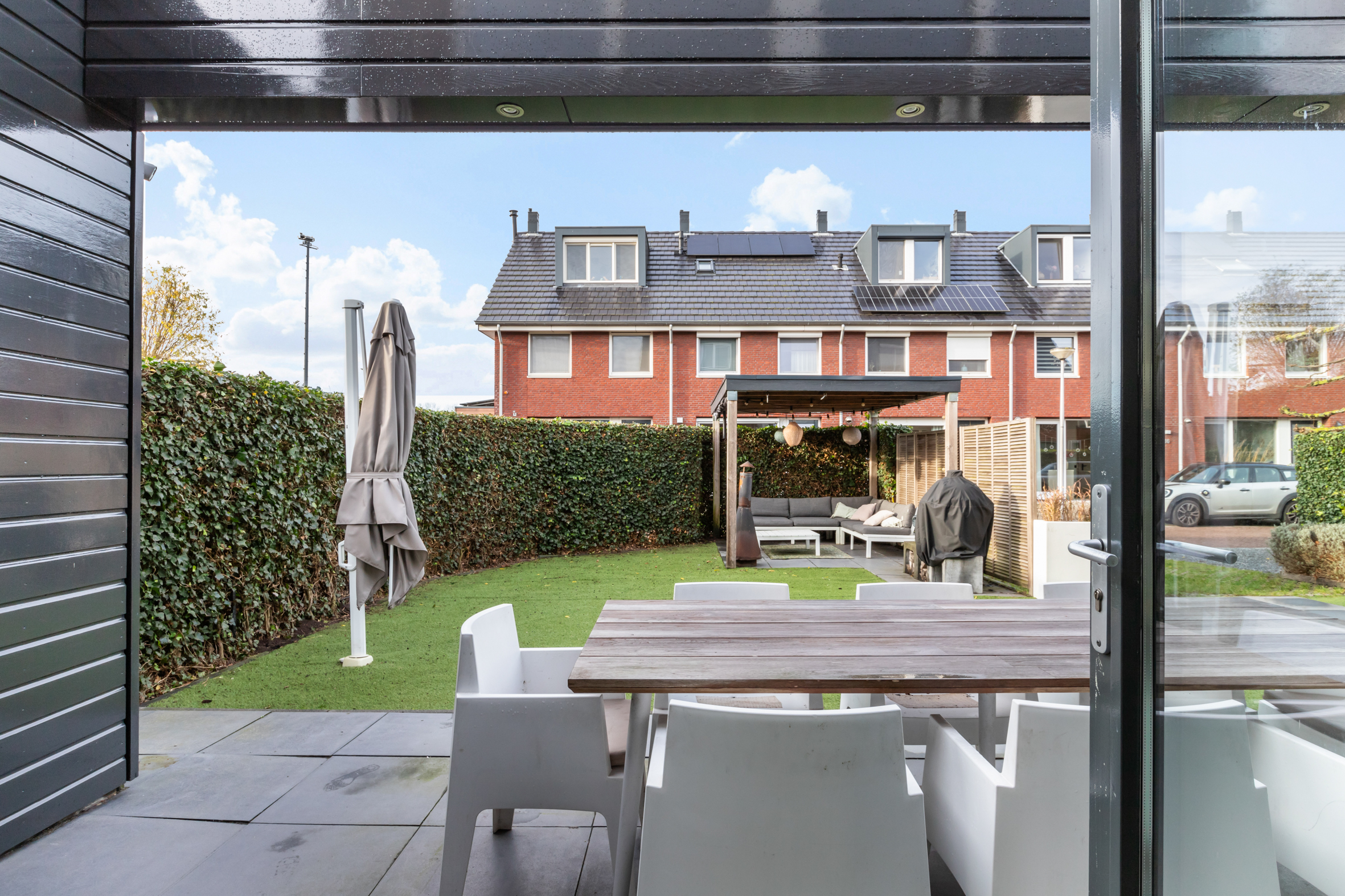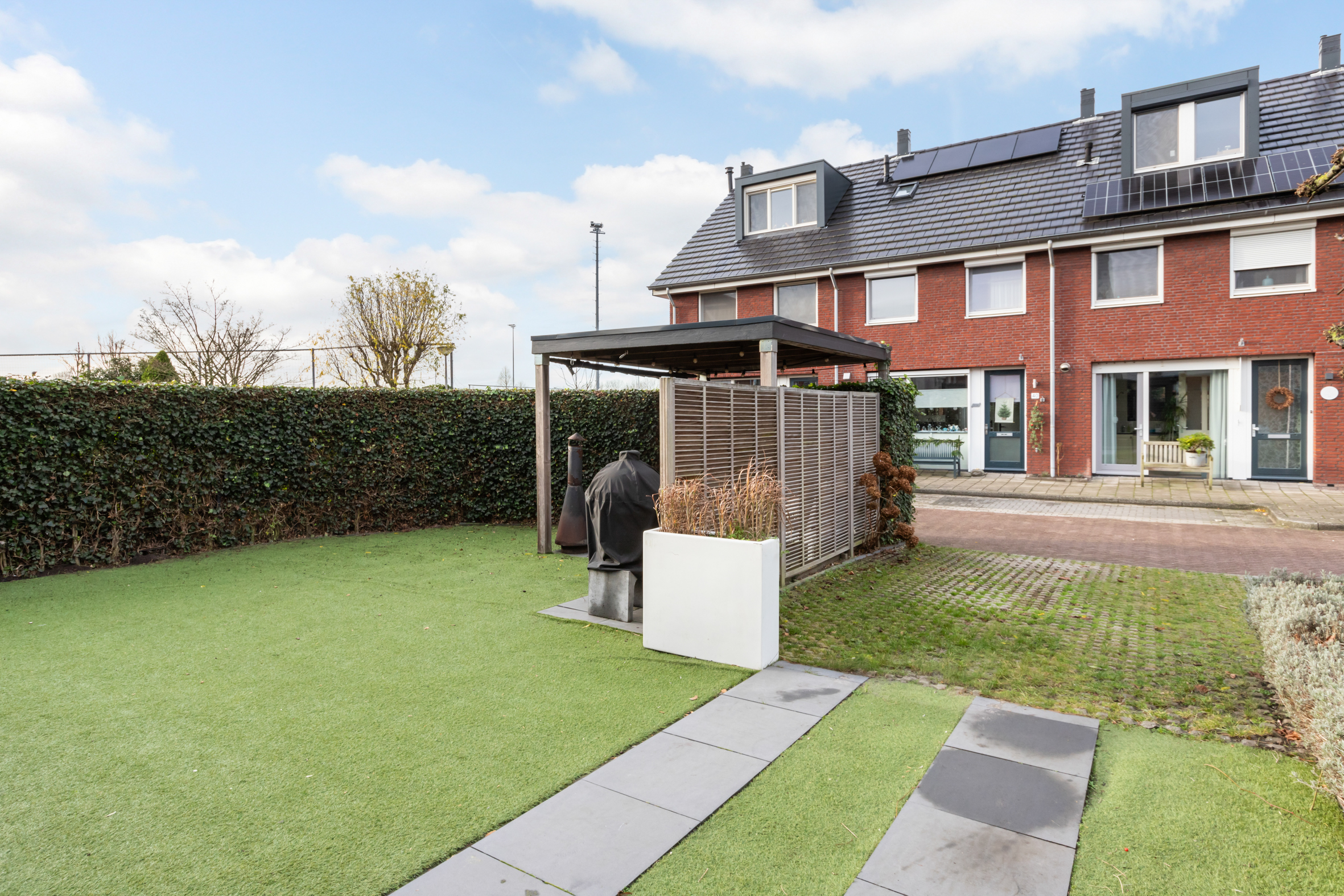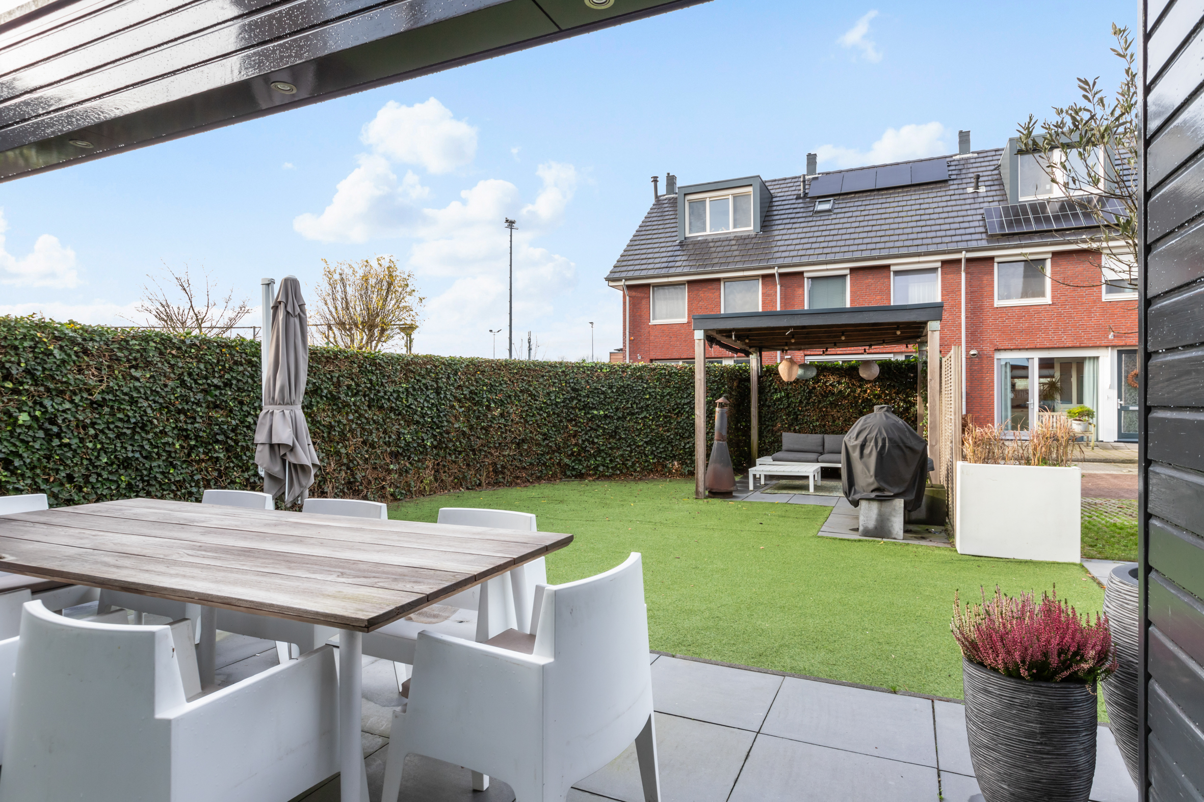De zonnige achtertuin is gelegen op het westen en beschikt over een groot terras en een sfeervolle overkapping. De zij- en voortuin dragen bij aan het vrije gevoel rondom de woning. Voor de deur bevindt zich de steiger met aanlegplaats voor een boot. Vanaf hier vaar je direct naar de Reeuwijkse Plassen.