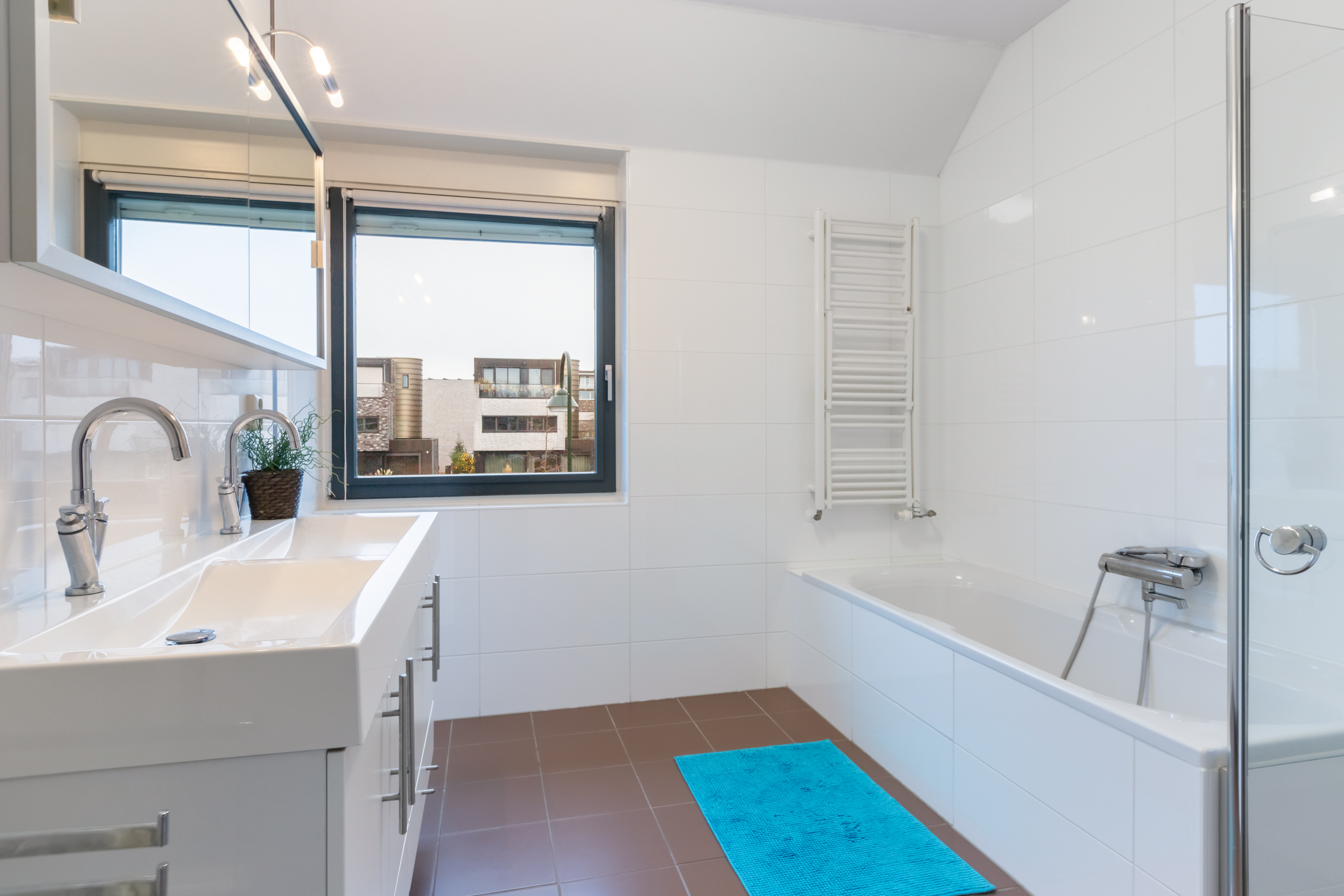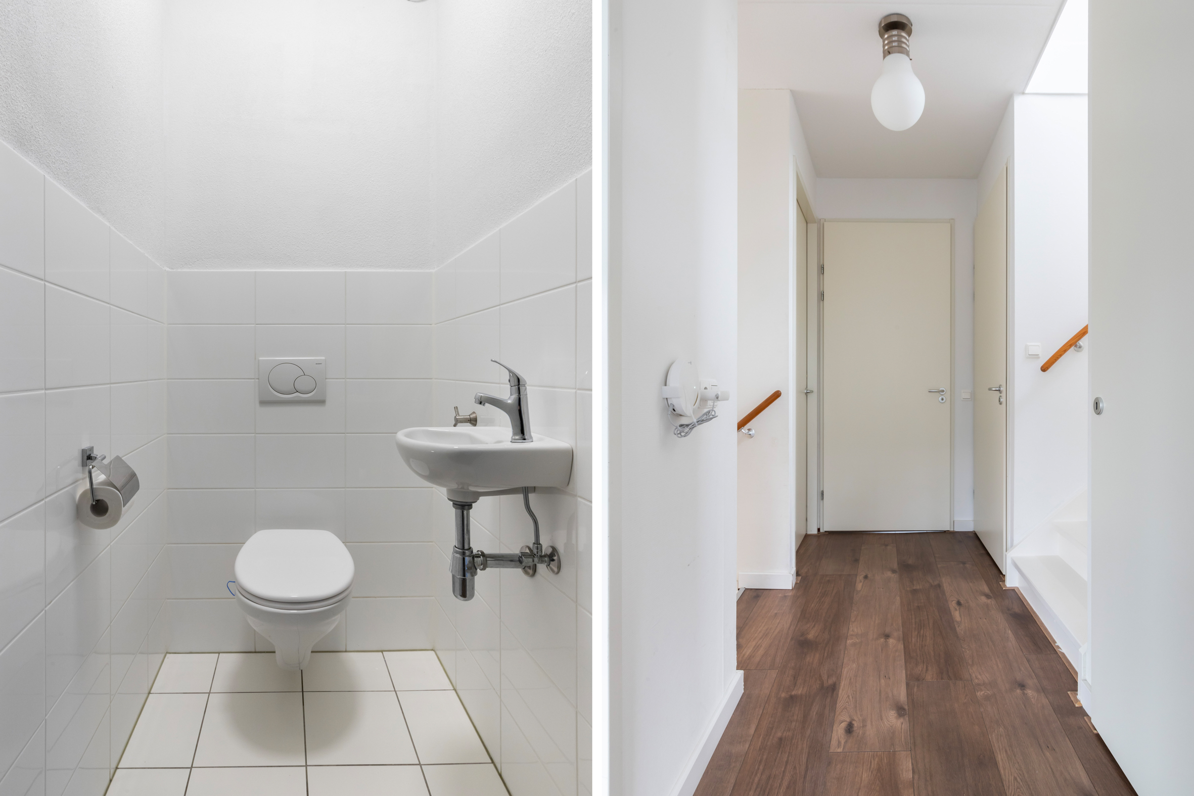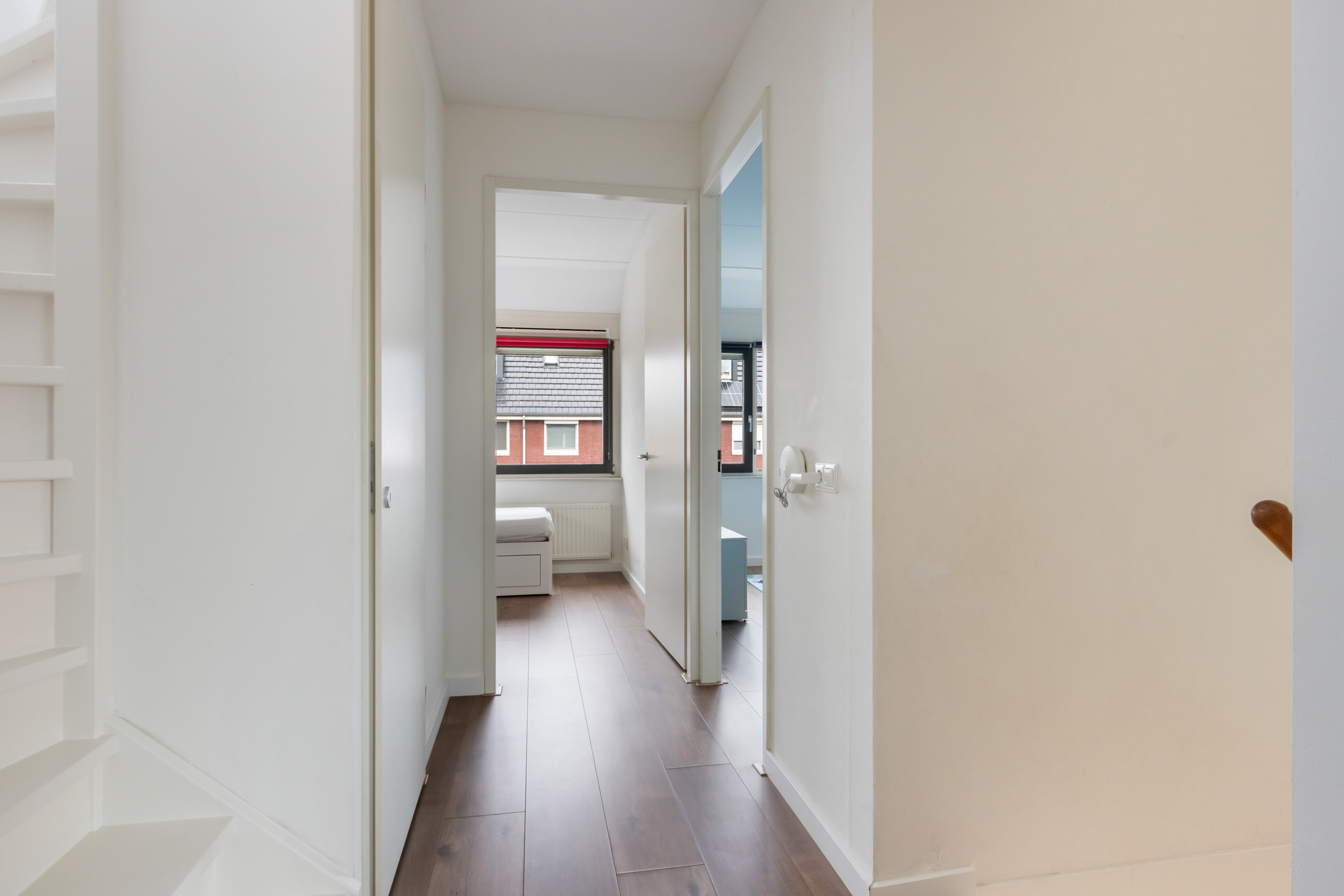 1e verdieping: overloop met wasruimte en separaat toilet. Slaapkamer voorzijde met zijraam en twee slaapkamers aan de achterzijde, waarvan één met een vaste kast. Luxe badkamer voorzien van een ligbad, douche, dubbele wastafel met meubel, elektrische vloerverwarming en een raam aan de voorzijde van het huis.