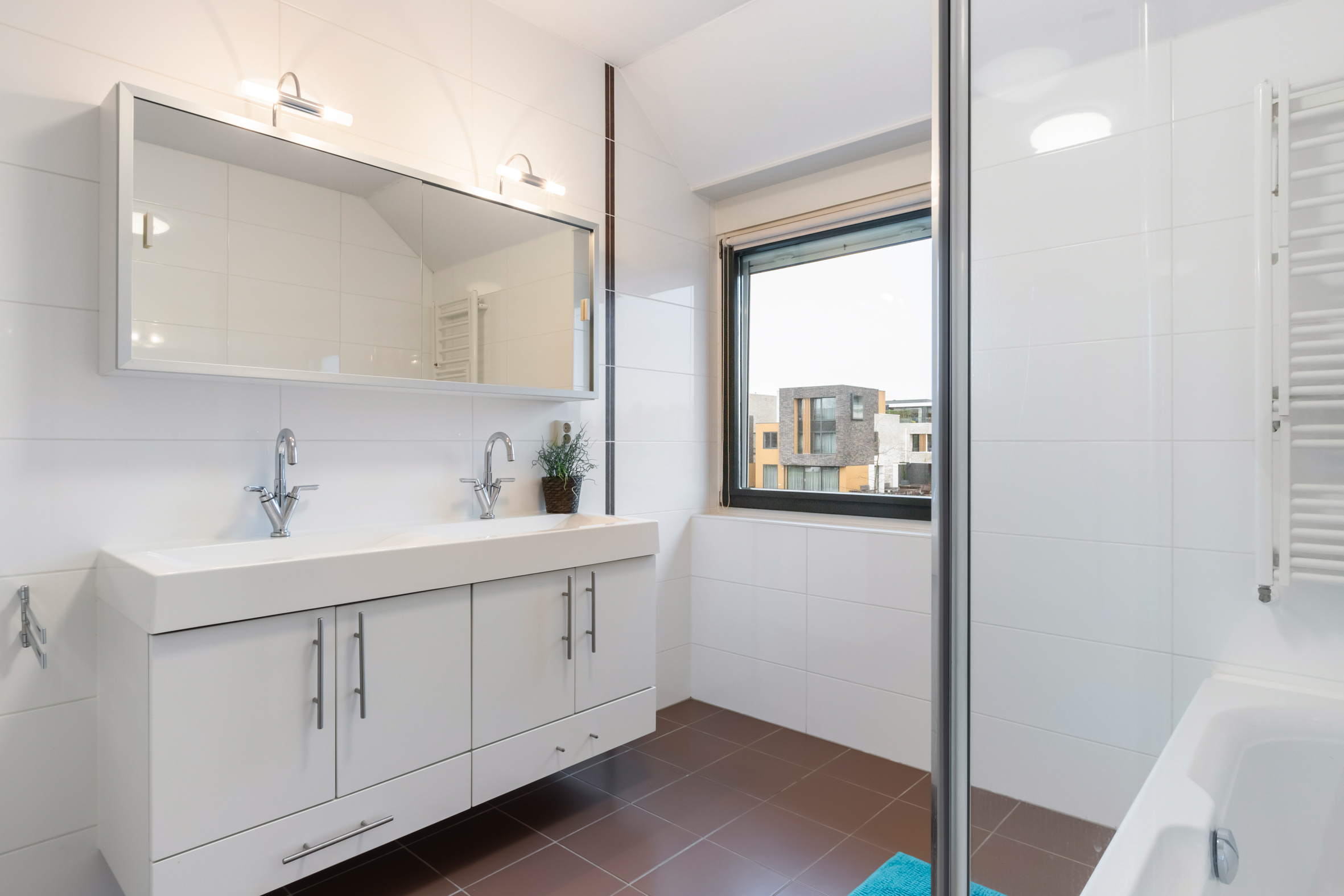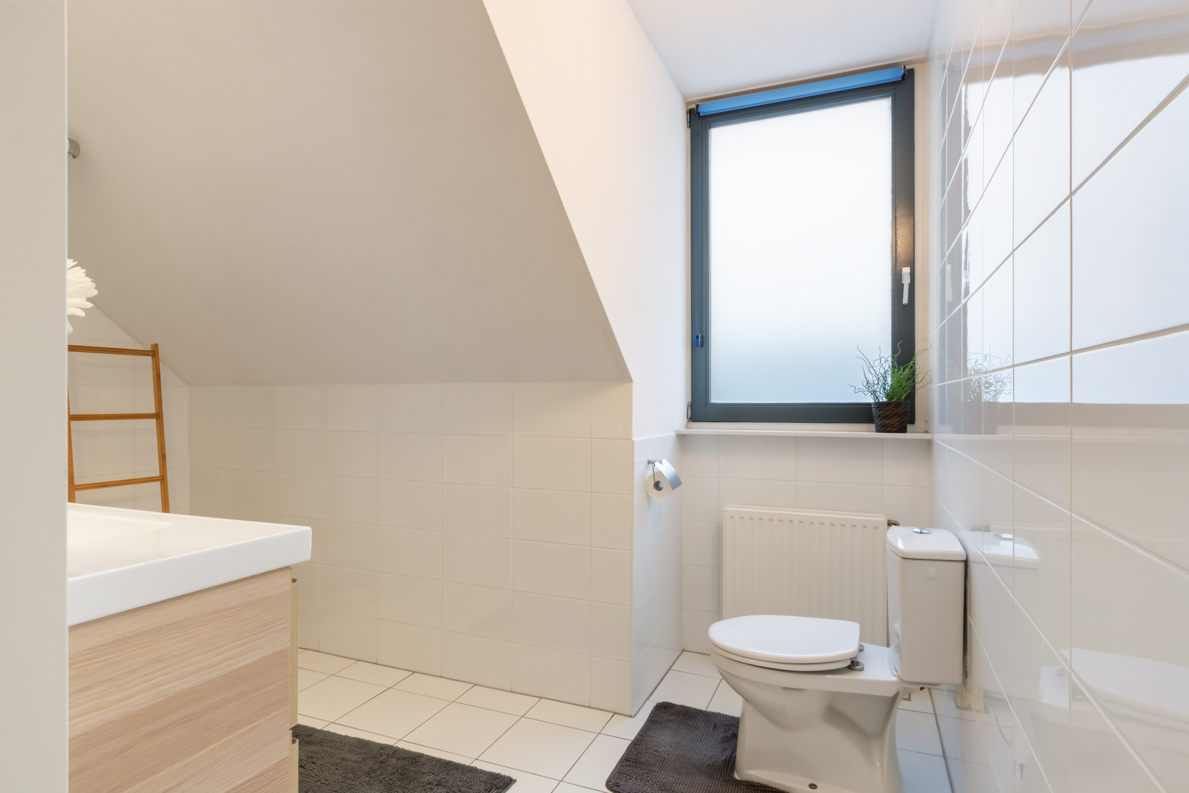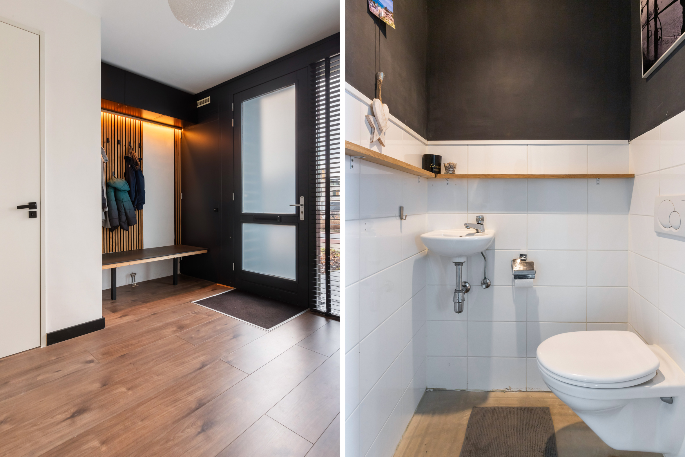 1e verdieping: overloop met wasruimte en separaat toilet. Slaapkamer voorzijde met zijraam en twee slaapkamers aan de achterzijde, waarvan één met een vaste kast. Luxe badkamer voorzien van een ligbad, douche, dubbele wastafel met meubel, elektrische vloerverwarming en een raam aan de voorzijde van het huis.