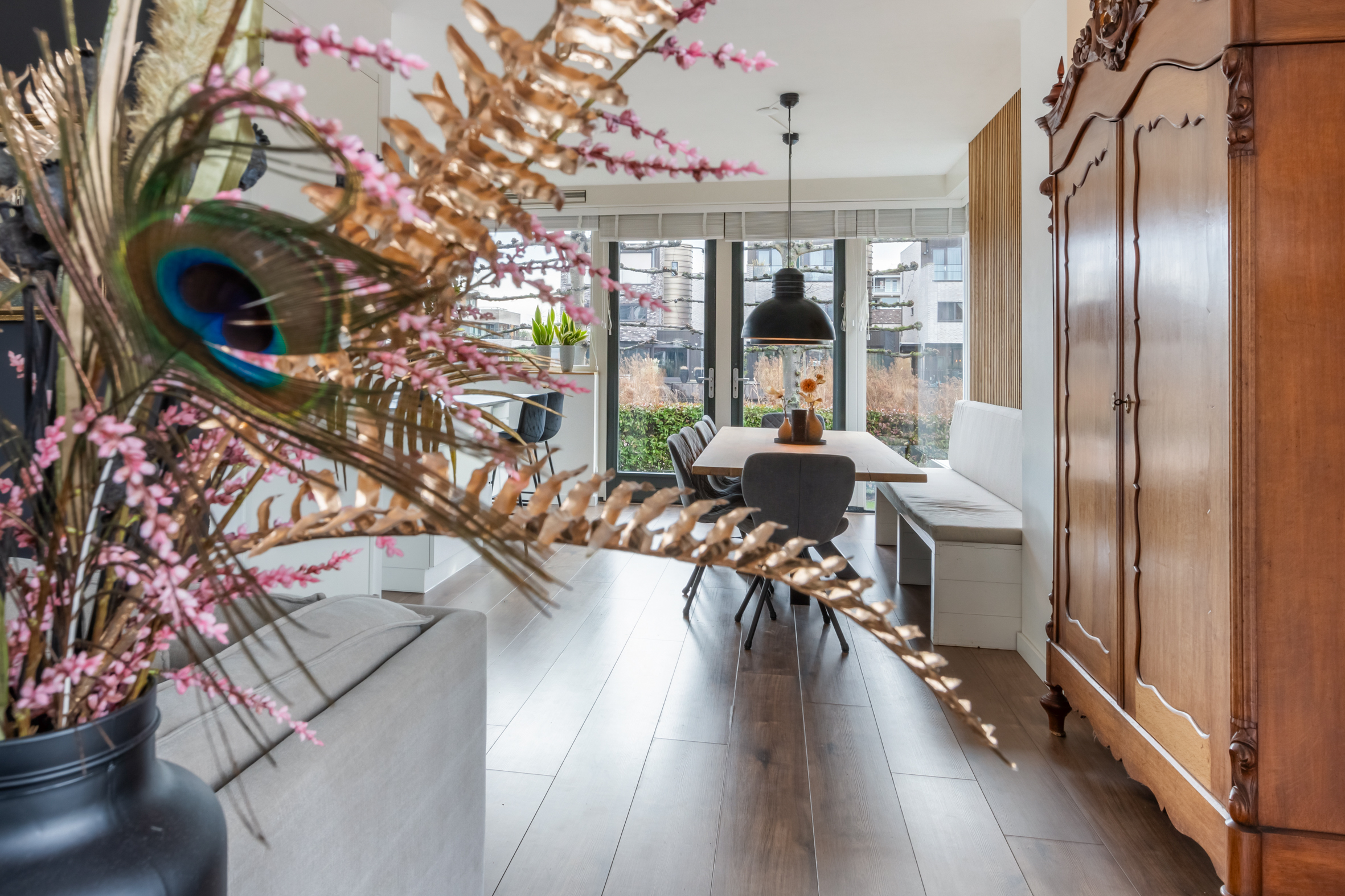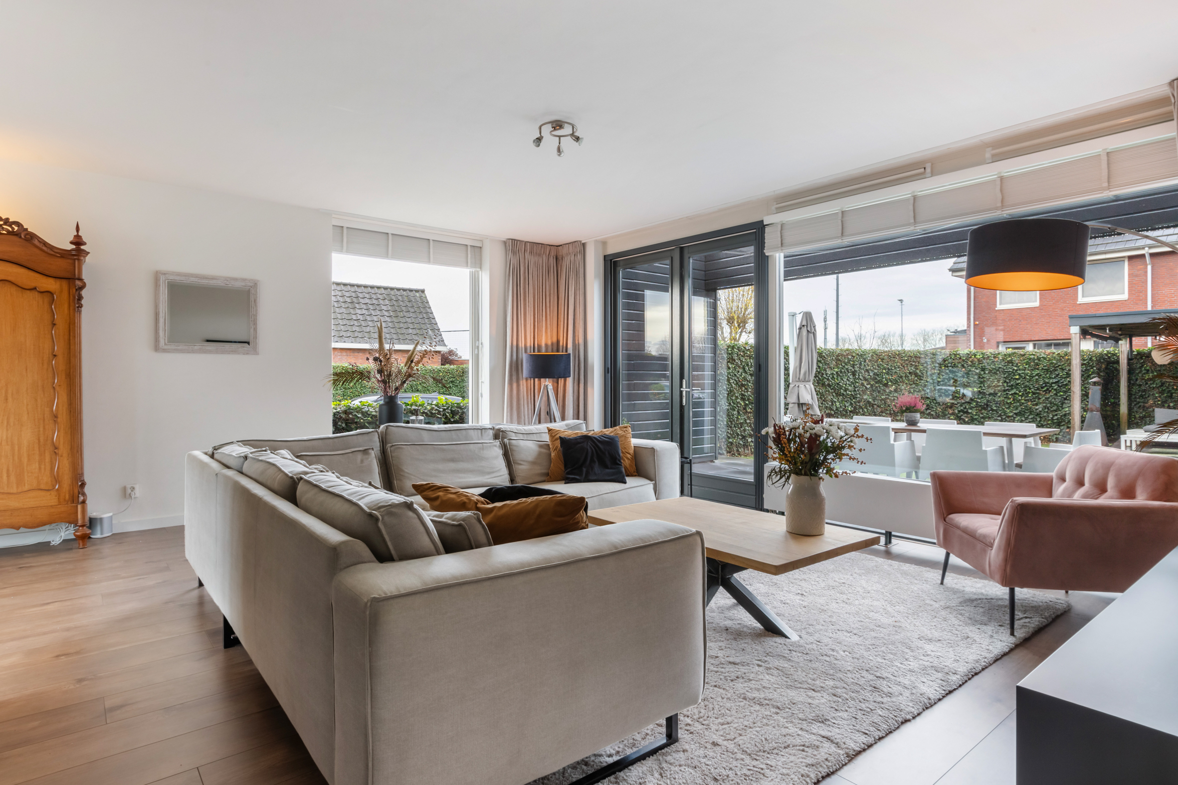 *op de begane grond zijn brede delen eikenlook laminaat aangebracht. Op de 2e verdieping liggen massief eiken vloerdelen.