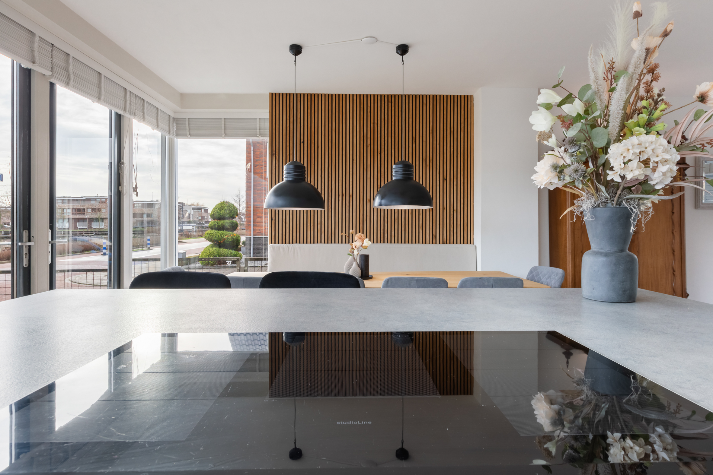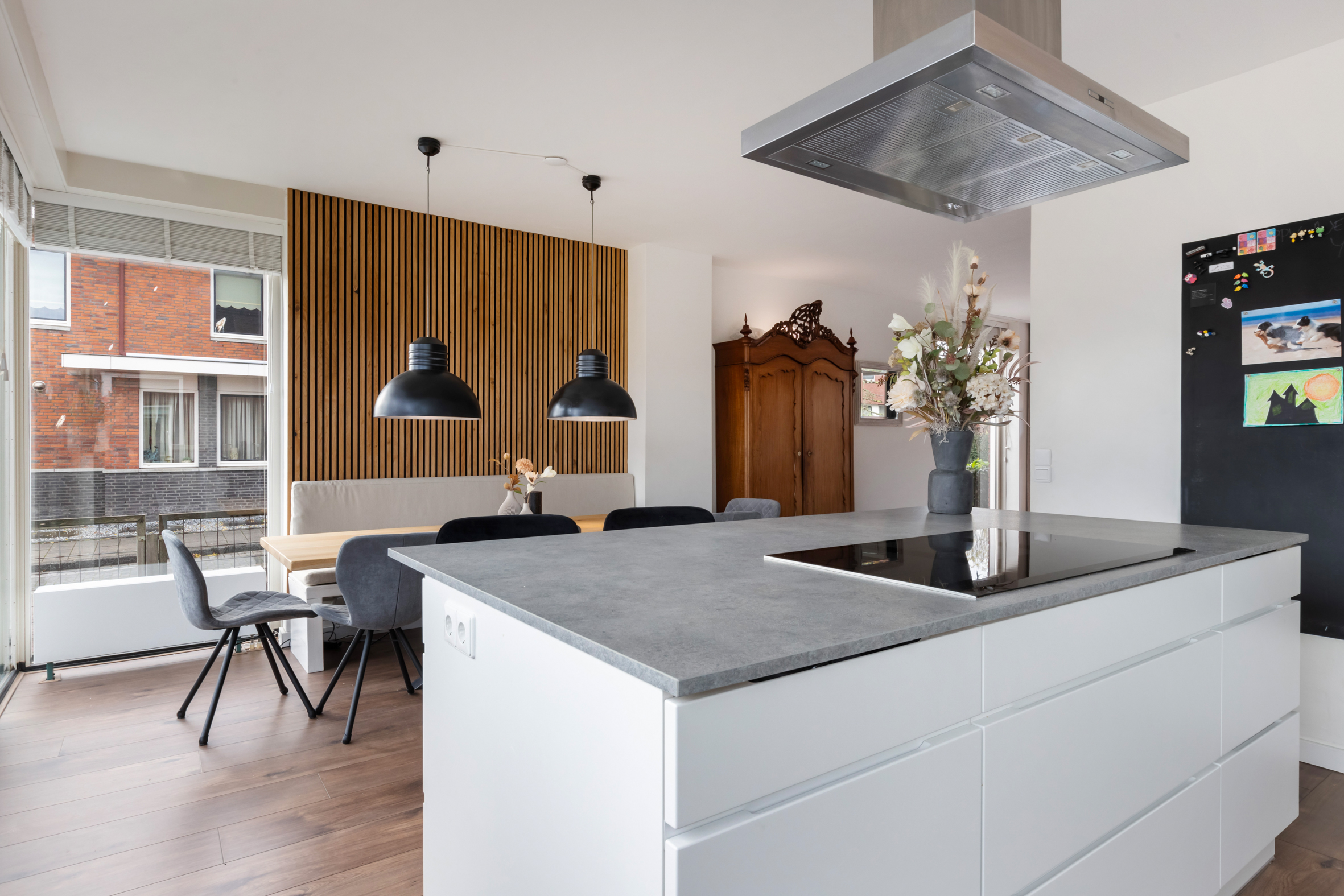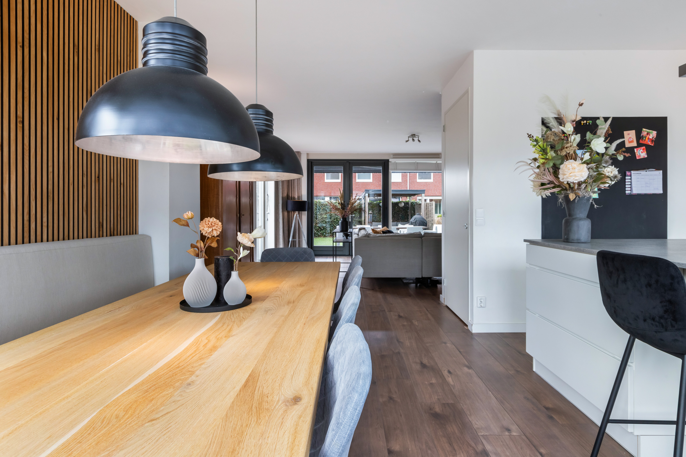 *De gezellige woonkeuken heeft moderne akoestische panelen op de wand.