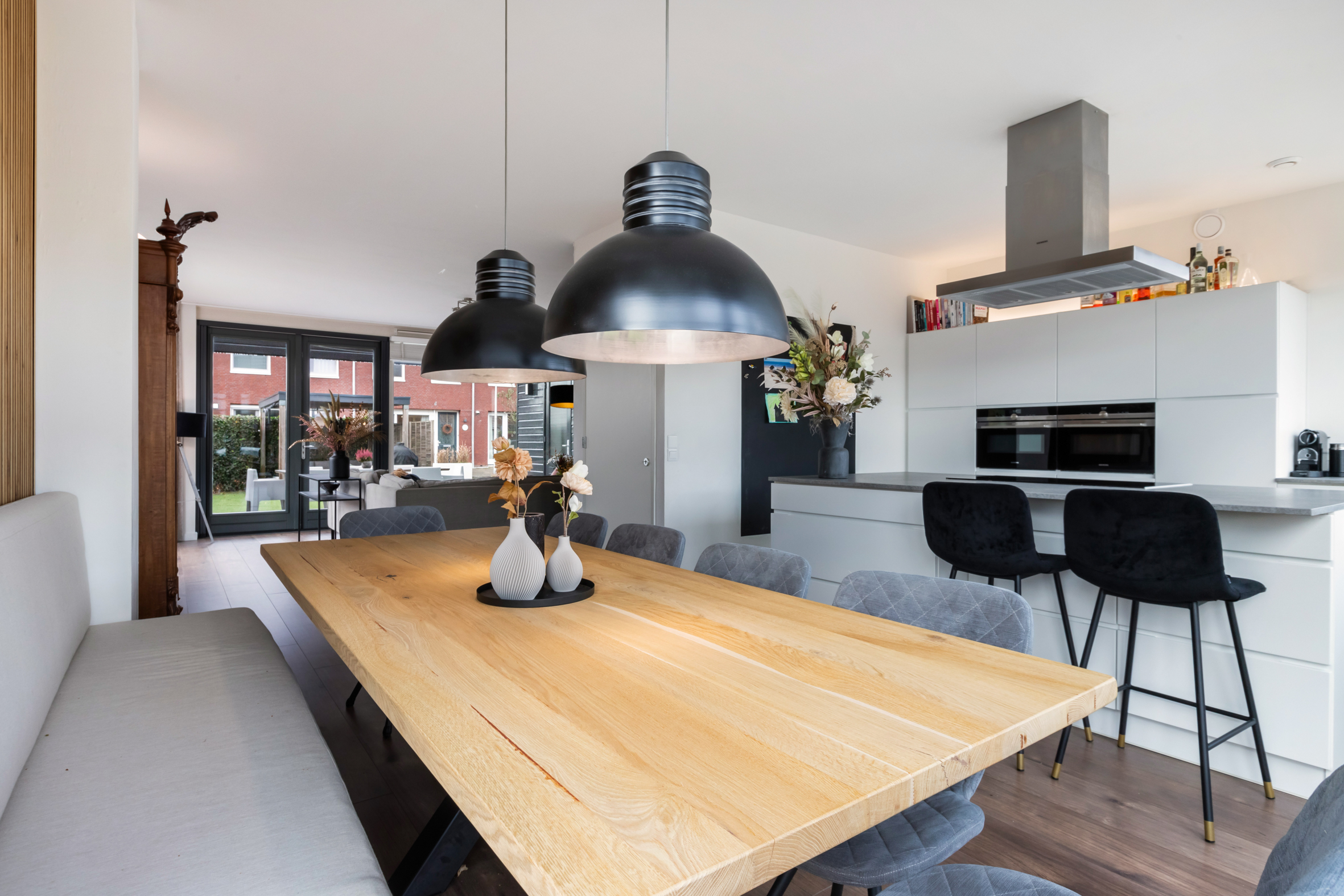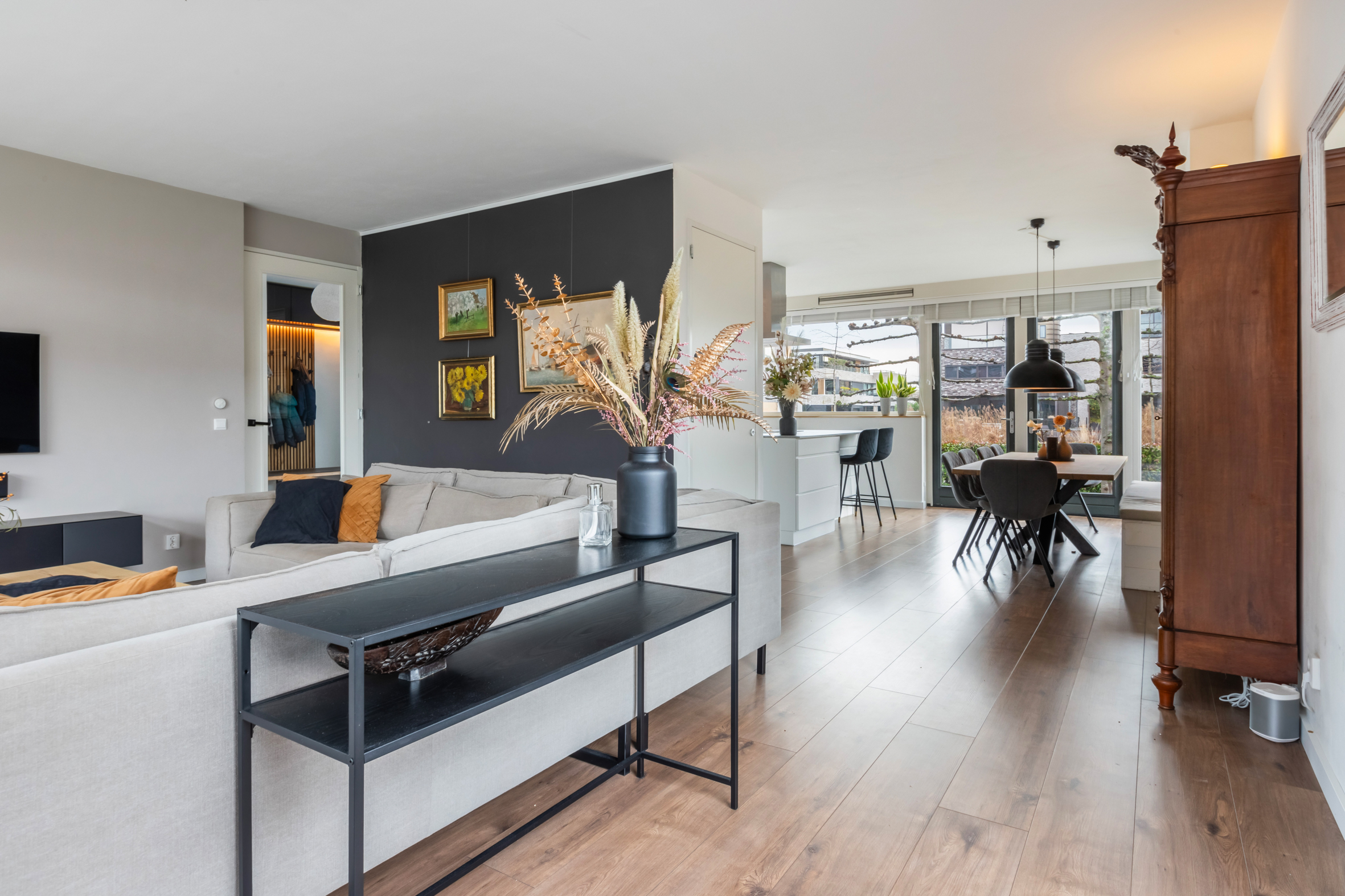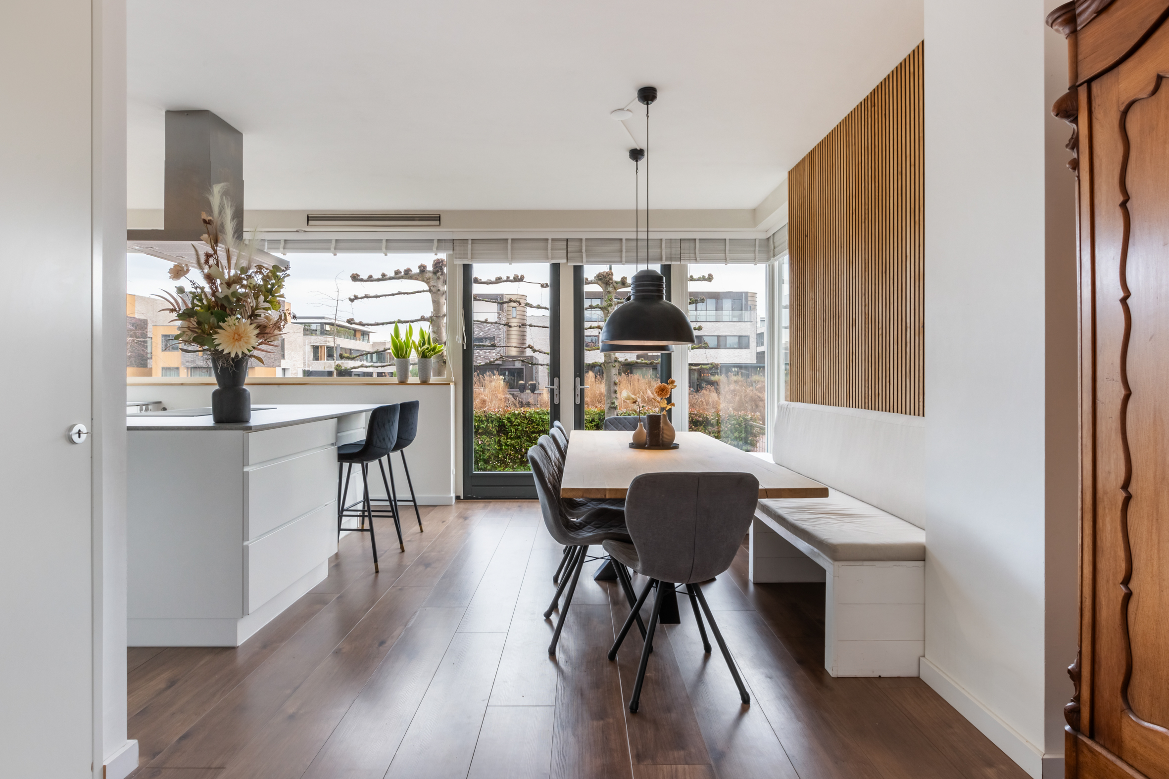 *De gezellige woonkeuken heeft moderne akoestische panelen op de wand.