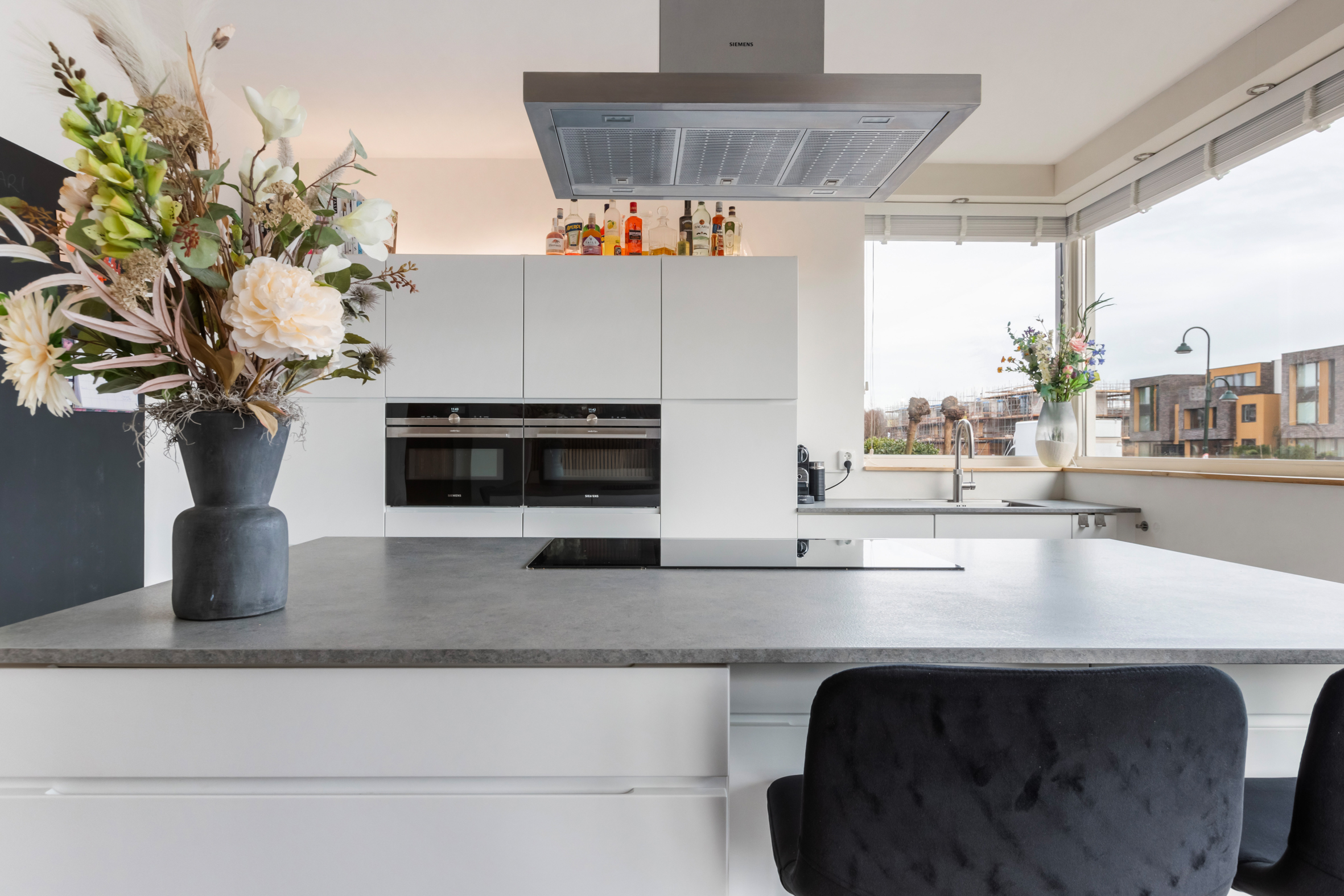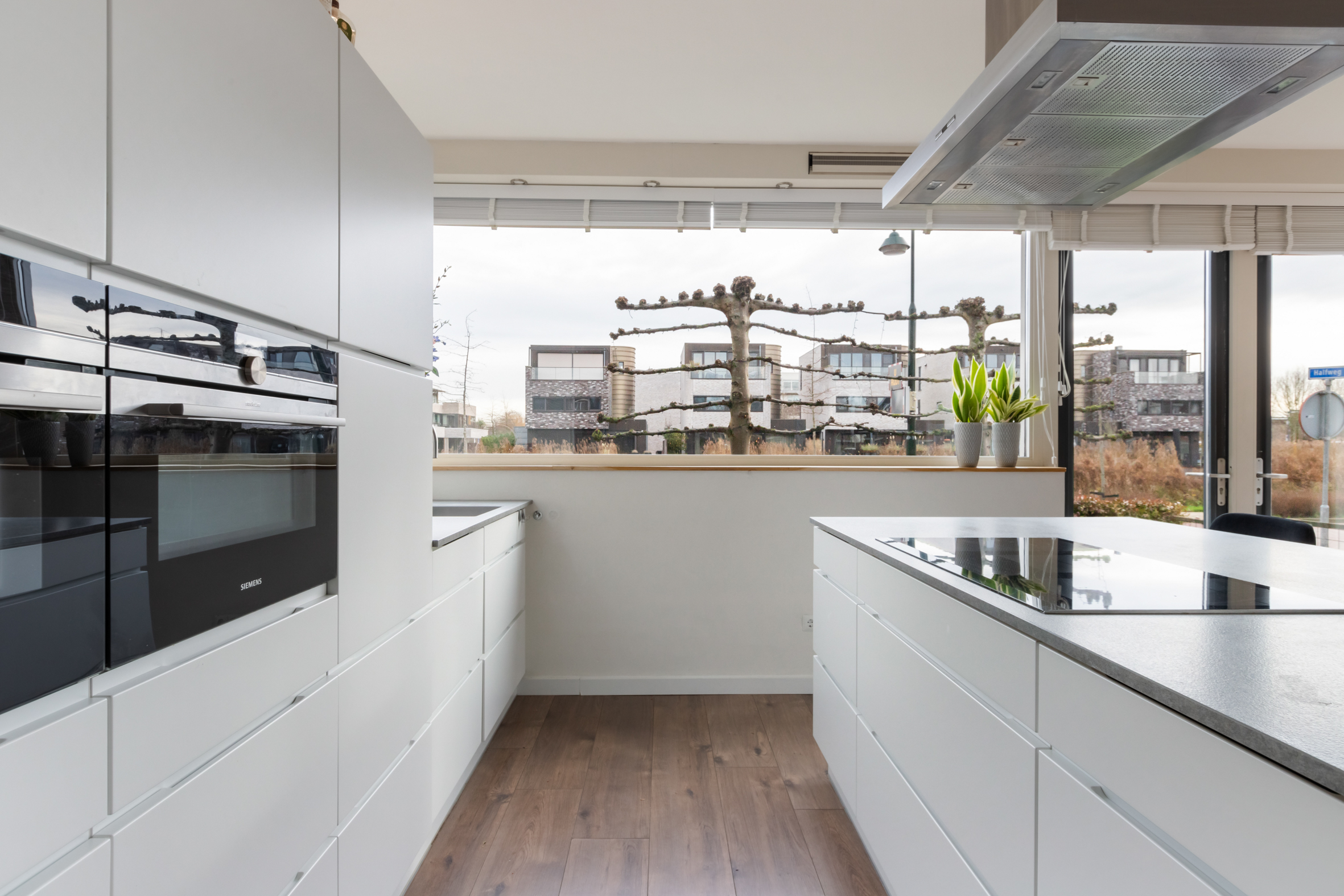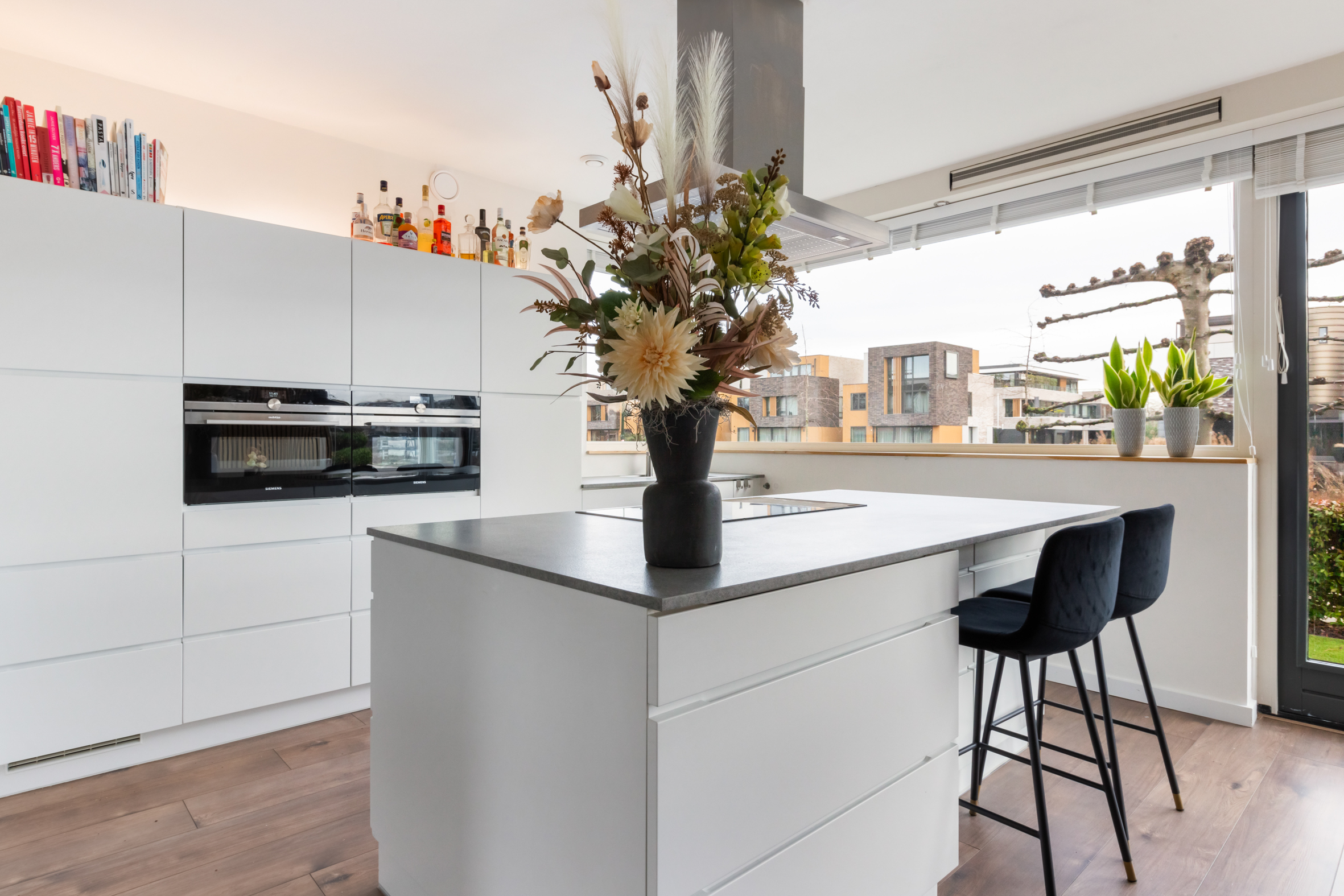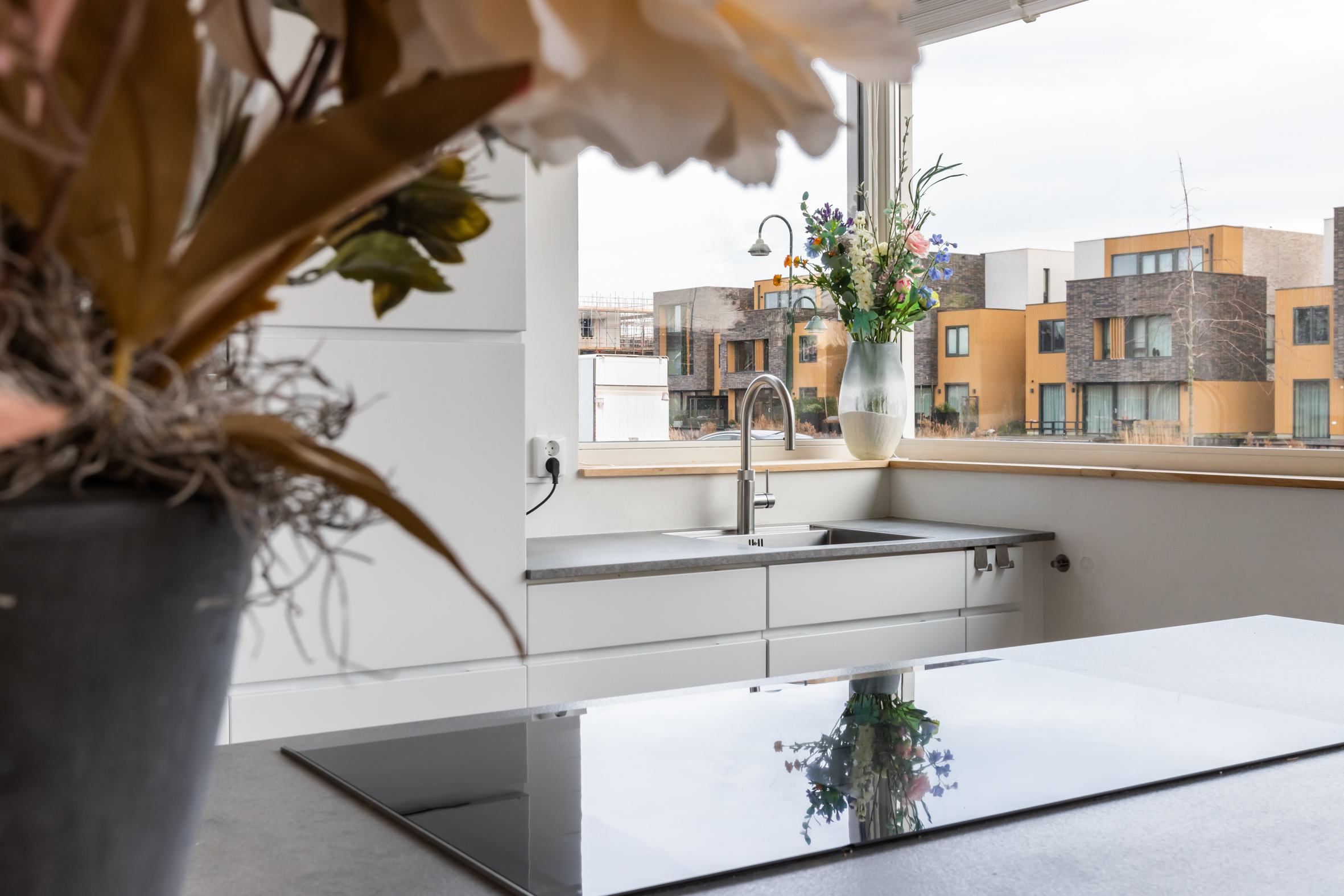 begane grond: entree, ruime hal met garderobe, meterkast en toilet met fontein. Vanuit de hal toegang tot de ruime, L-vormige woonkamer met grote ramen tot op de grond en openslaande deuren naar de achtertuin. Luxe, moderne woonkeuken met kookeiland voorzien van een inductie kookplaat met afzuigkap, veel bergruimte en diverse inbouwapparatuur, waaronder een grote koelkast en vriezer, 2 combi-magnetrons, een vaatwasser en een rvs spoelbak met Quooker-kraan. De keuken heeft openslaande deuren naar de voortuin en zicht op de Breevaart.