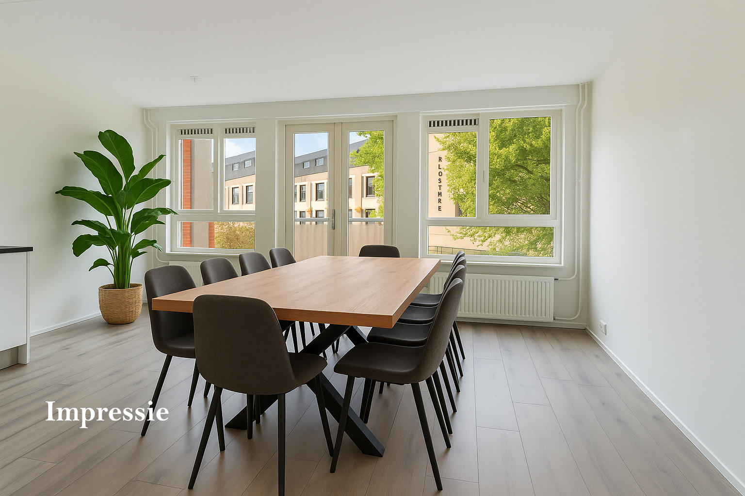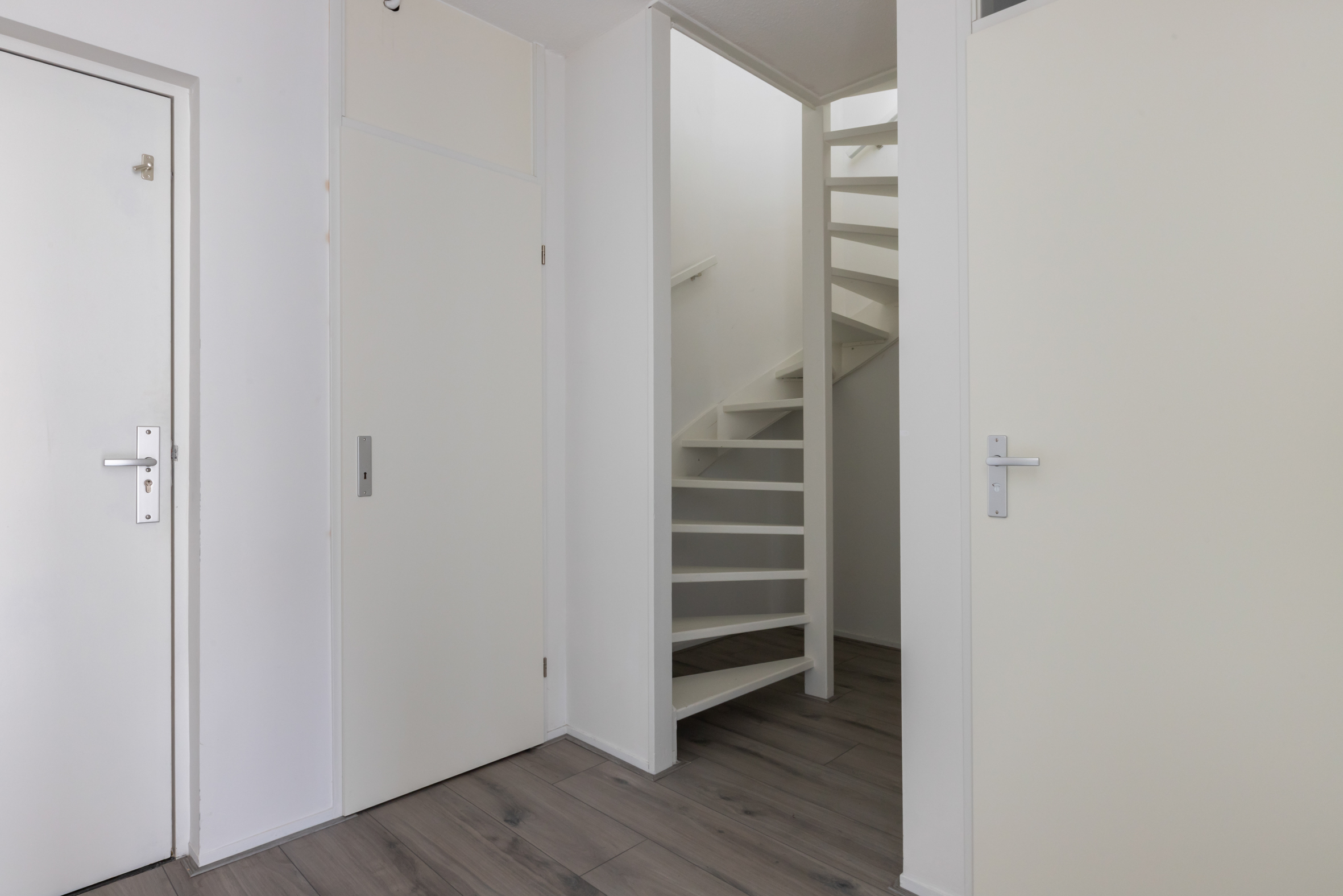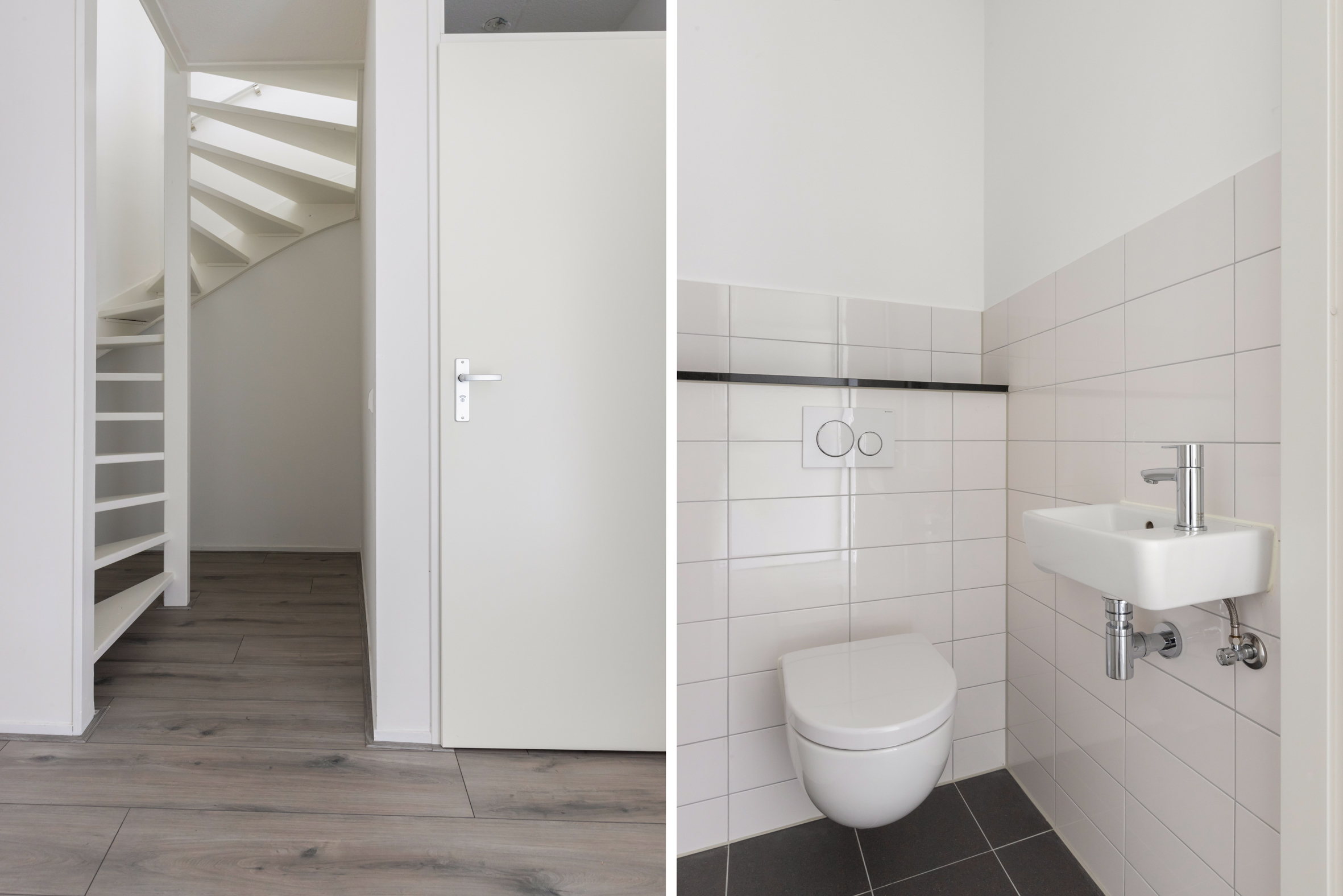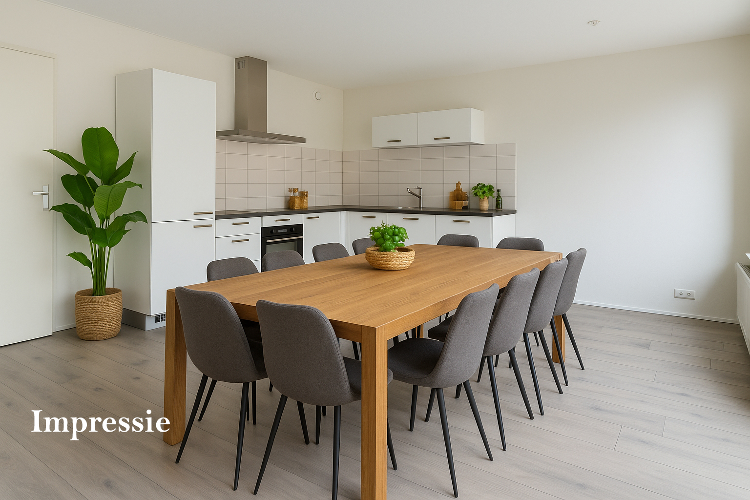 1e verdieping: privé-entree, hal met (hangend) toilet met fontein, garderobe, meterkast, wasmachineaansluiting en trappenhuis. Gezellige, ruime woonkeuken met openslaande deuren en een Frans balkon. Deze luxe keuken (wit kunststof) is voorzien van een L-vormig aanrechtblad met rvs spoelbak, inductie kookplaat, circulatiekap, oven, vaatwasser, koelkast en vriezer.