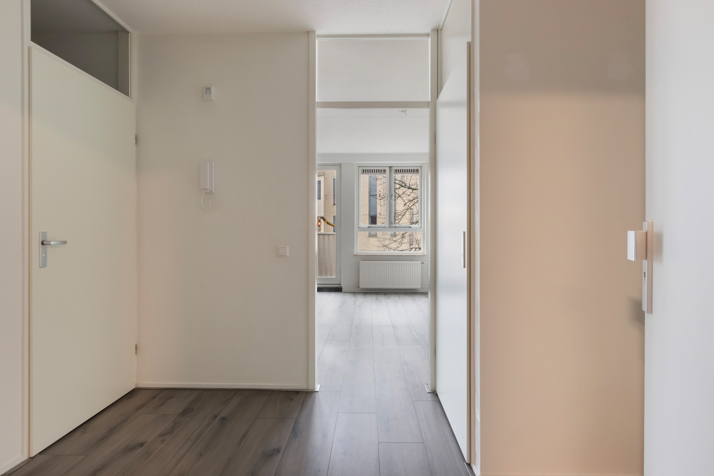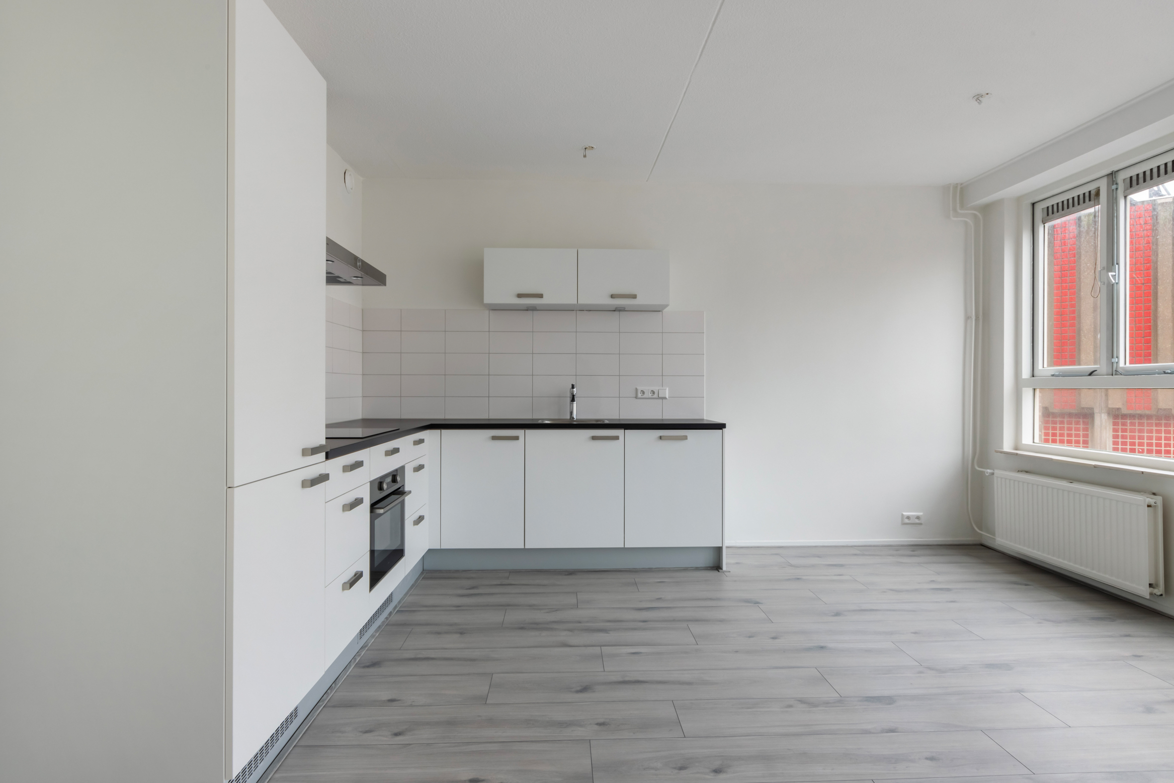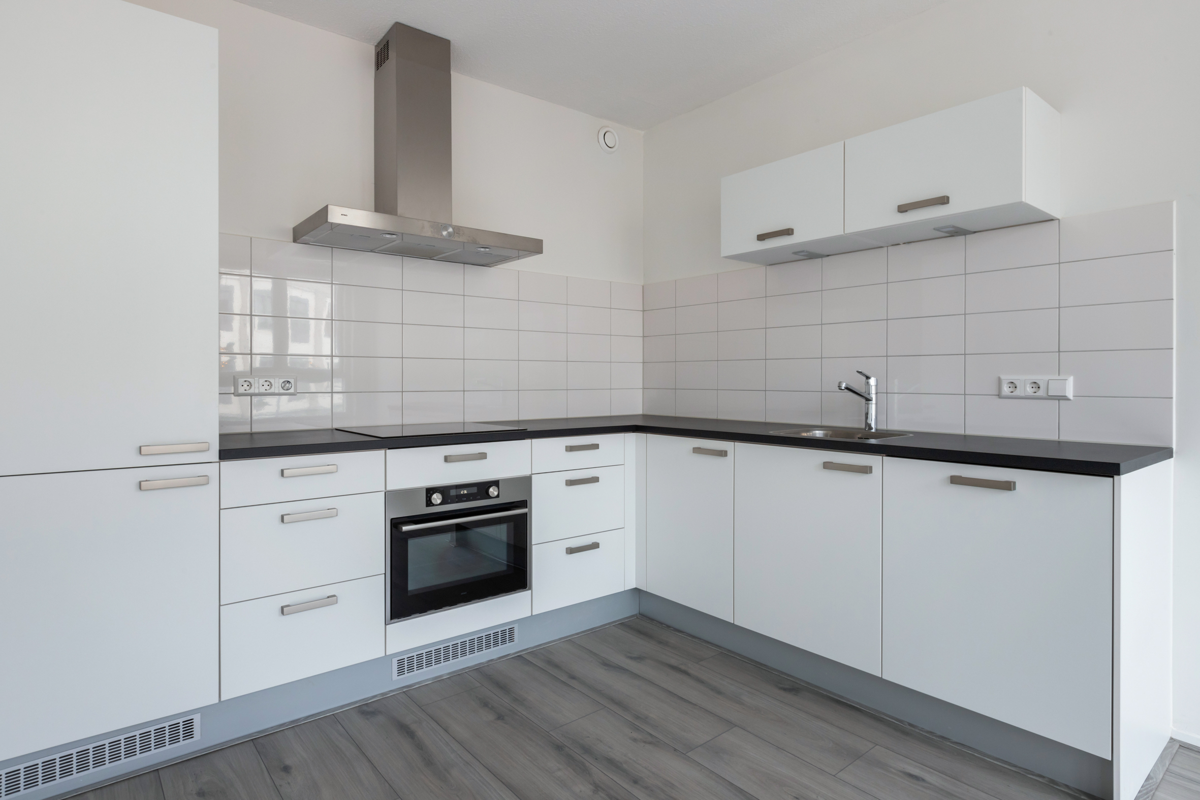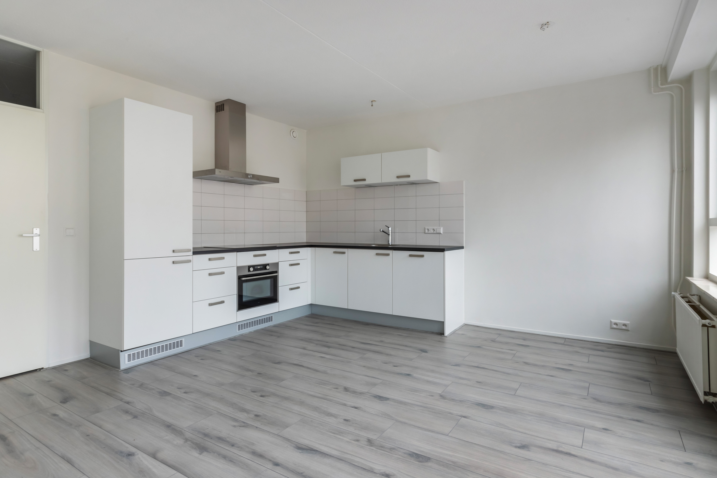 1e verdieping: privé-entree, hal met (hangend) toilet met fontein, garderobe, meterkast, wasmachineaansluiting en trappenhuis. Gezellige, ruime woonkeuken met openslaande deuren en een Frans balkon. Deze luxe keuken (wit kunststof) is voorzien van een L-vormig aanrechtblad met rvs spoelbak, inductie kookplaat, circulatiekap, oven, vaatwasser, koelkast en vriezer.