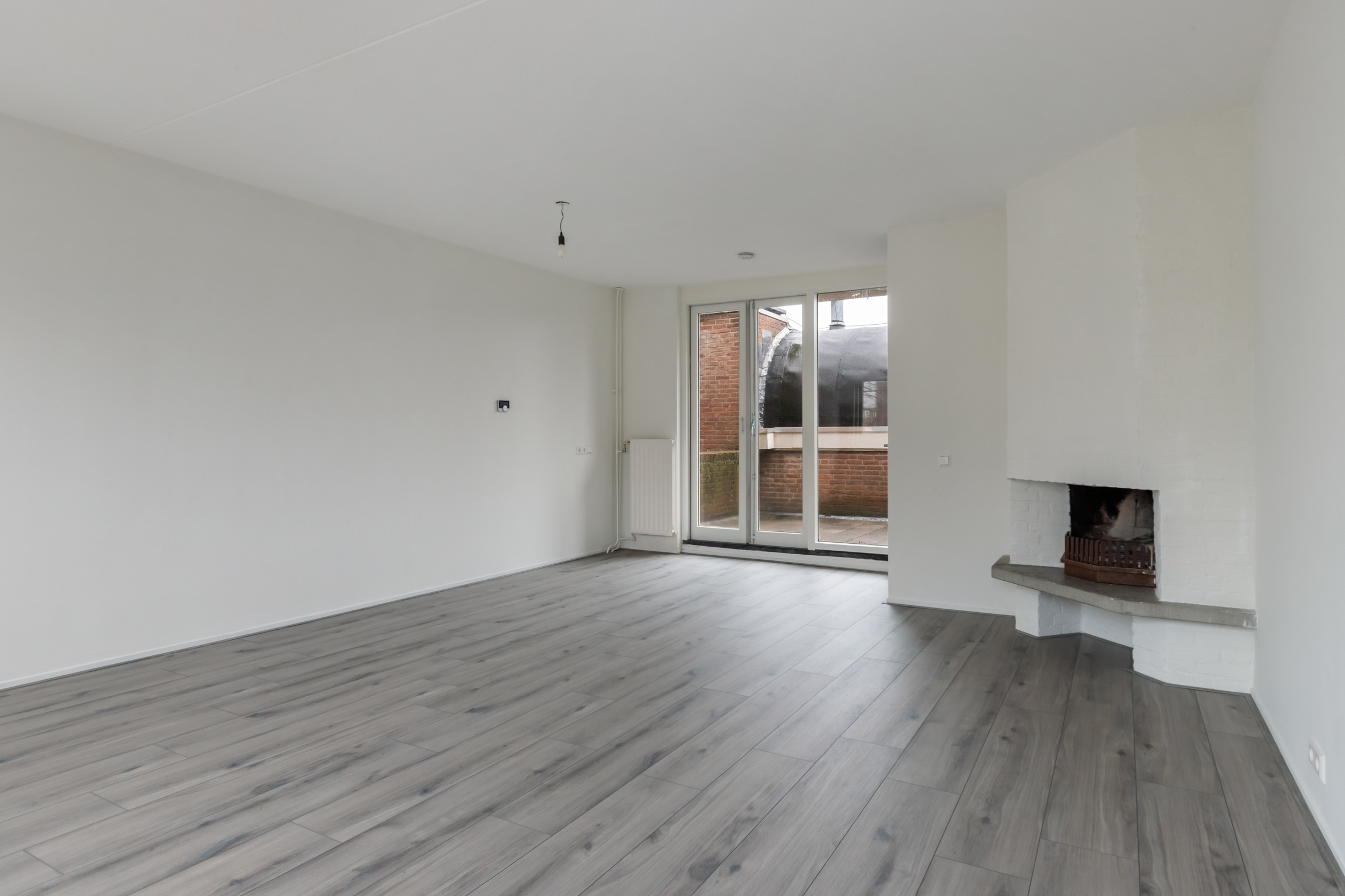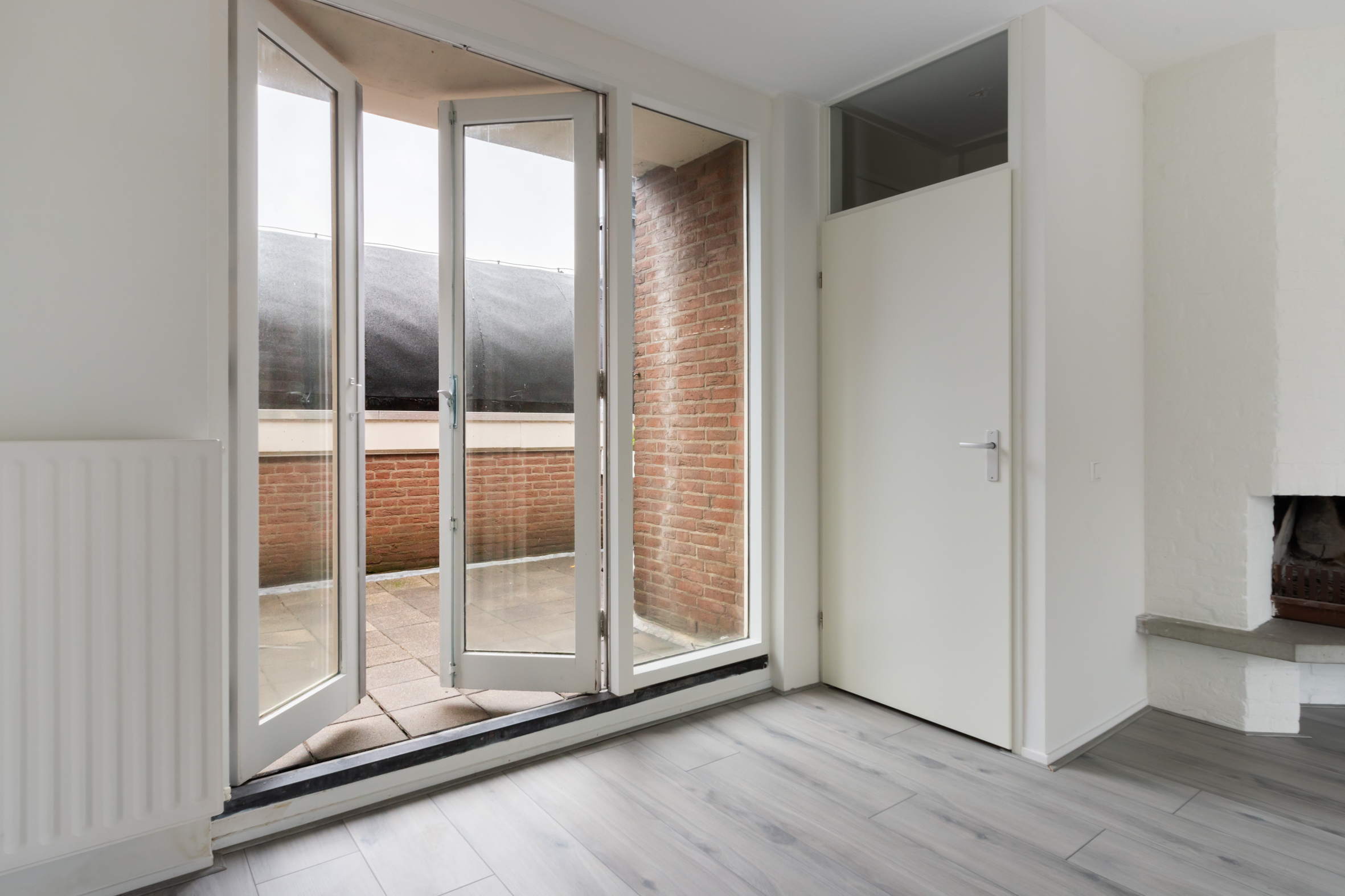 2e verdieping: kleine overloop. Grote, lichte woonkamer met open haard en openslaande deuren naar het dakterras. Aan de voorzijde openslaande deuren met een Frans balkon.
