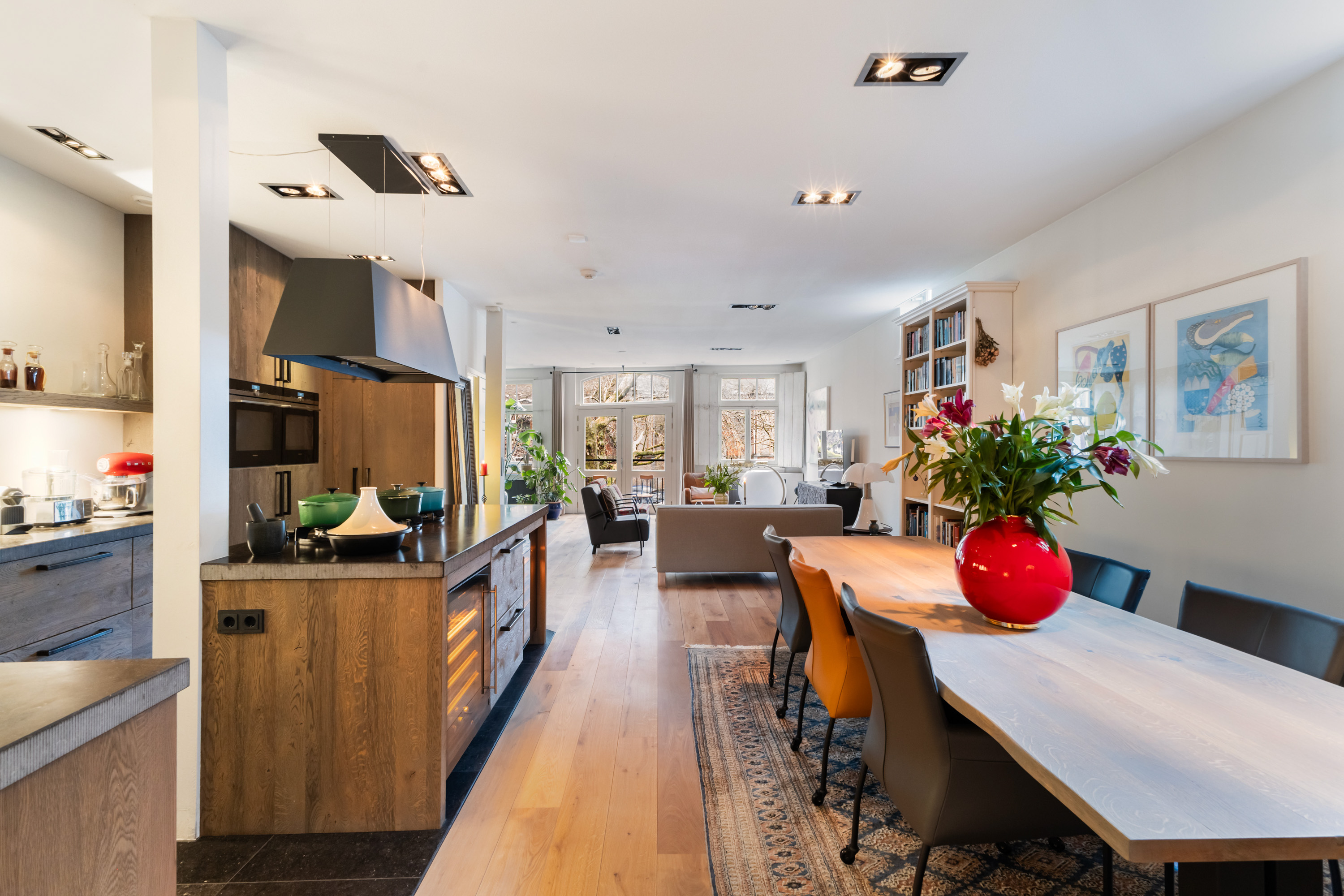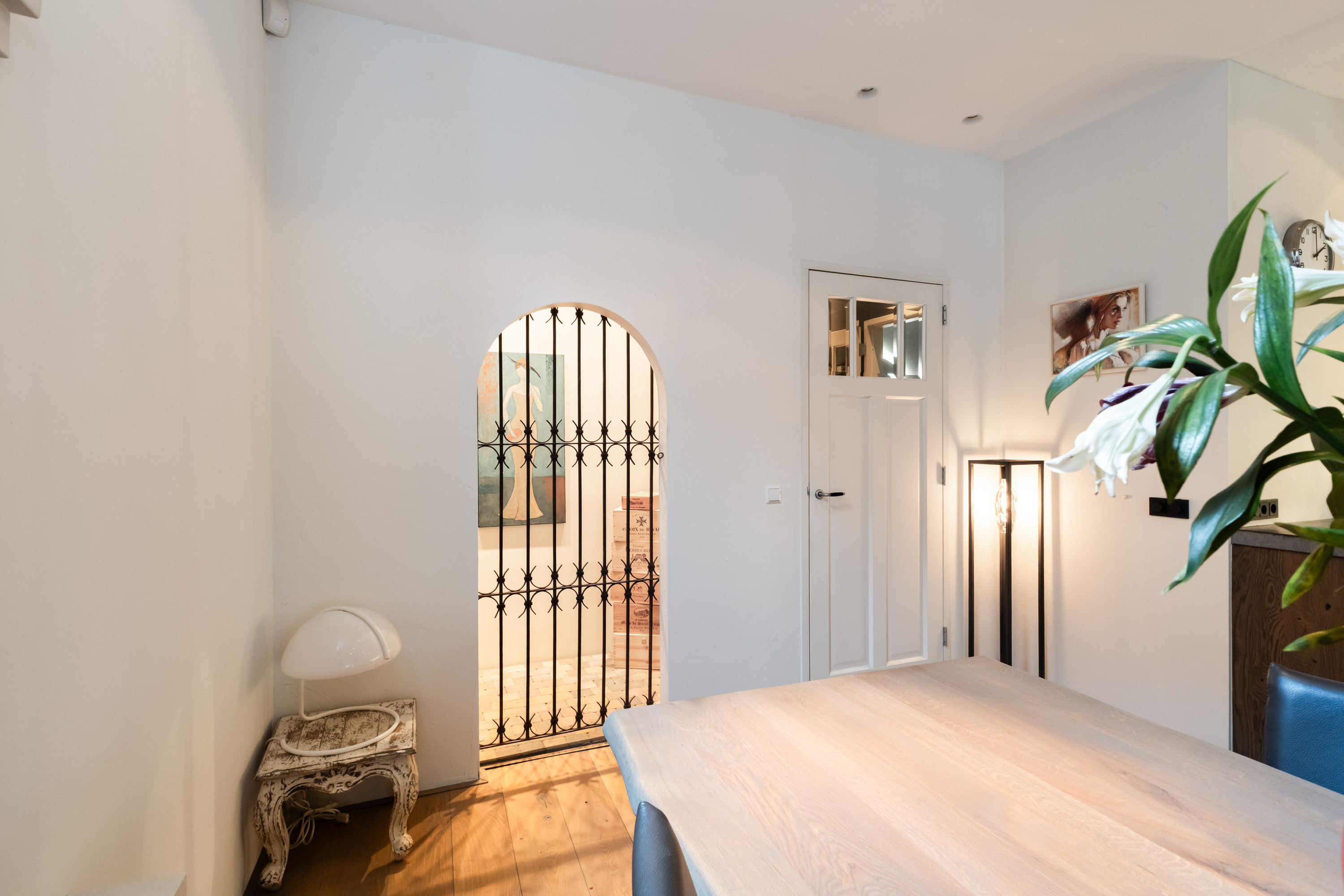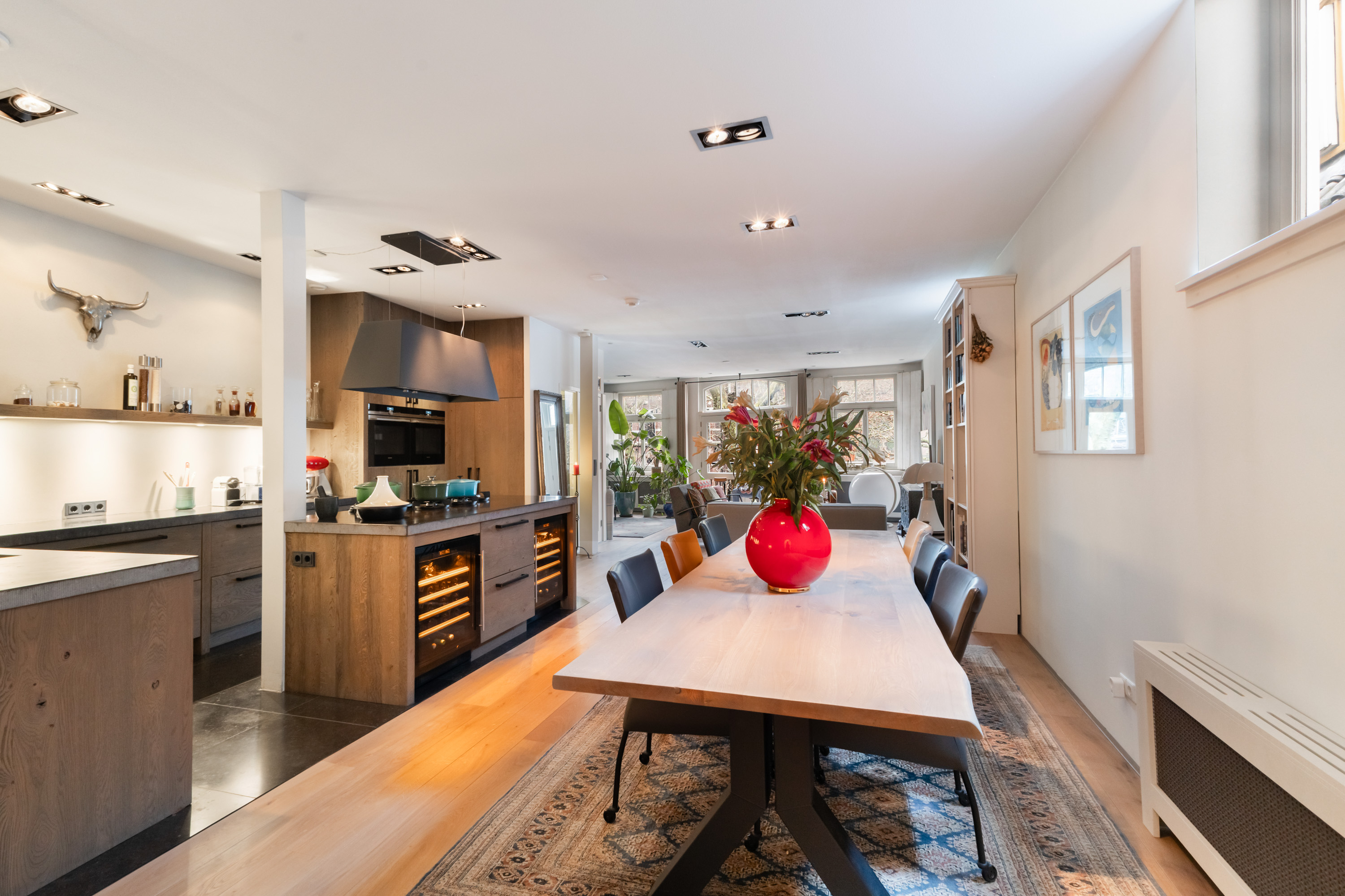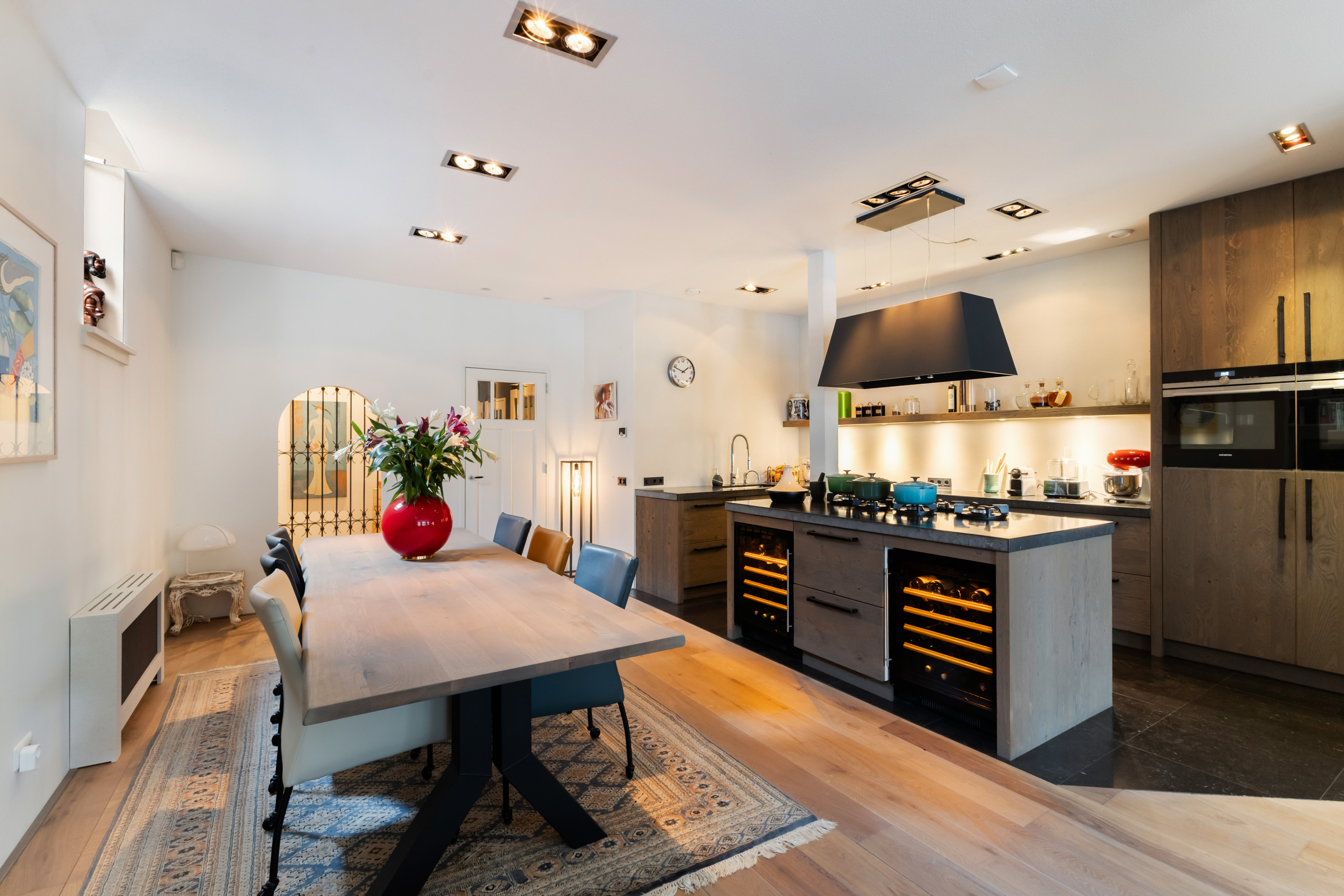 1e verdieping: privé-entree, hal met garderobe en meterkast. De woonkamer is écht lekker groot! Aan de voorzijde maar liefst 6.50 meter breed. De grote ramen met mooie luiken, de openslaande deuren en de twee zijramen, maken het tot een licht en warm geheel. Bij het Franse balkon op het zuiden zit je "buiten/binnen" in de zon. Heel gezellige, volledig uitgeruste luxe woonkeuken (2018) met een groot kookeiland, dat is voorzien van 6 ingebouwde gaspitten en een brede circulatiekap, twee luxe wijnkasten (Eurocave) en veel bergruimte. De wand heeft een grote koelkast, grote vriezer, twee ovens, een vaatwasser en een brede rvs spoelbak. De inbouwapparatuur is van Siemens, de aanrechtbladen zijn van Belgisch hardsteen en de kasten van eikenhout. Hier kun je met recht KOKEN. Direct grenzend aan het eetgedeelte is een mooie "cave" gemaakt. In de cave kan wijn perfect worden bewaard. De ruimte is afgescheiden met een fraai smeedijzeren hek/deur.