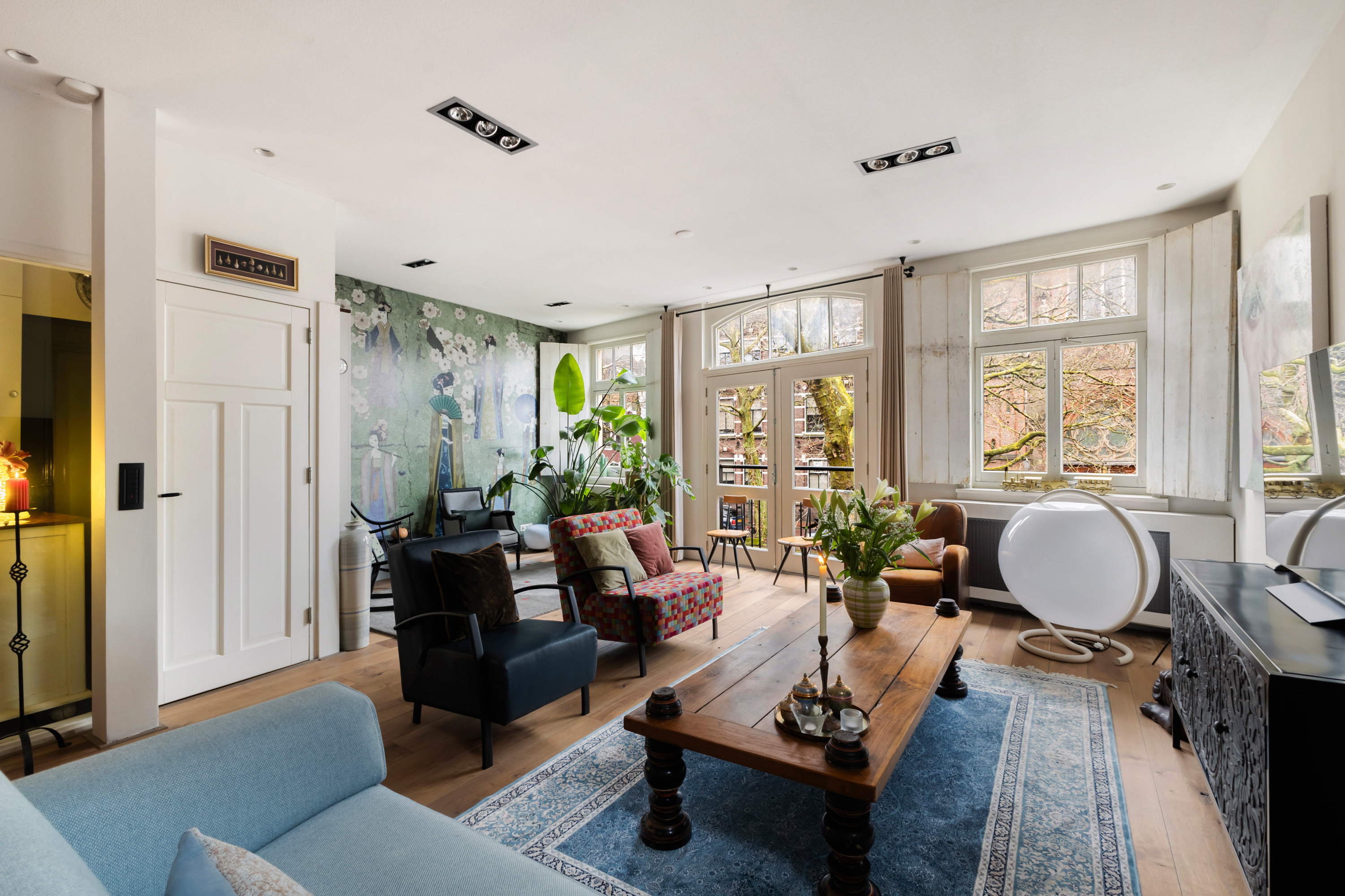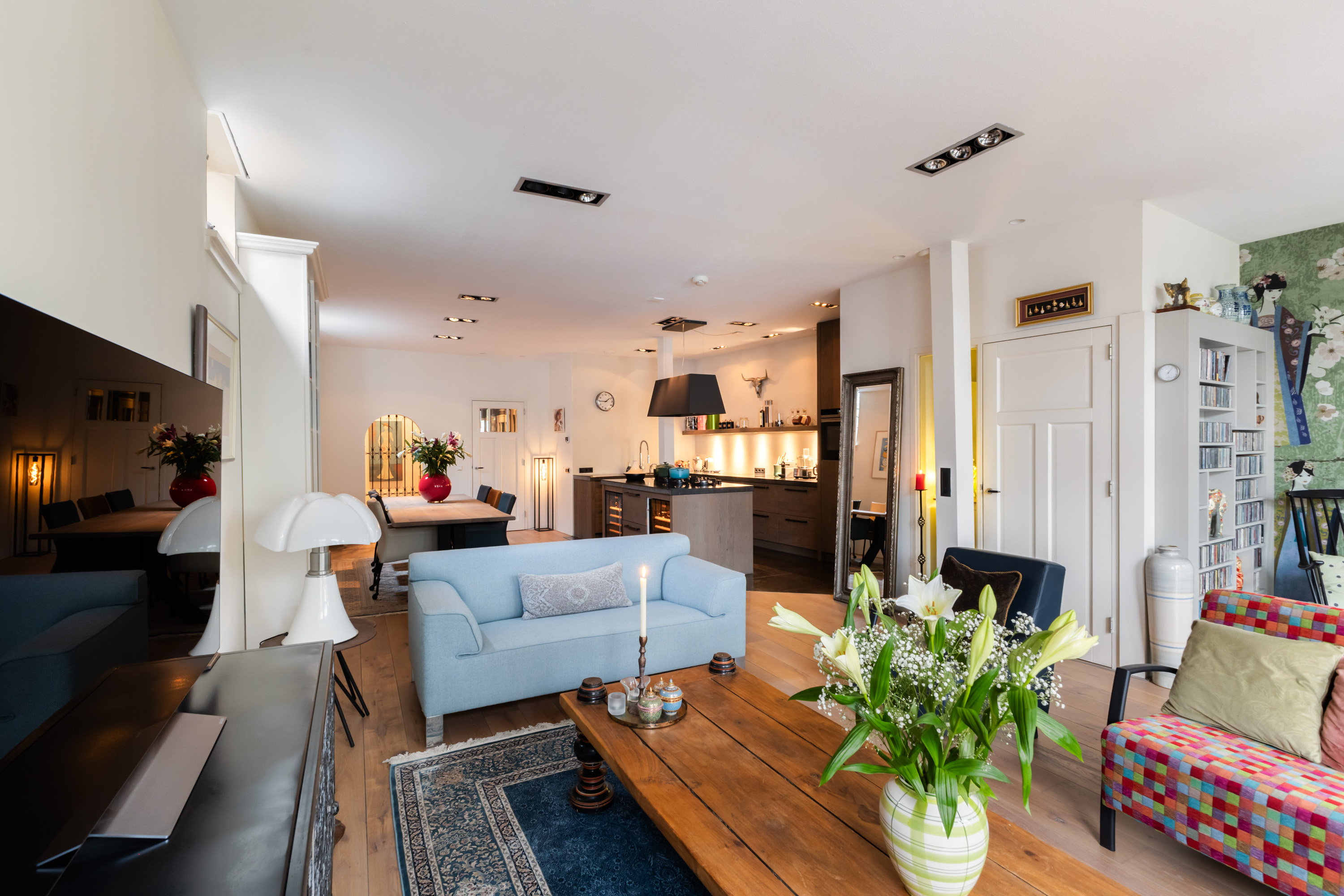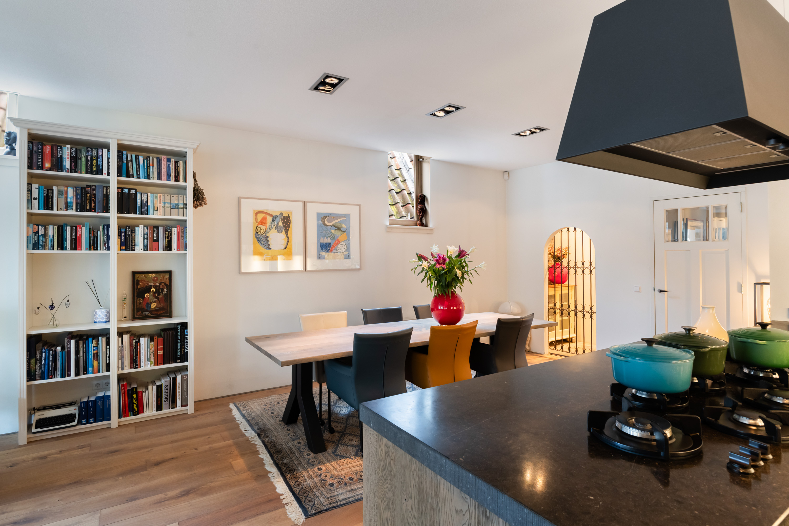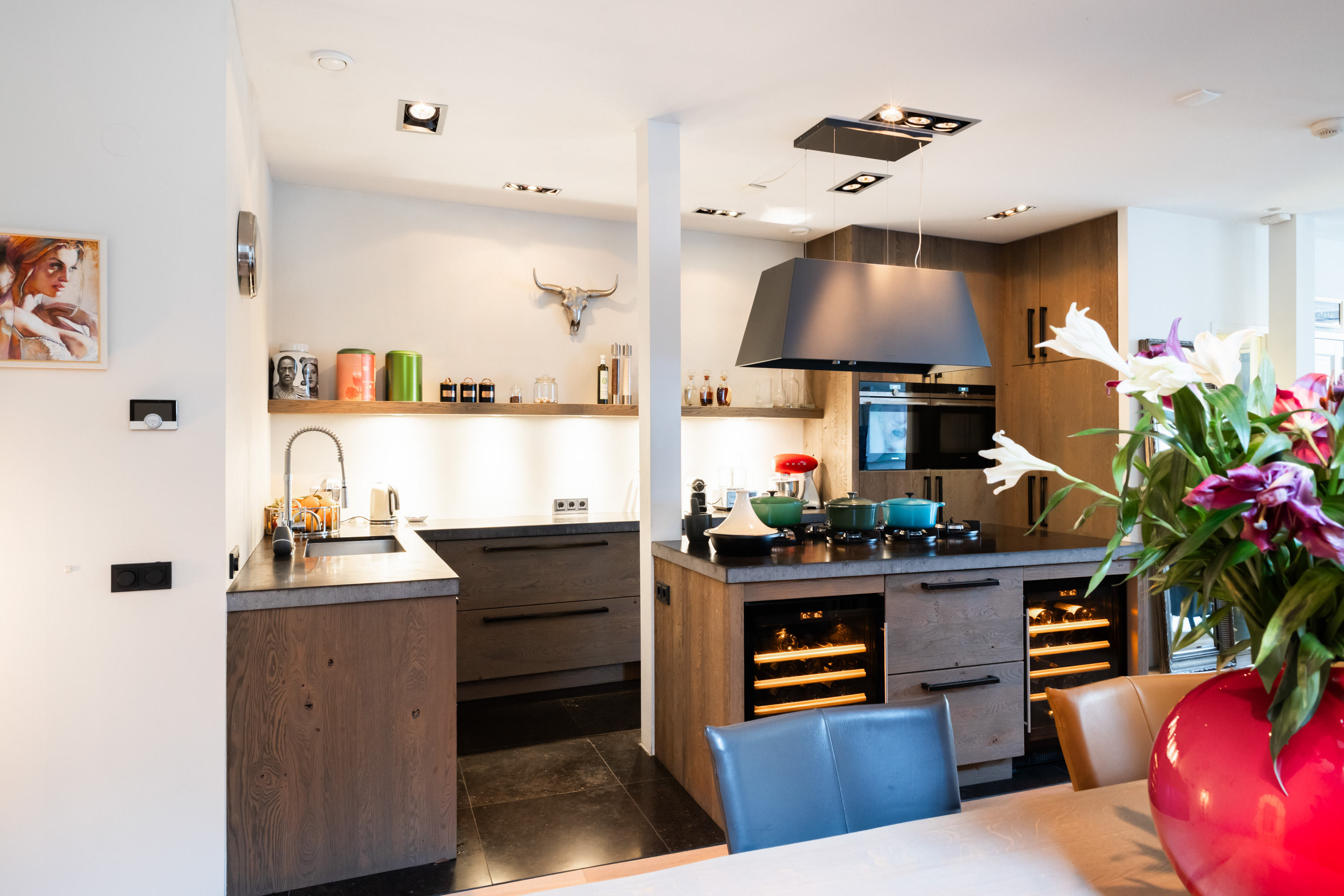 1e verdieping: privé-entree, hal met garderobe en meterkast. De woonkamer is écht lekker groot! Aan de voorzijde maar liefst 6.50 meter breed. De grote ramen met mooie luiken, de openslaande deuren en de twee zijramen, maken het tot een licht en warm geheel. Bij het Franse balkon op het zuiden zit je "buiten/binnen" in de zon. Heel gezellige, volledig uitgeruste luxe woonkeuken (2018) met een groot kookeiland, dat is voorzien van 6 ingebouwde gaspitten en een brede circulatiekap, twee luxe wijnkasten (Eurocave) en veel bergruimte. De wand heeft een grote koelkast, grote vriezer, twee ovens, een vaatwasser en een brede rvs spoelbak. De inbouwapparatuur is van Siemens, de aanrechtbladen zijn van Belgisch hardsteen en de kasten van eikenhout. Hier kun je met recht KOKEN. Direct grenzend aan het eetgedeelte is een mooie "cave" gemaakt. In de cave kan wijn perfect worden bewaard. De ruimte is afgescheiden met een fraai smeedijzeren hek/deur.
