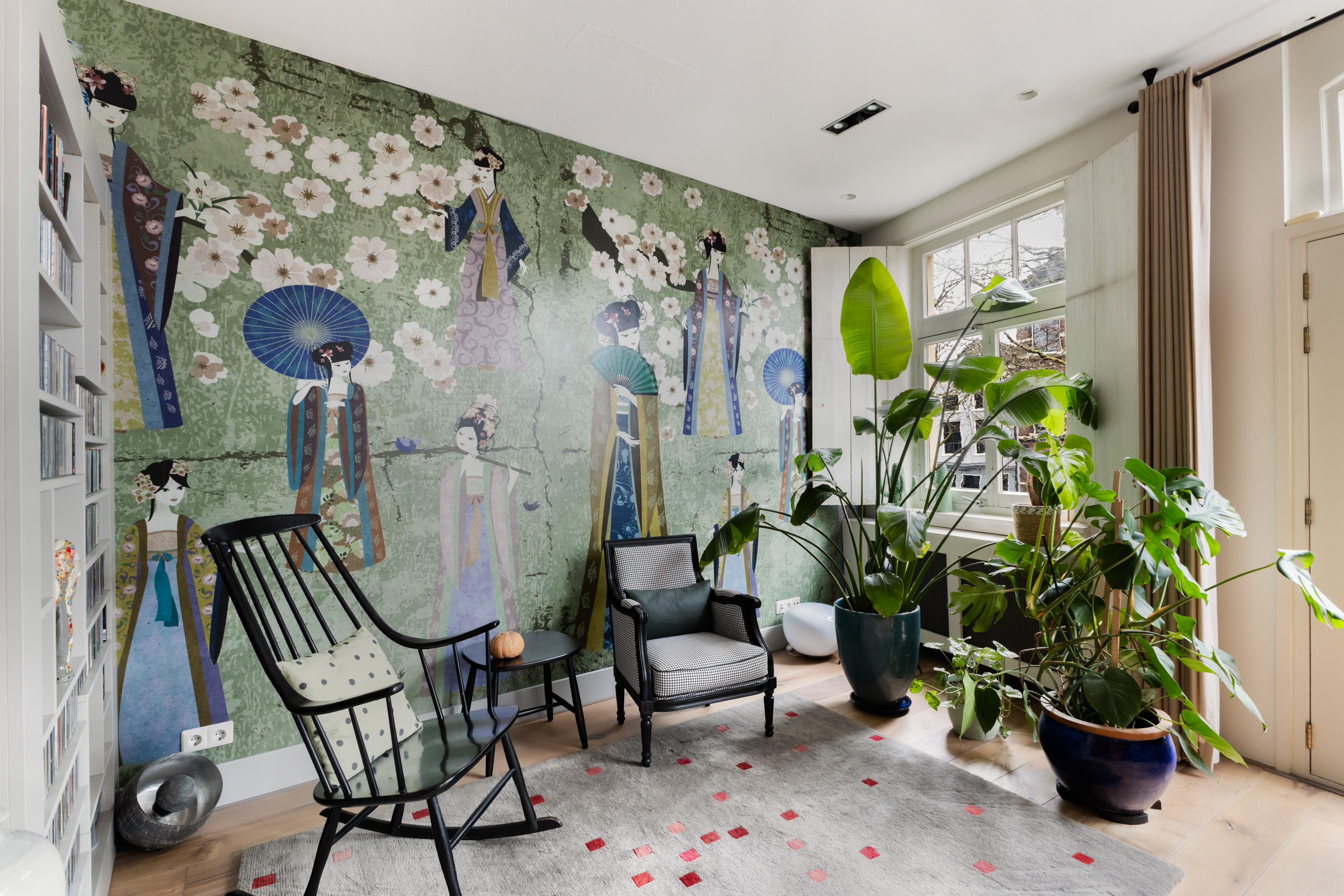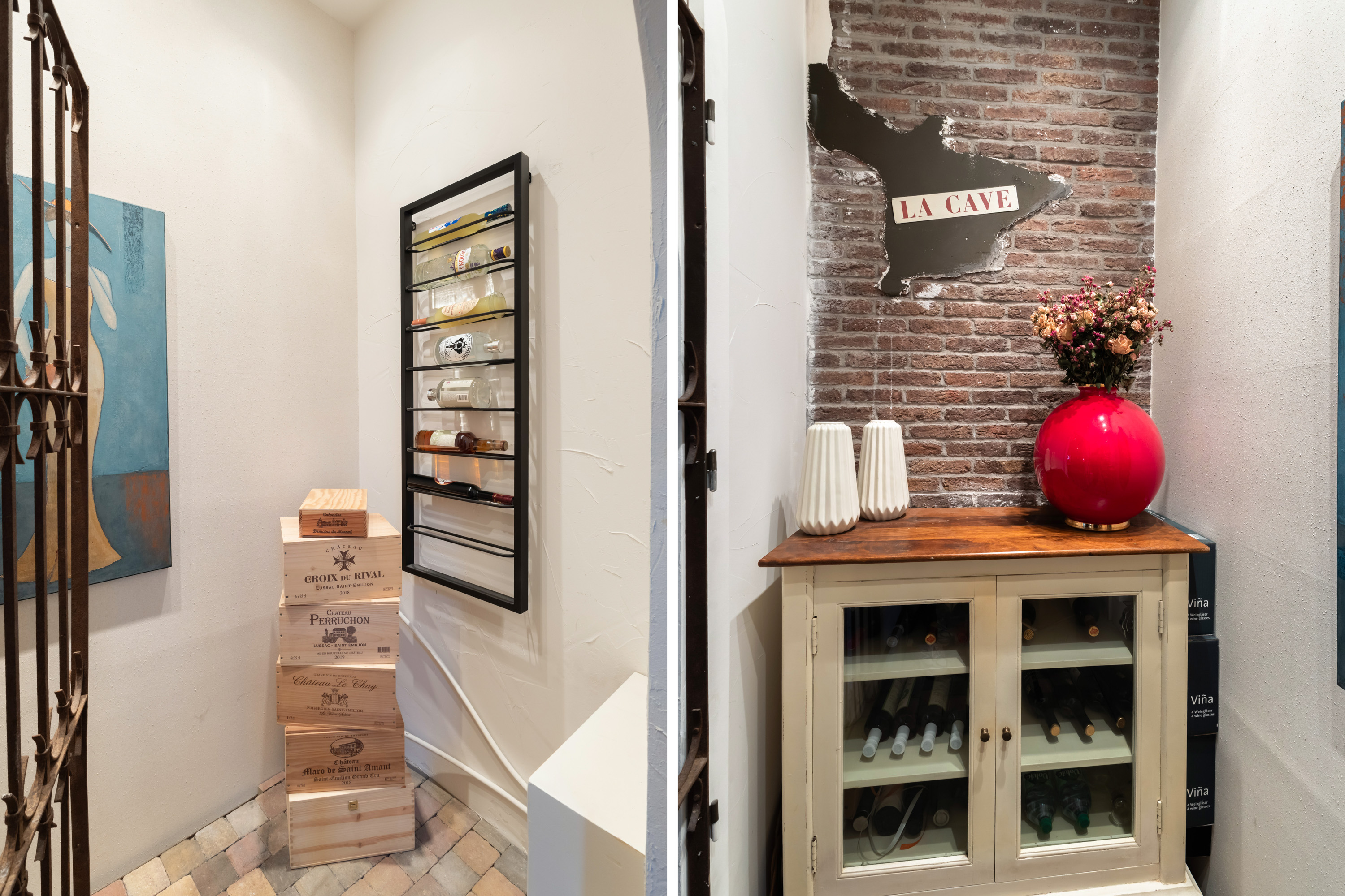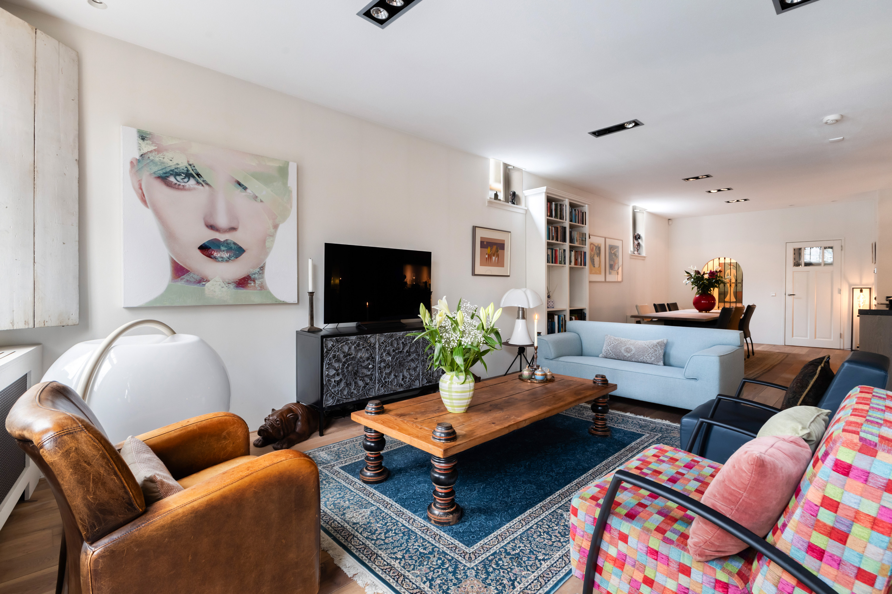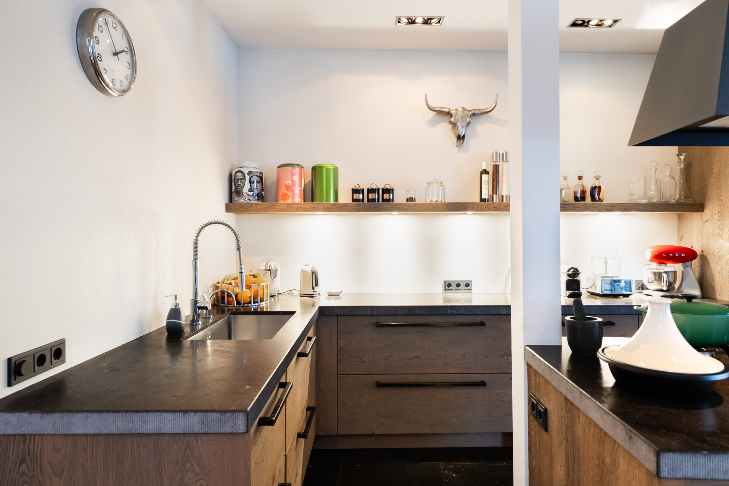 1e verdieping: privé-entree, hal met garderobe en meterkast. De woonkamer is écht lekker groot! Aan de voorzijde maar liefst 6.50 meter breed. De grote ramen met mooie luiken, de openslaande deuren en de twee zijramen, maken het tot een licht en warm geheel. Bij het Franse balkon op het zuiden zit je "buiten/binnen" in de zon. Heel gezellige, volledig uitgeruste luxe woonkeuken (2018) met een groot kookeiland, dat is voorzien van 6 ingebouwde gaspitten en een brede circulatiekap, twee luxe wijnkasten (Eurocave) en veel bergruimte. De wand heeft een grote koelkast, grote vriezer, twee ovens, een vaatwasser en een brede rvs spoelbak. De inbouwapparatuur is van Siemens, de aanrechtbladen zijn van Belgisch hardsteen en de kasten van eikenhout. Hier kun je met recht KOKEN. Direct grenzend aan het eetgedeelte is een mooie "cave" gemaakt. In de cave kan wijn perfect worden bewaard. De ruimte is afgescheiden met een fraai smeedijzeren hek/deur.