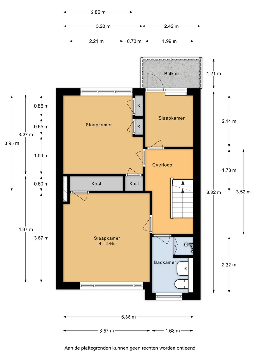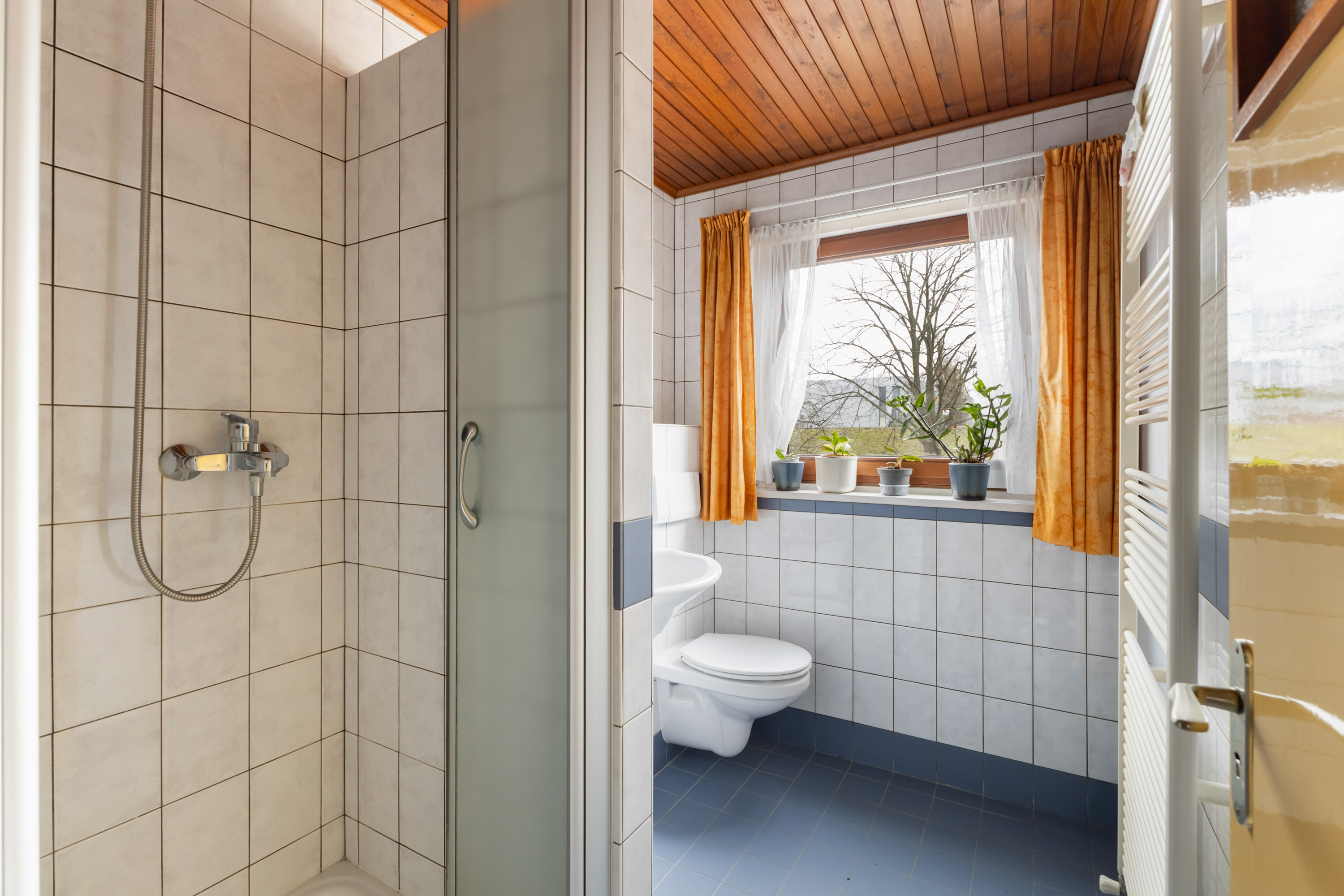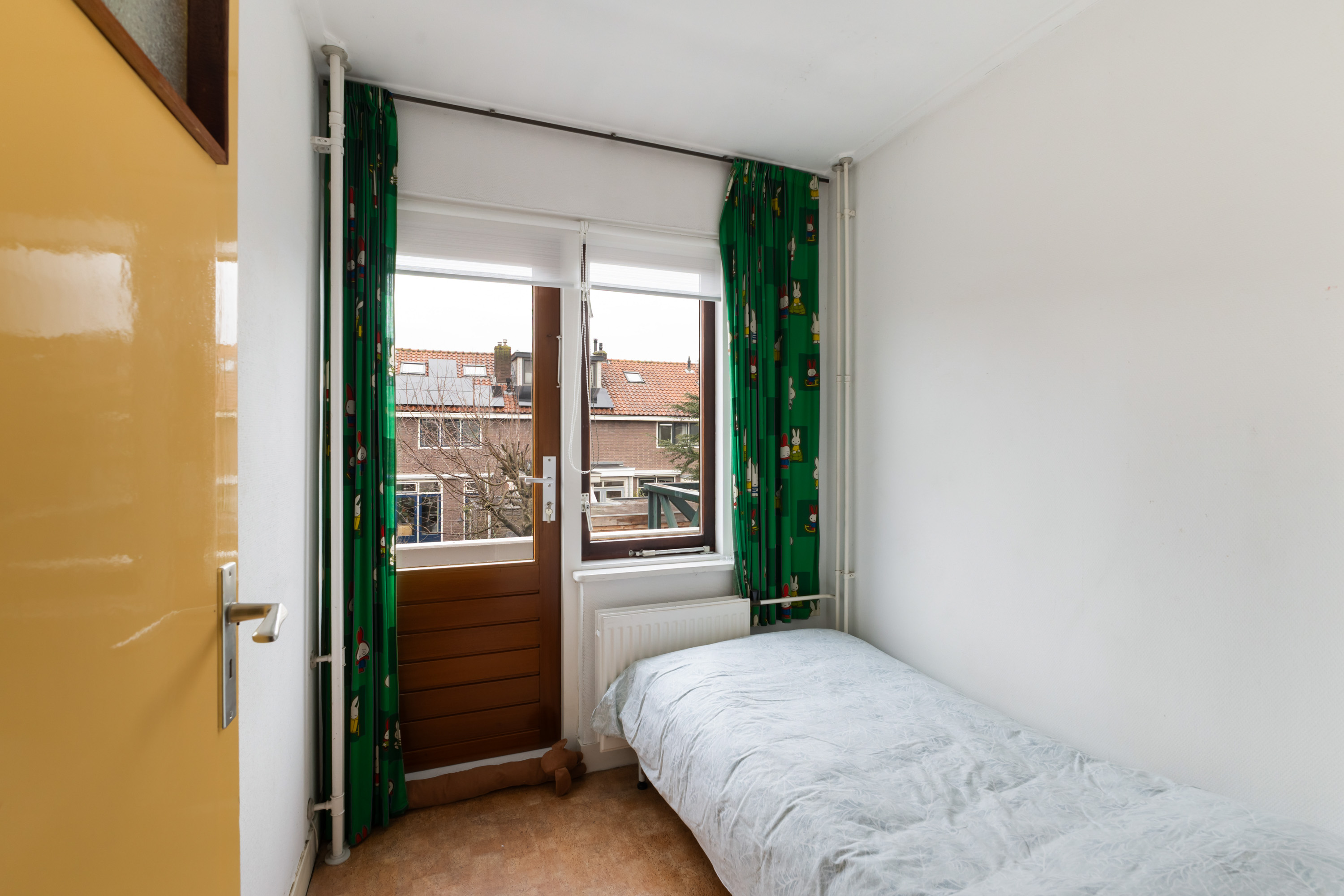 1e verdieping: overloop, slaapkamer voorzijde met vaste kast, badkamer (geheel wit-blauw betegeld) voorzien van een douche, wastafel, hangend toilet, een designradiator en een raam. Twee slaapkamers aan de achterzijde, waarvan één met twee vaste kasten en één met balkon.