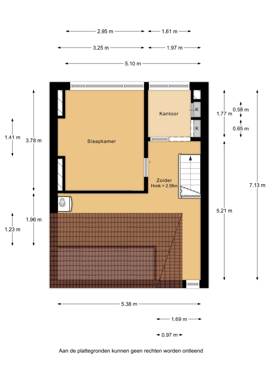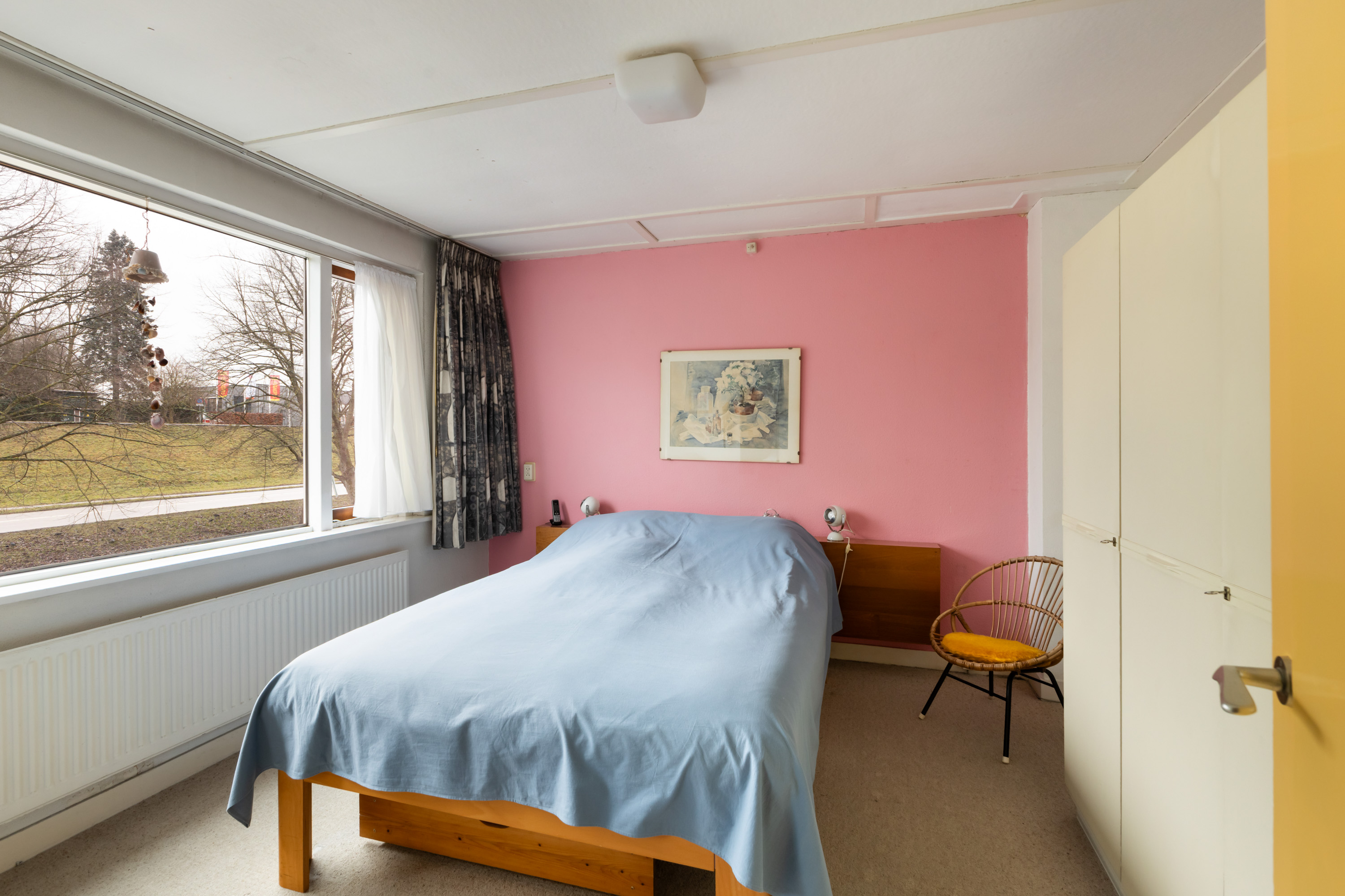 2e verdieping: overloop met hoge nok en smal raam in de voorgevel. Veel bergruimte en de opstelling van de cv-ketel. Een grote slaapkamer en een hobbykamer, beide met dakkapel.