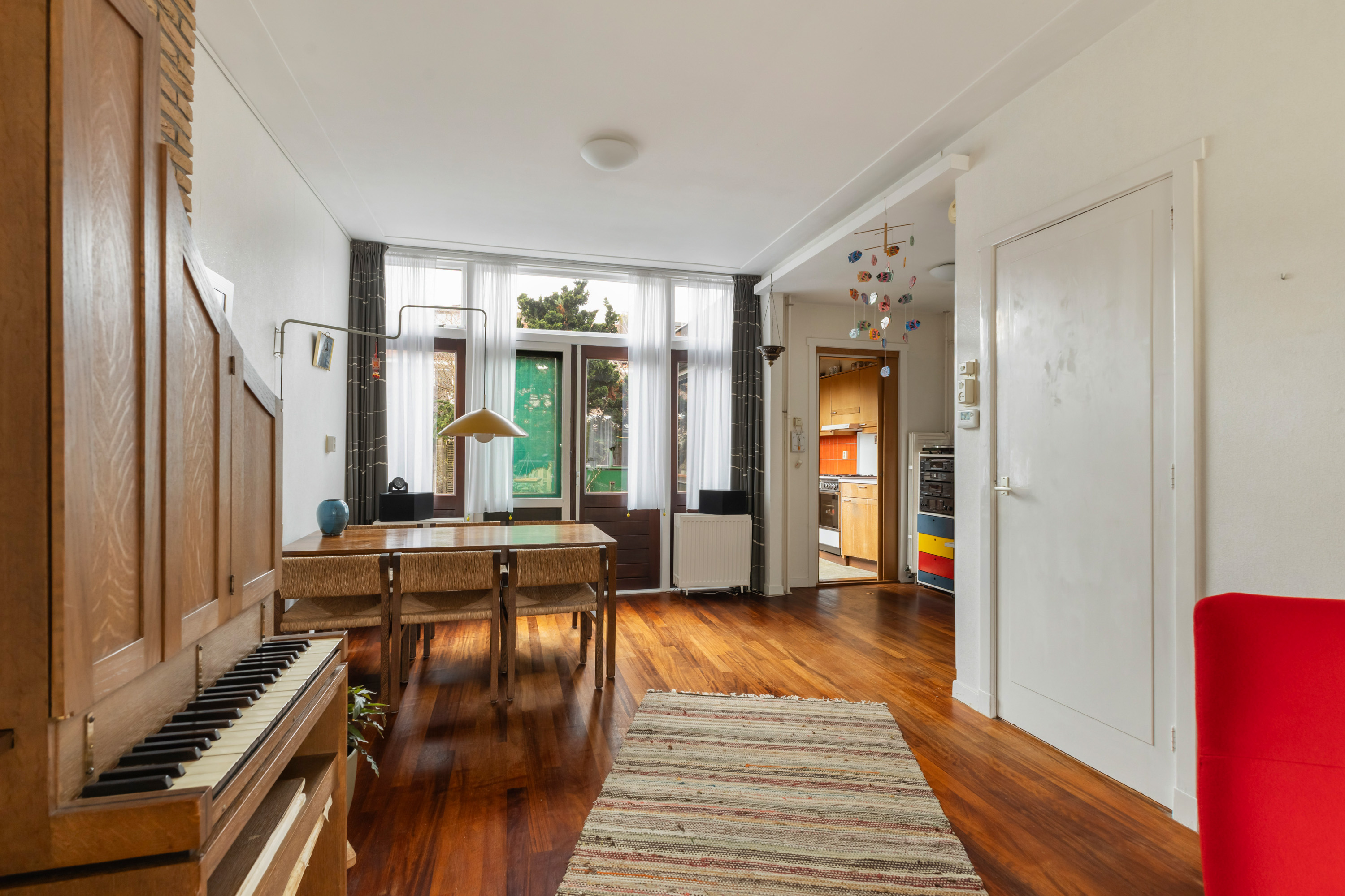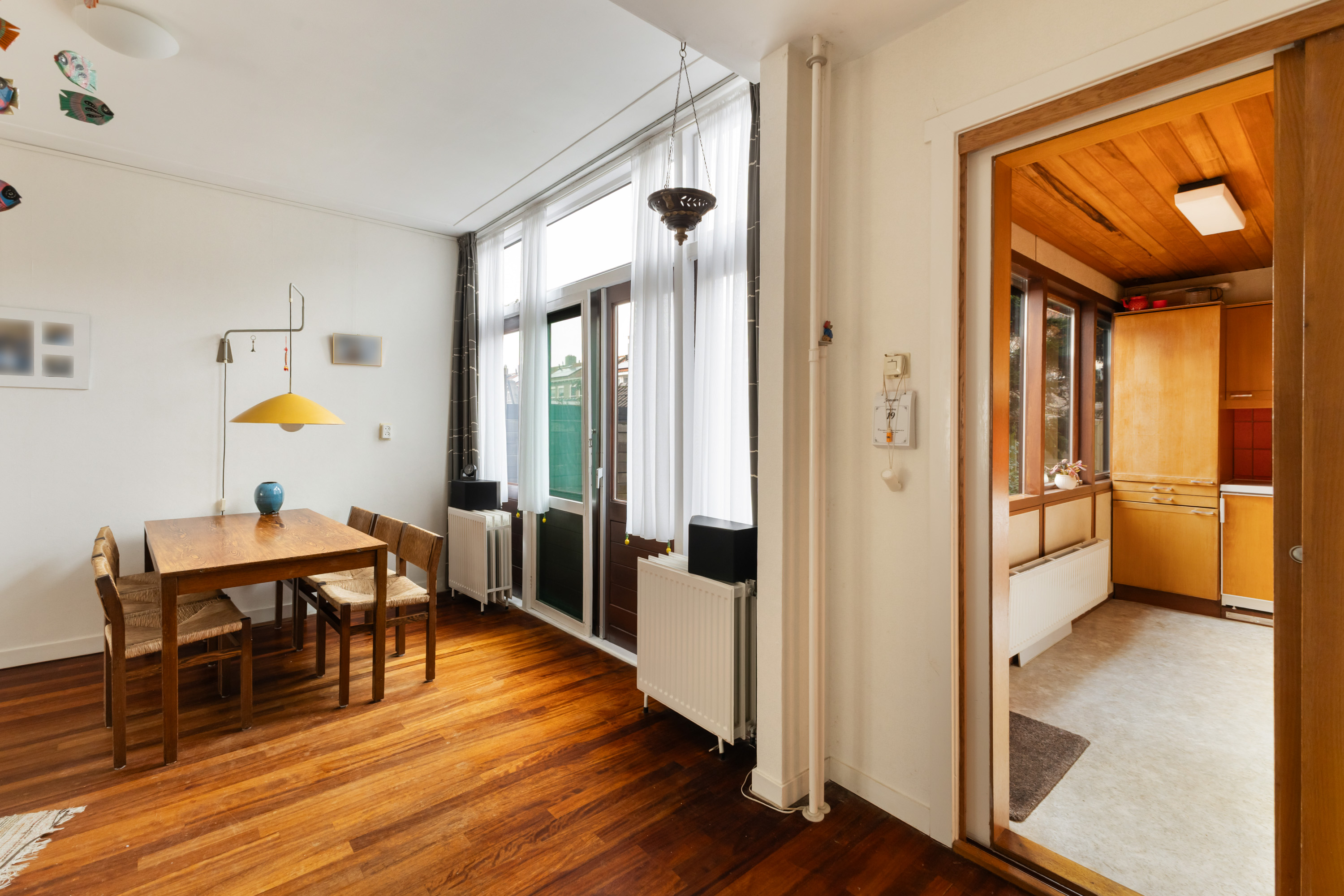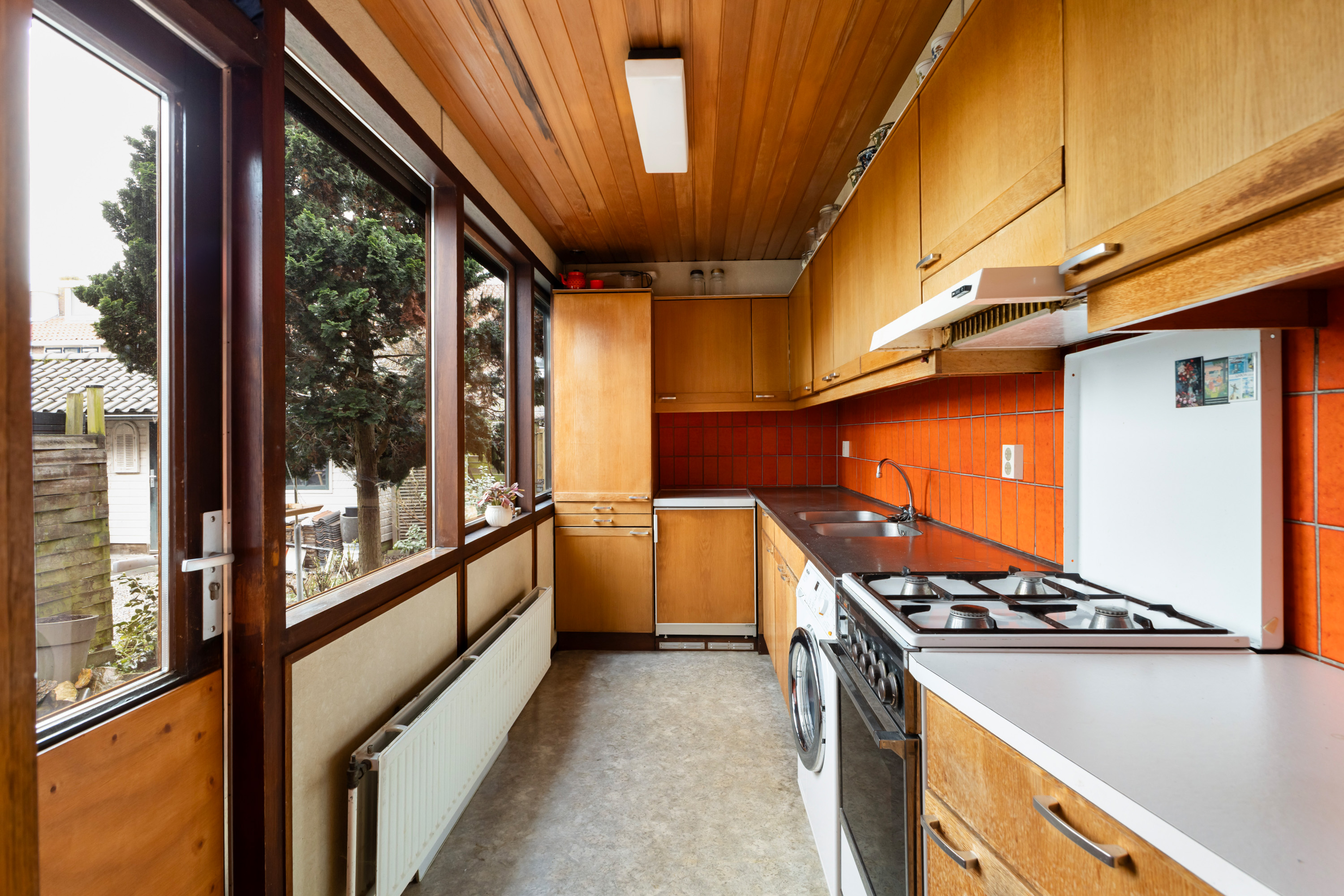 Begane grond: entree, hal met meterkast, garderobe, trapkast, toilet met fontein en de originele terrazzovloer. Ruime doorzonwoonkamer in een L-vorm en met erker aan de voorzijde en openslaande deuren aan de achterzijde. Aanbouw met keuken (1975) voorzien van een dubbele rvs spoelbak, massief eiken kastdeurtjes, handige bergruimte en een deur naar de tuin.