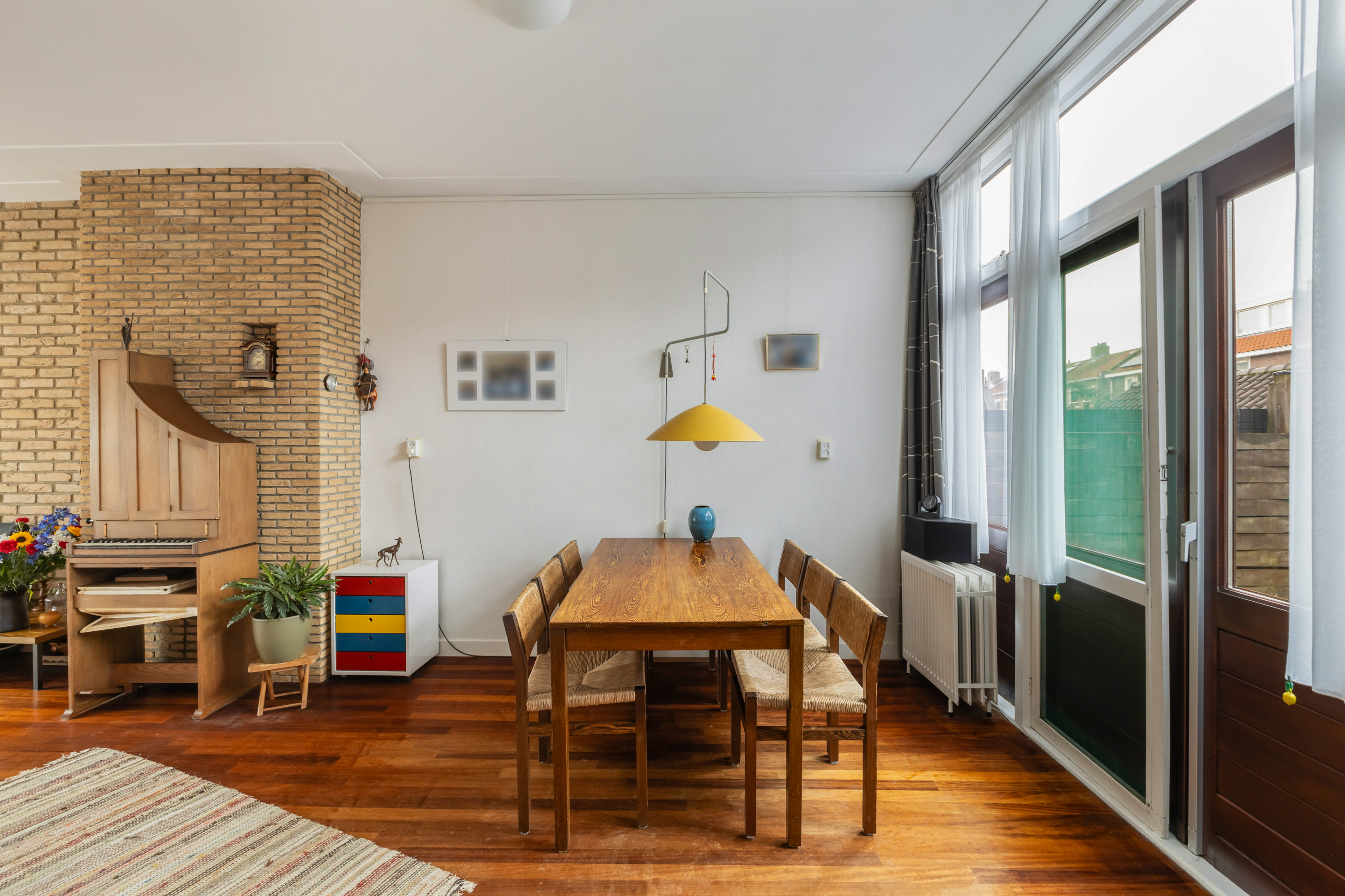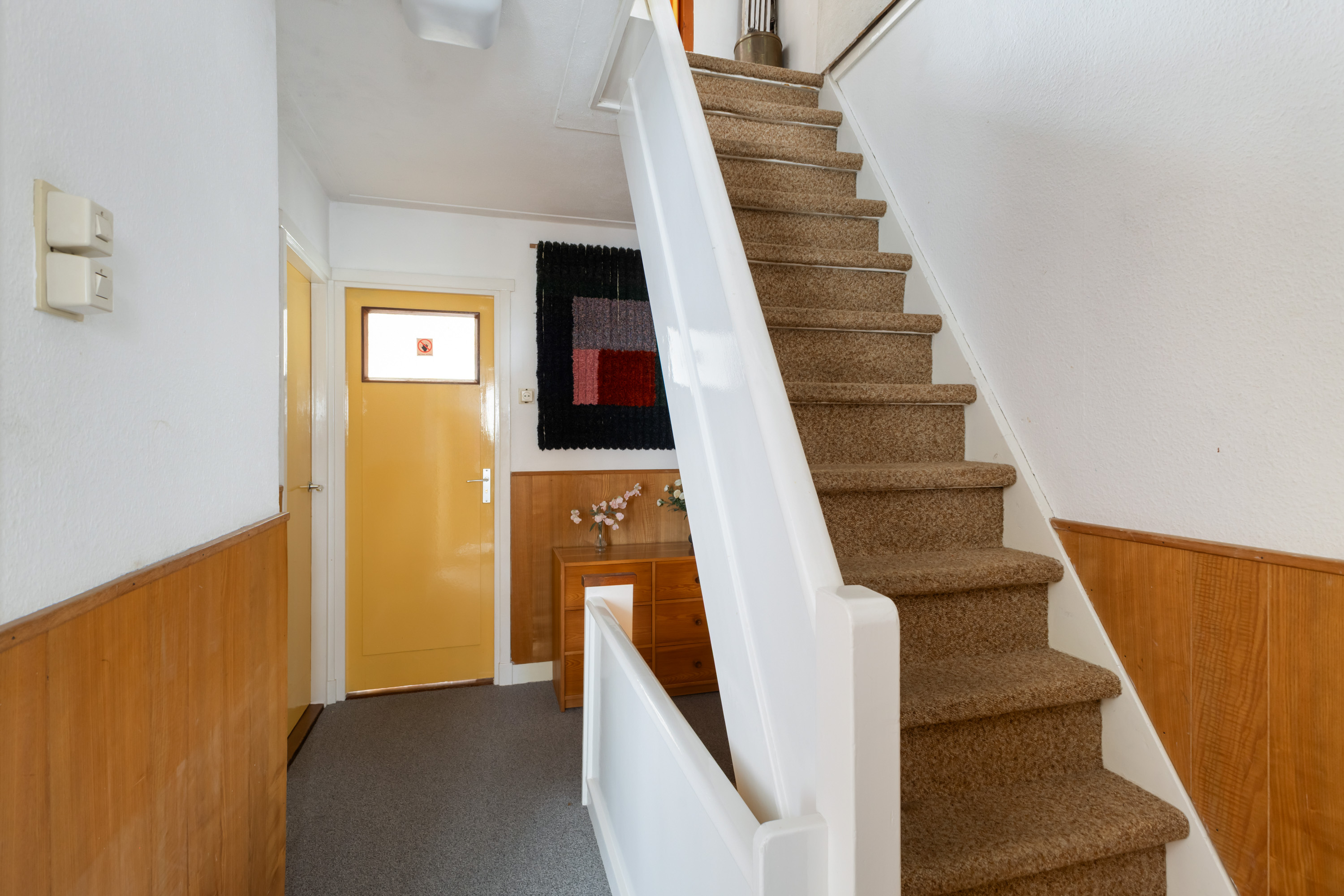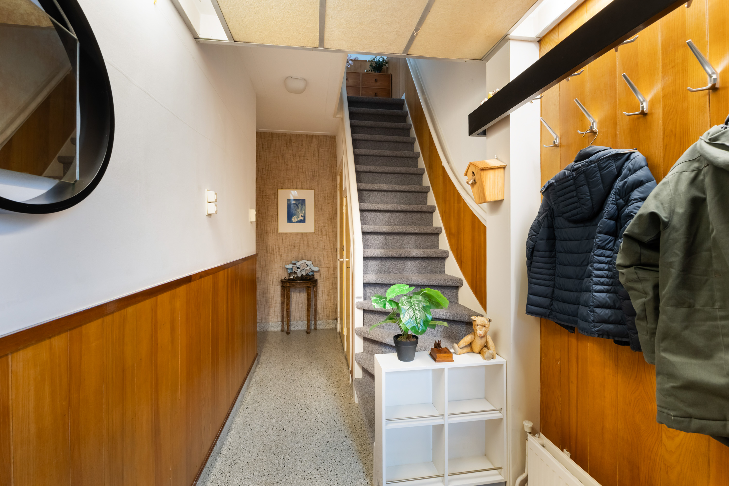 Begane grond: entree, hal met meterkast, garderobe, trapkast, toilet met fontein en de originele terrazzovloer. Ruime doorzonwoonkamer in een L-vorm en met erker aan de voorzijde en openslaande deuren aan de achterzijde. Aanbouw met keuken (1975) voorzien van een dubbele rvs spoelbak, massief eiken kastdeurtjes, handige bergruimte en een deur naar de tuin.