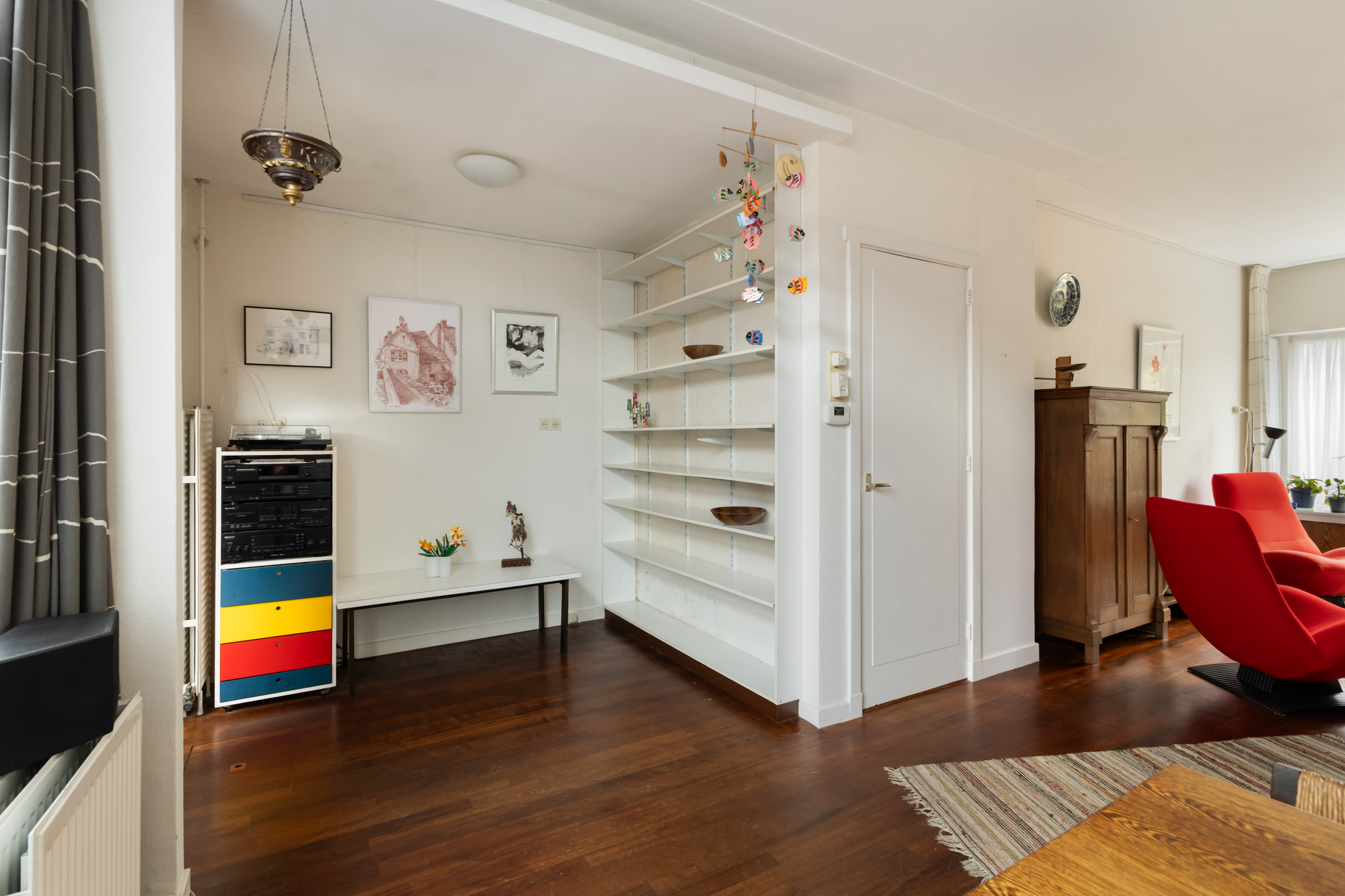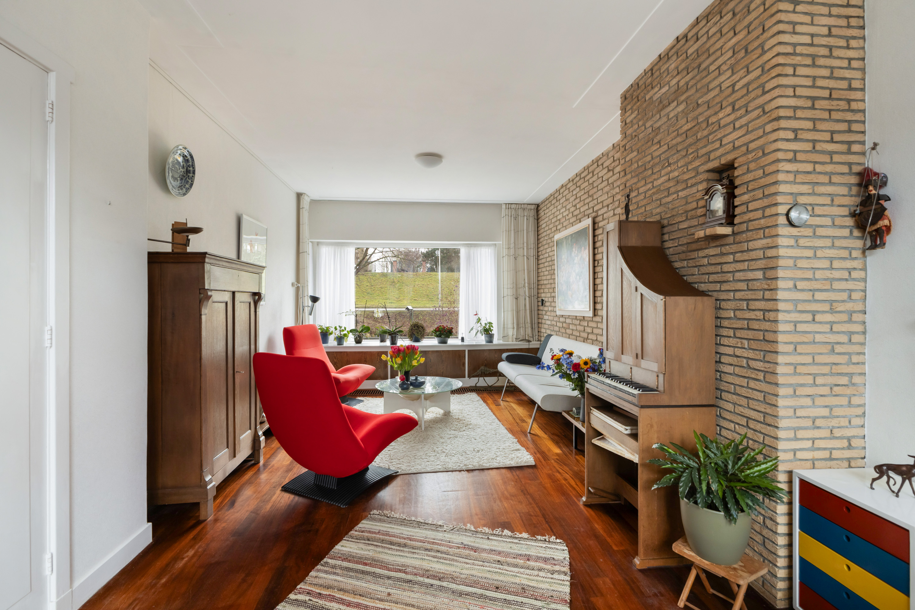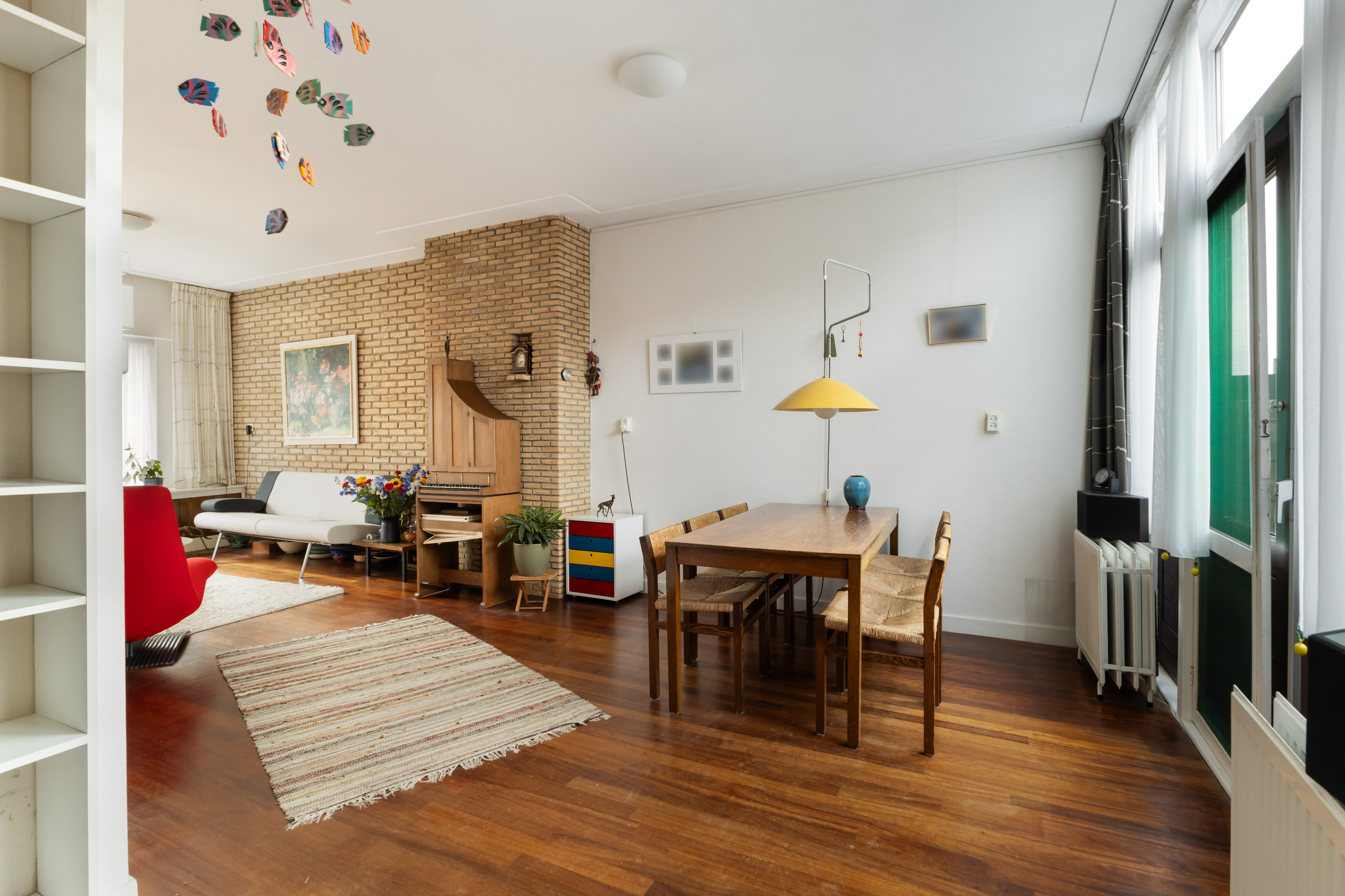 *lichte woonkamer met tropisch hardhouten vloer, glad gestuukte wanden en plafond, voormalige schouw met schoonmetselwerk en een groot raam aan de voorzijde.
