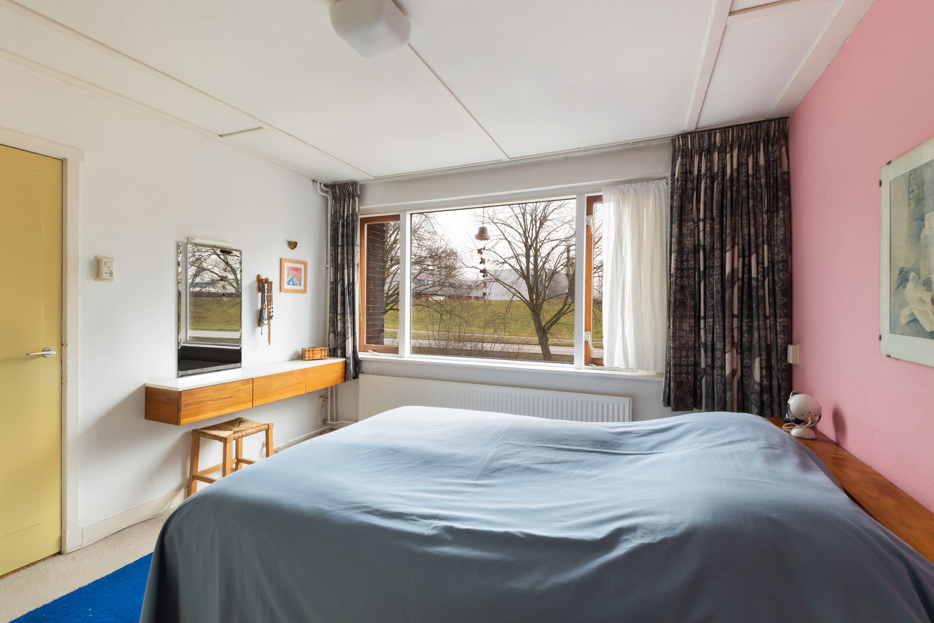 *De erker heeft een brede vensterbank, waaronder zich praktische bergruimte bevindt. Aan de voorzijde zit een convectorput en aan de achterzijde zijn openslaande deuren naar de tuin aangebracht.