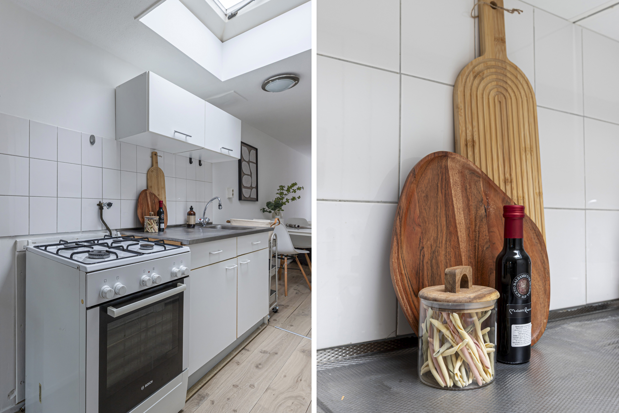 Eerste verdieping: entree woning, lichte open studio met aan de voor- en achterzijde grote ramen, eiken laminaatvloer. Het keukenblok is in het midden opgesteld en voorzien van een rvs blad, wit kunststof onderkasten en twee bovenkastjes en een los gasfornuis met oven. Eenvoudige doucheruimte en een separaat toilet.