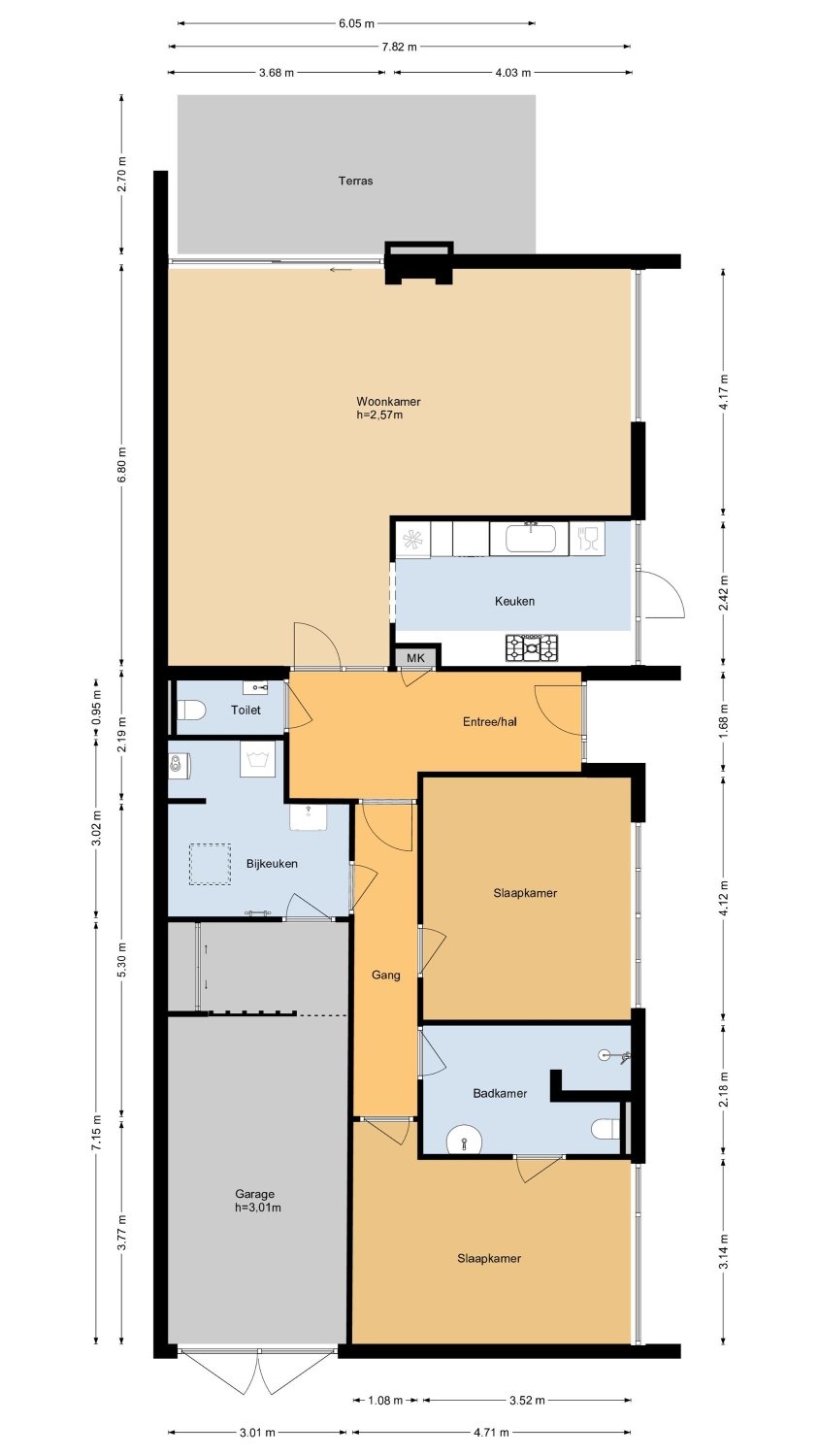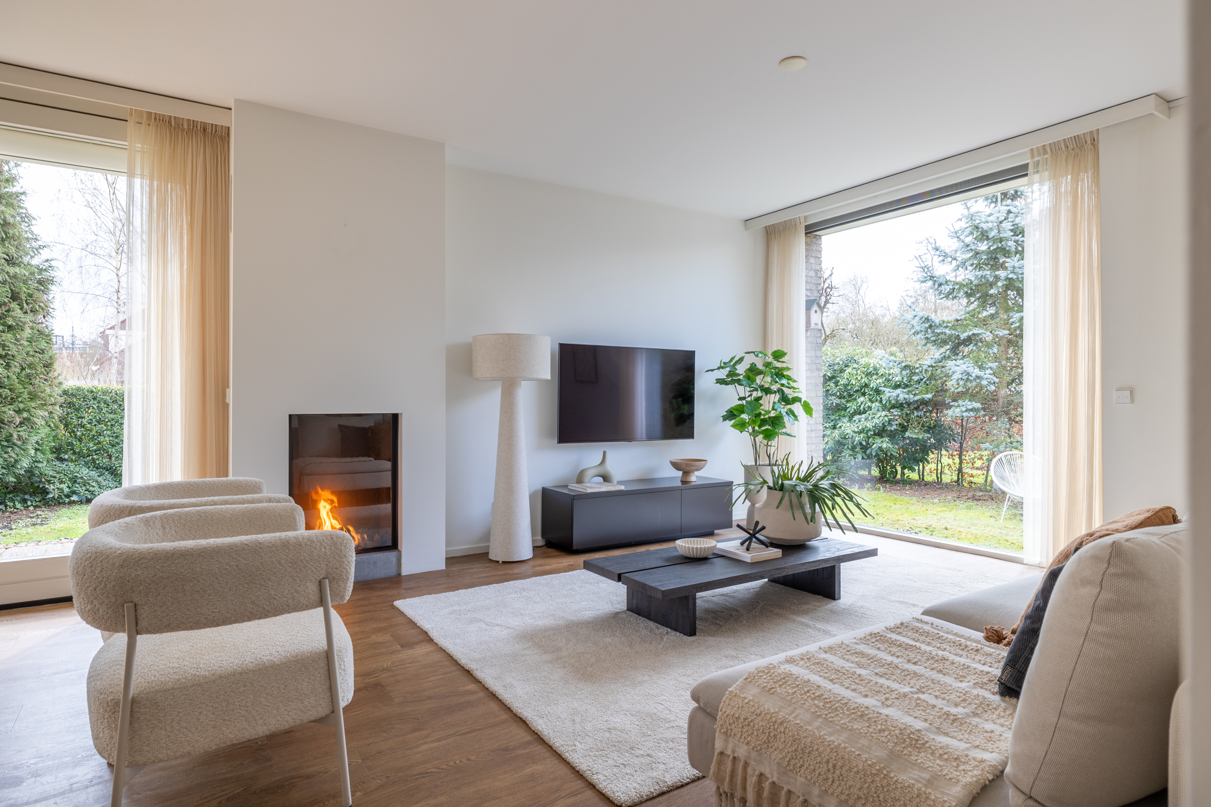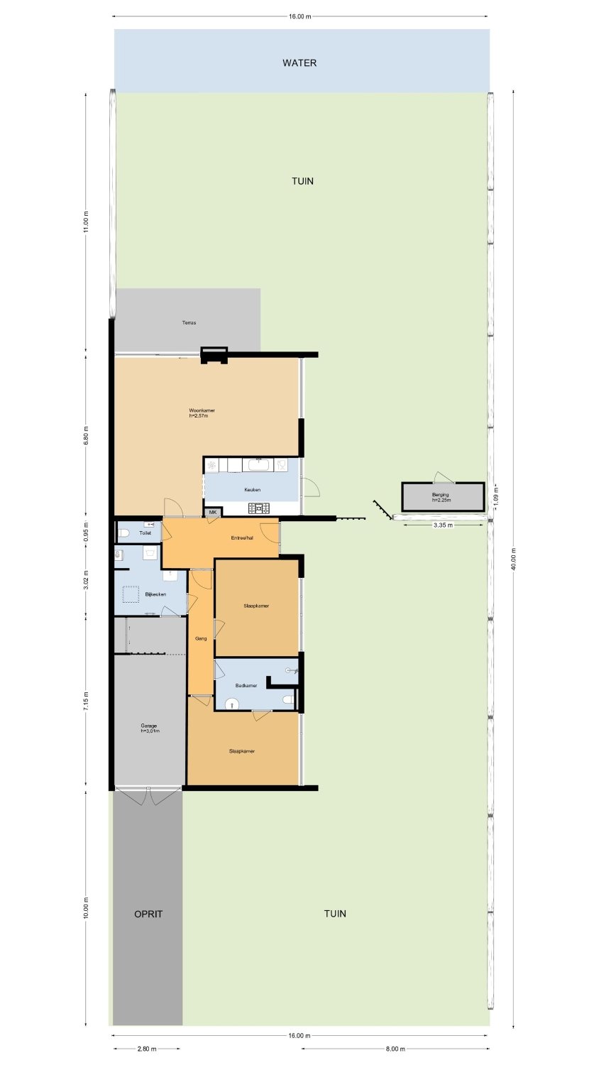 begane grond: entree, ruime hal met meterkast en modern toilet met fontein. Ruime, lichte woonkamer (L-vorm) met een gezellige gashaard, grote ramen en een schuifpui naar de tuin. Luxe keuken voorzien van een dubbel aanrecht (composiet), 2 rvs spoelbakken, magnetron, oven, 5 pits gaskookplaat, afzuigkap, koelkast, vriezer en nieuwe vaatwasser. Verder veel laden en een deur naar tuin. Vanuit de gang zijn achtereenvolgens bereikbaar een grote slaapkamer 1, luxe badkamer met gietvloer, inloopdouche, wastafel met meubel, hangend toilet, designradiator en lichtkoepel. Ruime slaapkamer 2 met airconditioning en kledingkast. Inpandige berg-/was-/cv-ruimte met aanrechtblad, kasten en een lichtkoepel. Deur naar de garage aan de voorzijde.
