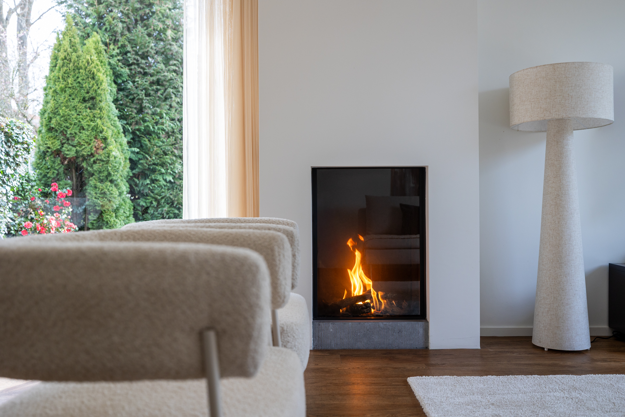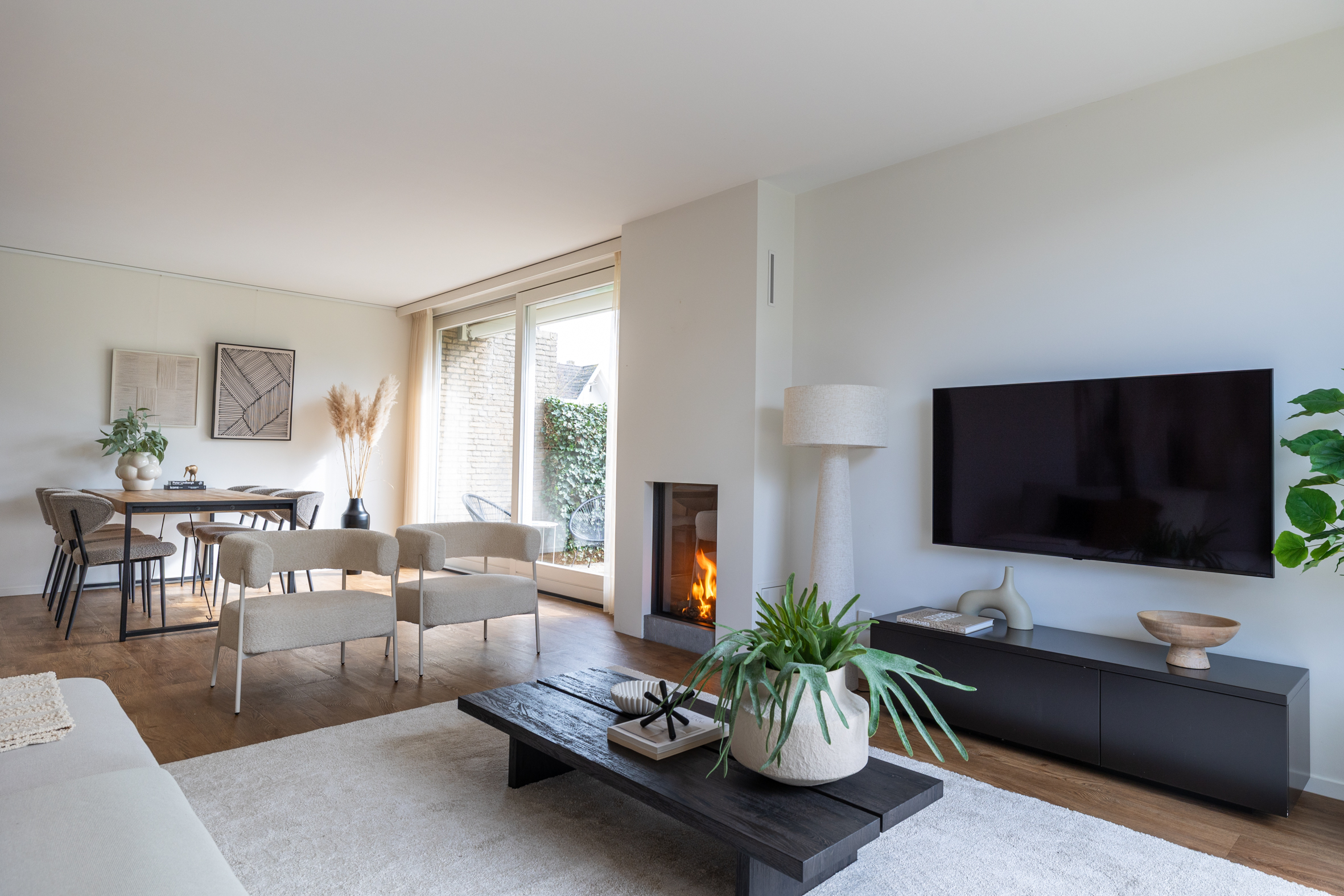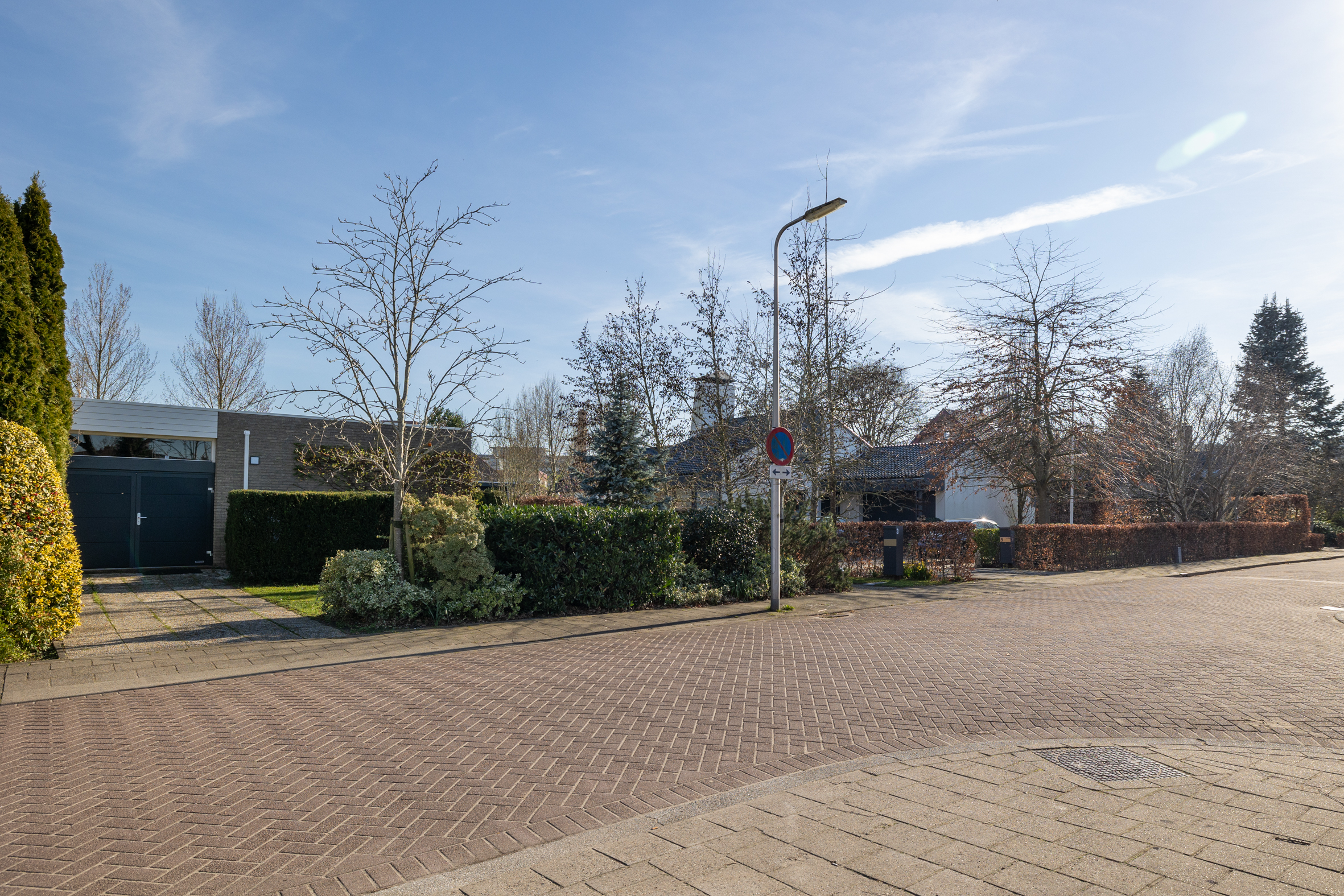begane grond: entree, ruime hal met meterkast en modern toilet met fontein. Ruime, lichte woonkamer (L-vorm) met een gezellige gashaard, grote ramen en een schuifpui naar de tuin. Luxe keuken voorzien van een dubbel aanrecht (composiet), 2 rvs spoelbakken, magnetron, oven, 5 pits gaskookplaat, afzuigkap, koelkast, vriezer en nieuwe vaatwasser. Verder veel laden en een deur naar tuin. Vanuit de gang zijn achtereenvolgens bereikbaar een grote slaapkamer 1, luxe badkamer met gietvloer, inloopdouche, wastafel met meubel, hangend toilet, designradiator en lichtkoepel. Ruime slaapkamer 2 met airconditioning en kledingkast. Inpandige berg-/was-/cv-ruimte met aanrechtblad, kasten en een lichtkoepel. Deur naar de garage aan de voorzijde.