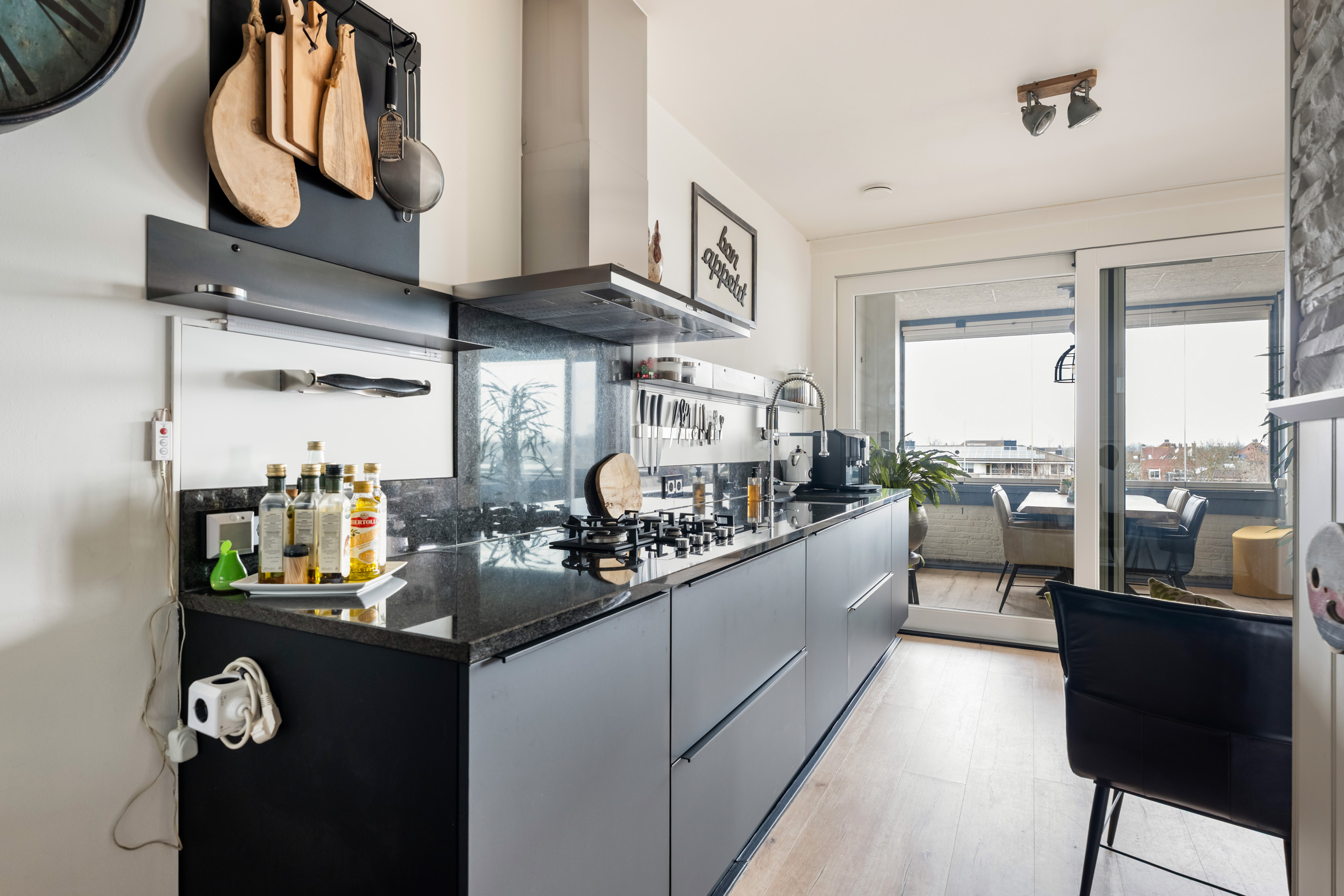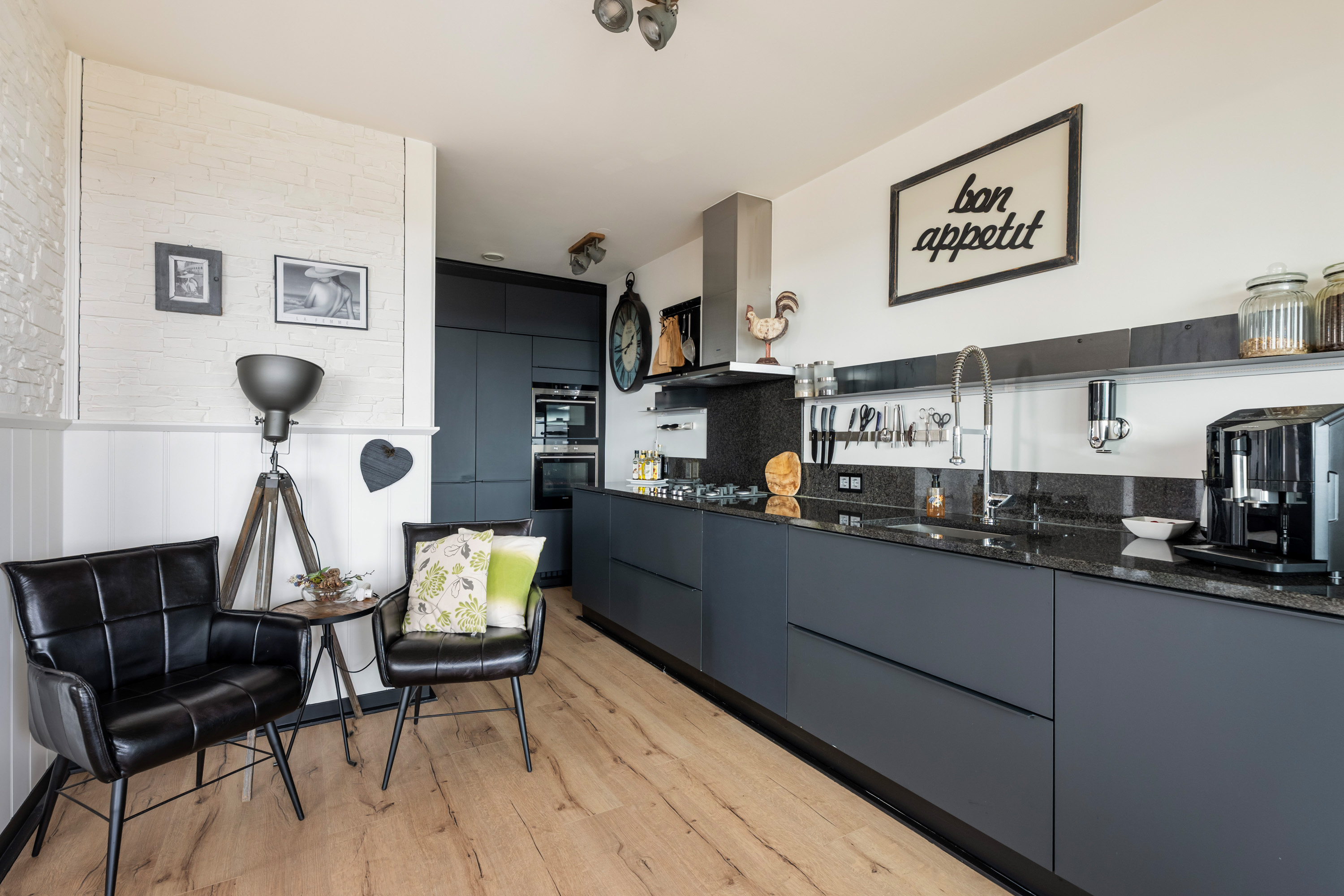 Luxe open keuken voorzien van een granieten aanrechtblad, rvs spoelbak, 5-pitsgaskookplaat, afzuigkap, oven, combi-magnetron, koelkast, vriezer, vaatwasser en veel bergruimte!