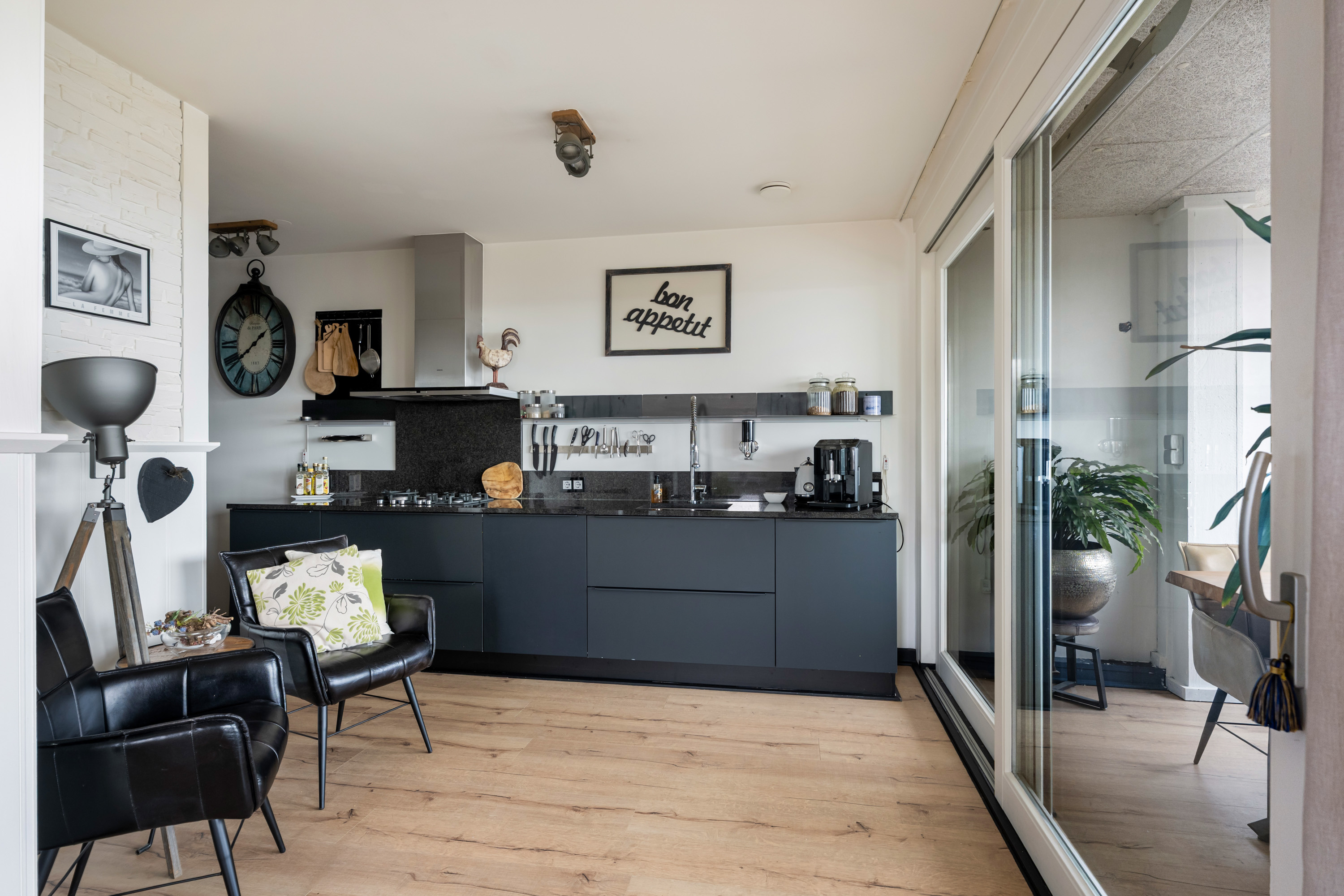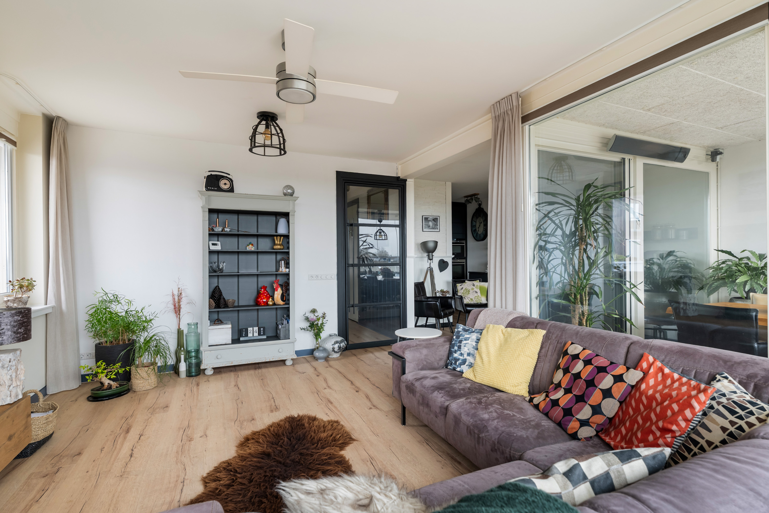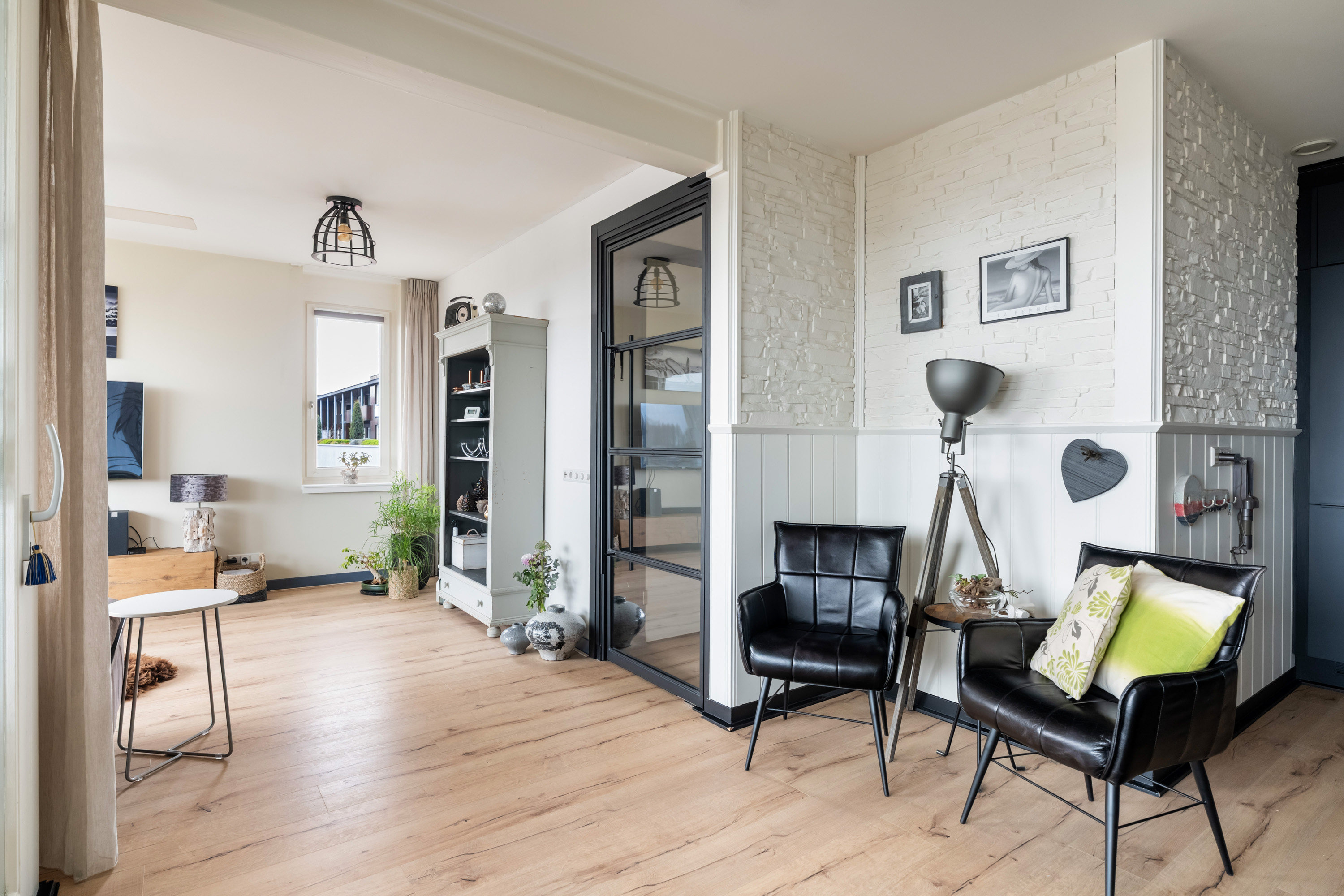2e verdieping: gemeenschappelijke binnentuin, die toegang biedt tot alle privé woningen. Entree, hal met meterkast, garderobe en luxe, hangend toilet en fontein. Heerlijk ruime, lichte woonkamer met aan twee zijden grote ramen en een schuifpui naar de loggia annex eetkamer. Deze loggia is in elk seizoen een feest om te gebruiken! Door de aangebrachte glazen schuifpanelen kun je hier het gehele jaar door heel aangenaam verblijven. Echt een uitbreiding van je woonruimte!