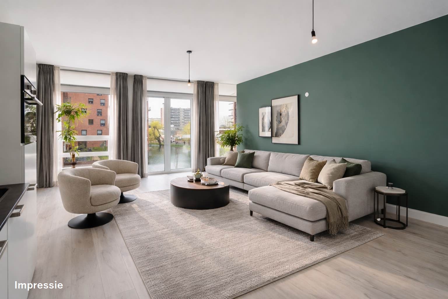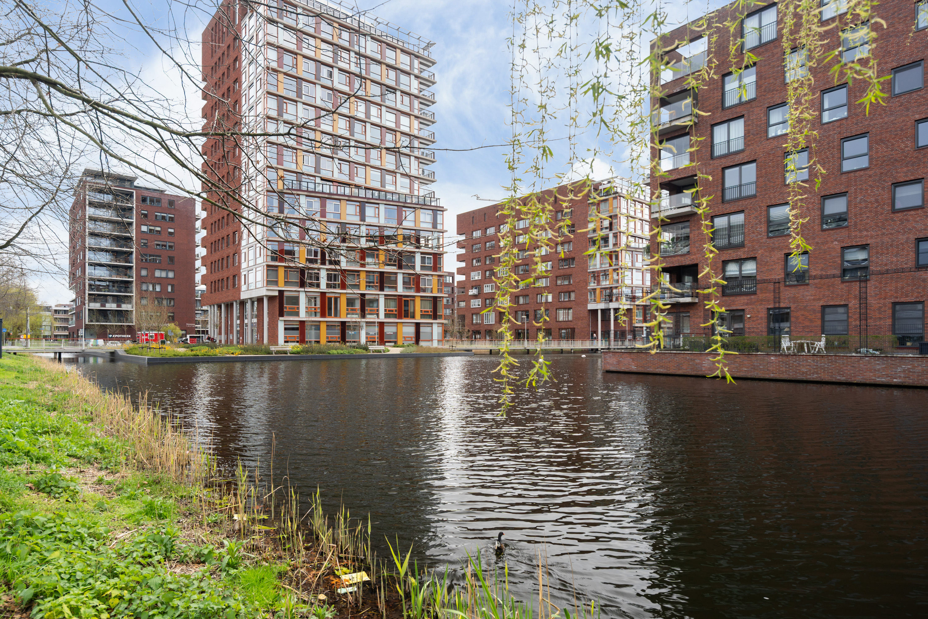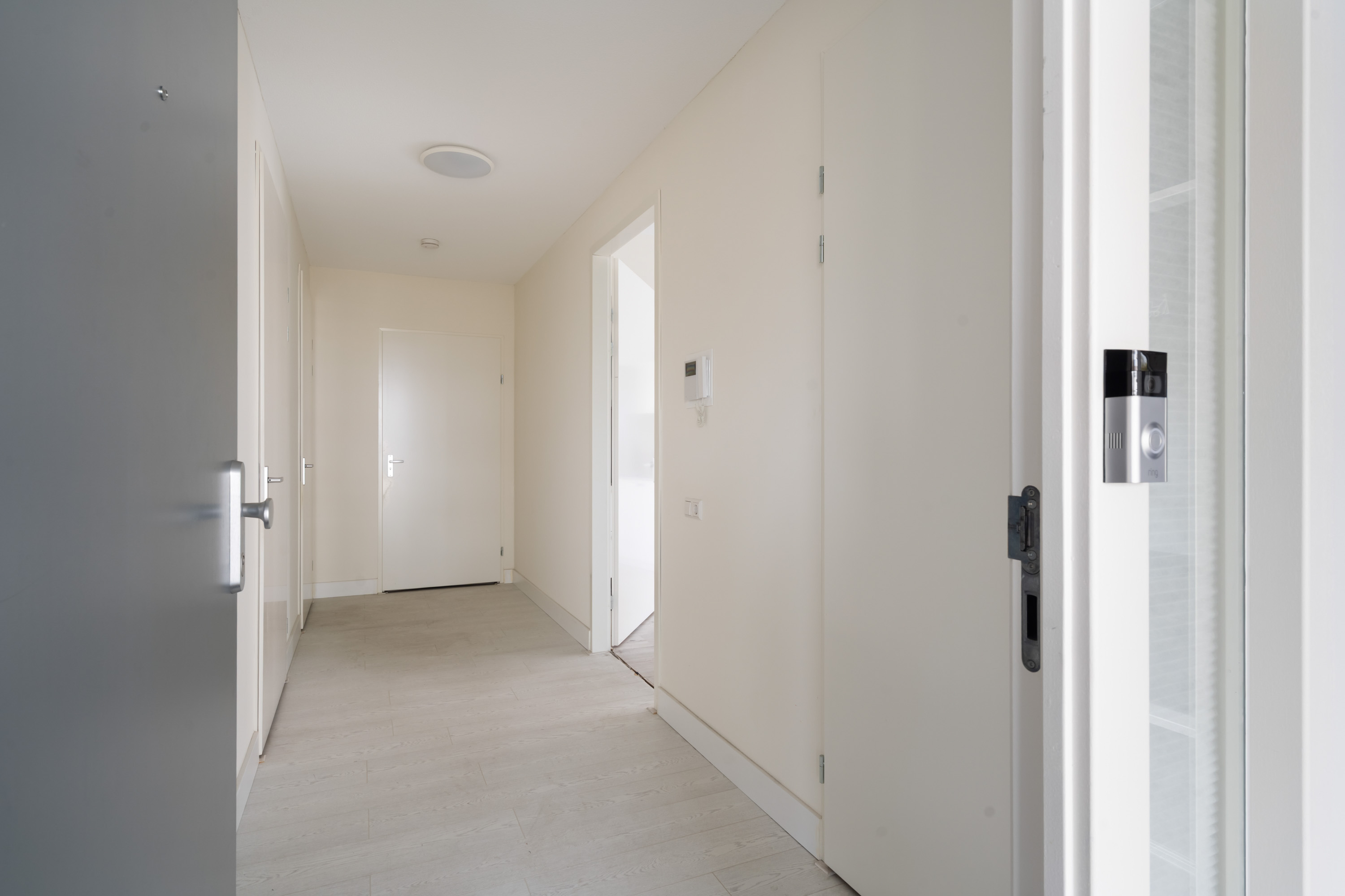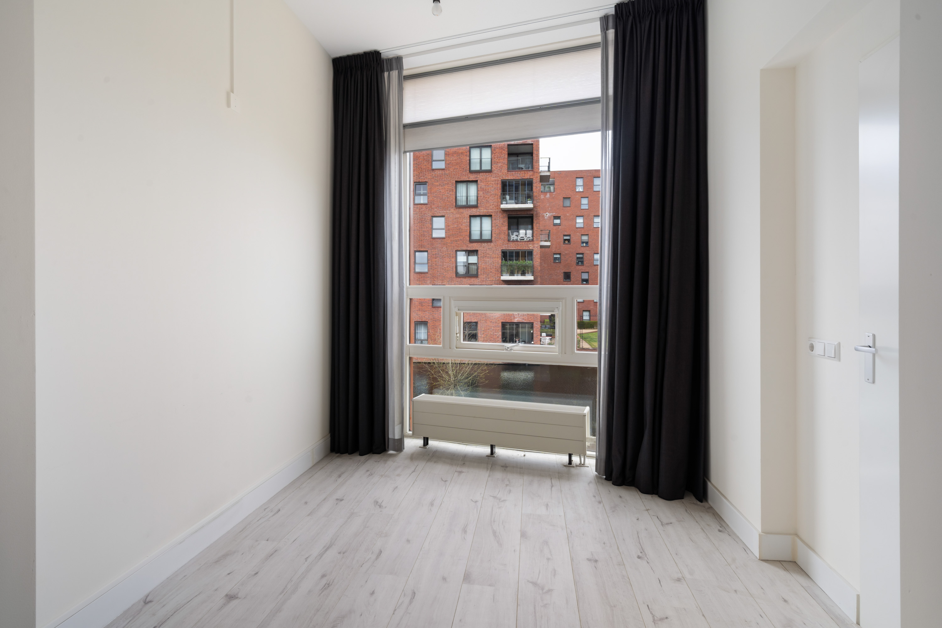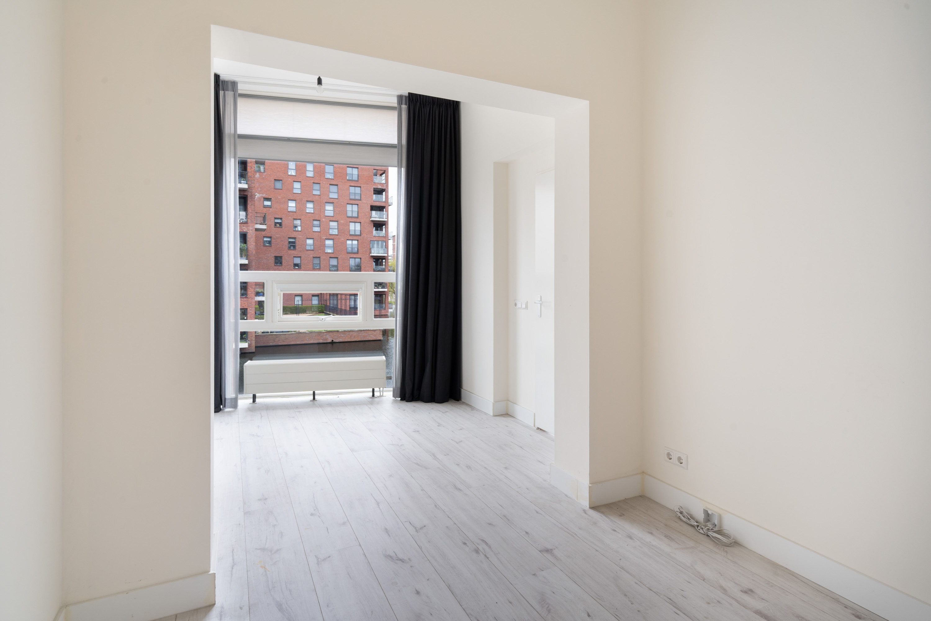 1e verdieping: entree, hal met toiletruimte met hangend toilet en fontein. Grote inpandige berging met wasmachineaansluiting. Heerlijk lichte woonkamer met een Frans balkon. Luxe open keuken (Siematic) in witte uitvoering met veel kastruimte, kunststof blad en voorzien van een inductie kookplaat, circulatiekap, koelkast, combimagnetron, vaatwasser, rvs spoelbak en mengkraan. Slaapkamer grenzend aan de woonkamer. Tweede zeer grote slaapkamer. Moderne, frisse badkamer (witte wandtegels en antraciet vloertegels) met brede wastafel, douche met glasscherm, ligbad en designradiator.